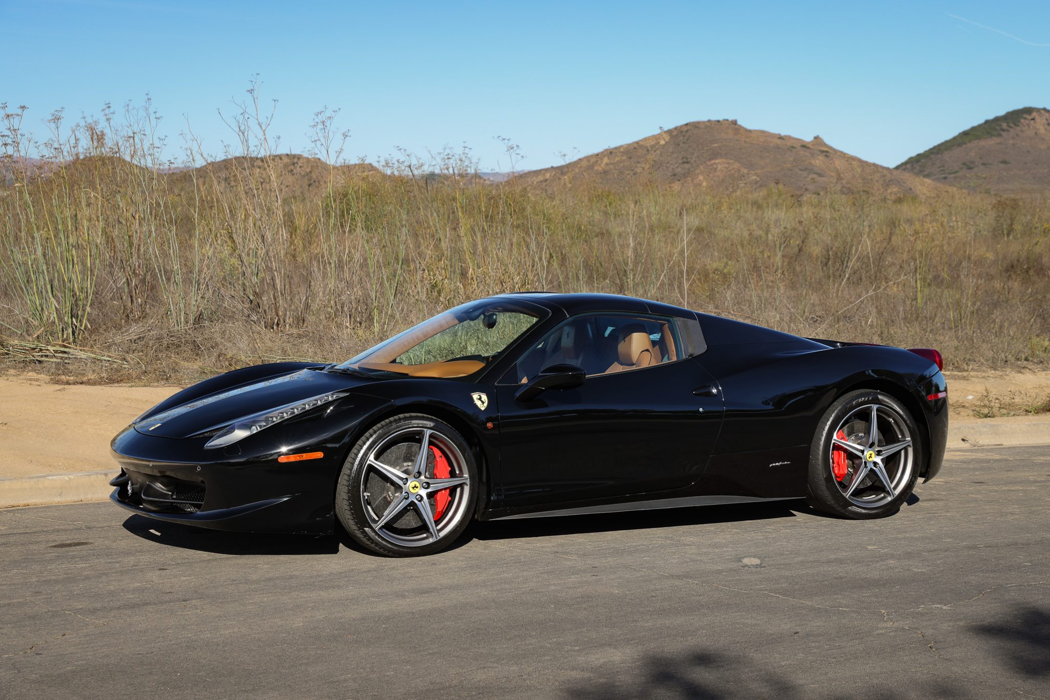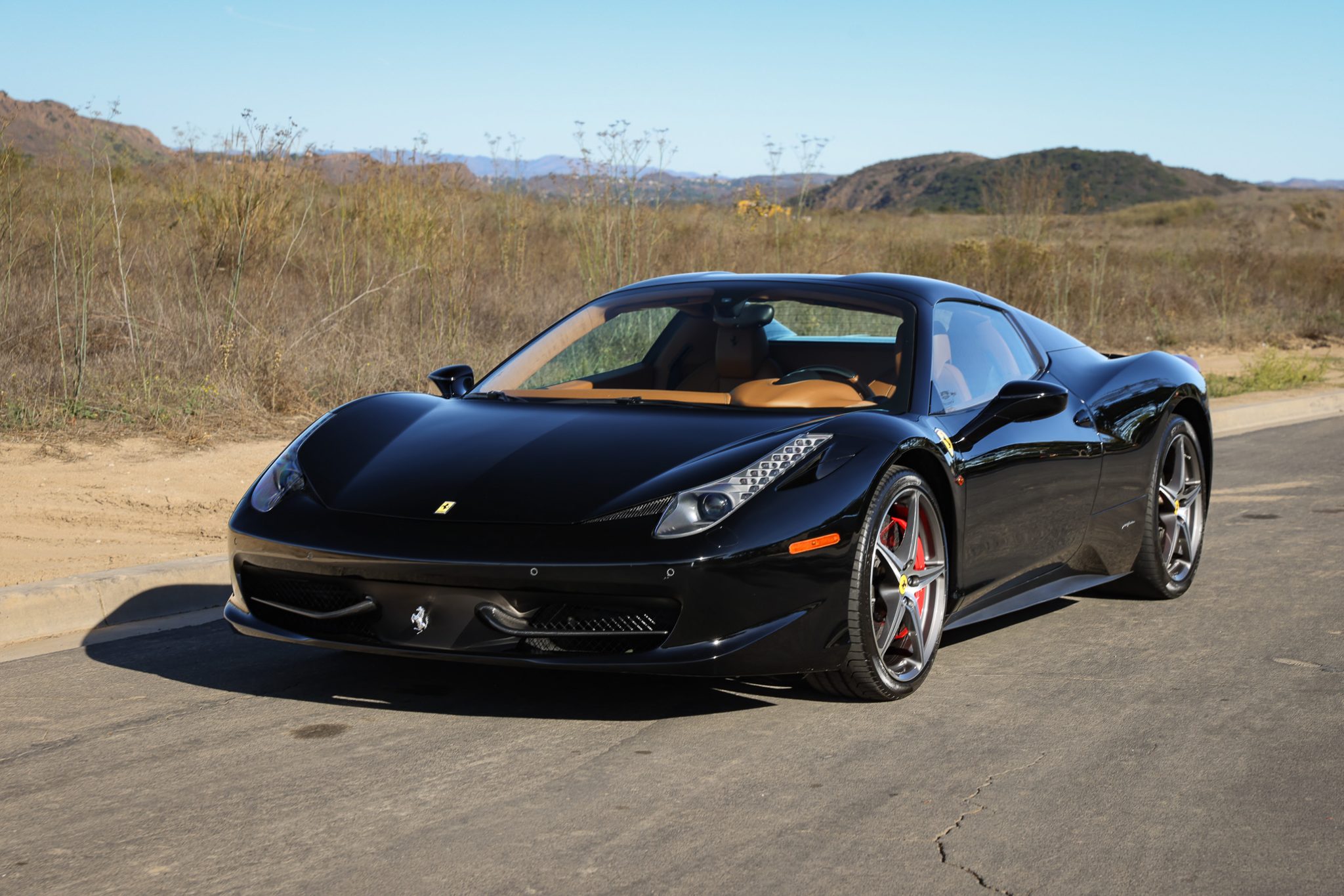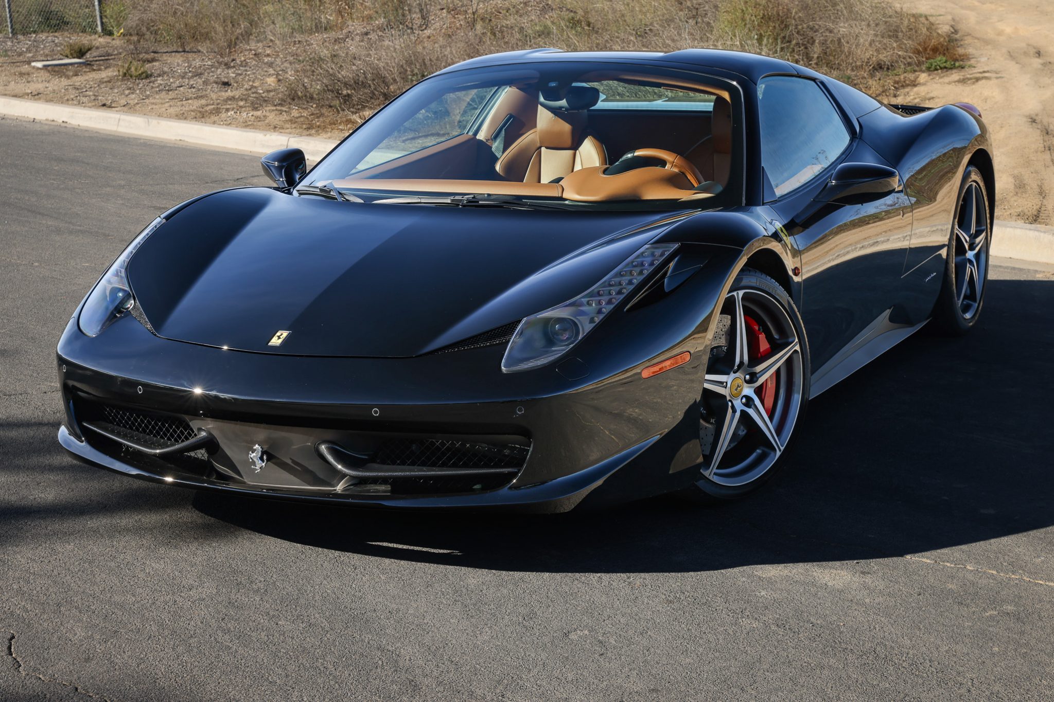 The 20″ five-spoke alloy wheels are mounted with staggered-width mismatched tires. The car is equipped with magnetorheological dampers in addition to a suspension lift system, and braking is handled by red-finished Ferrari calipers over cross-drilled carbon-ceramic rotors at all four corners. Curb damage is present on three wheels.