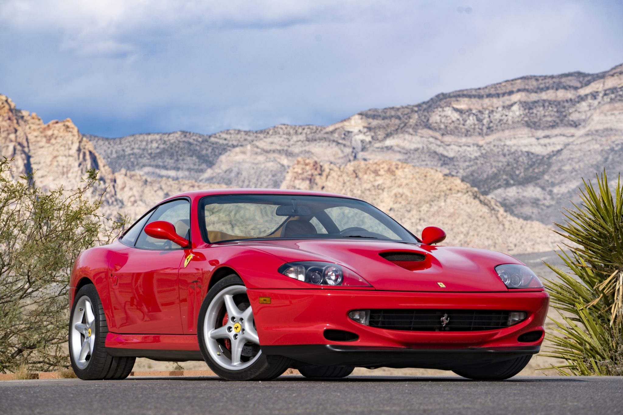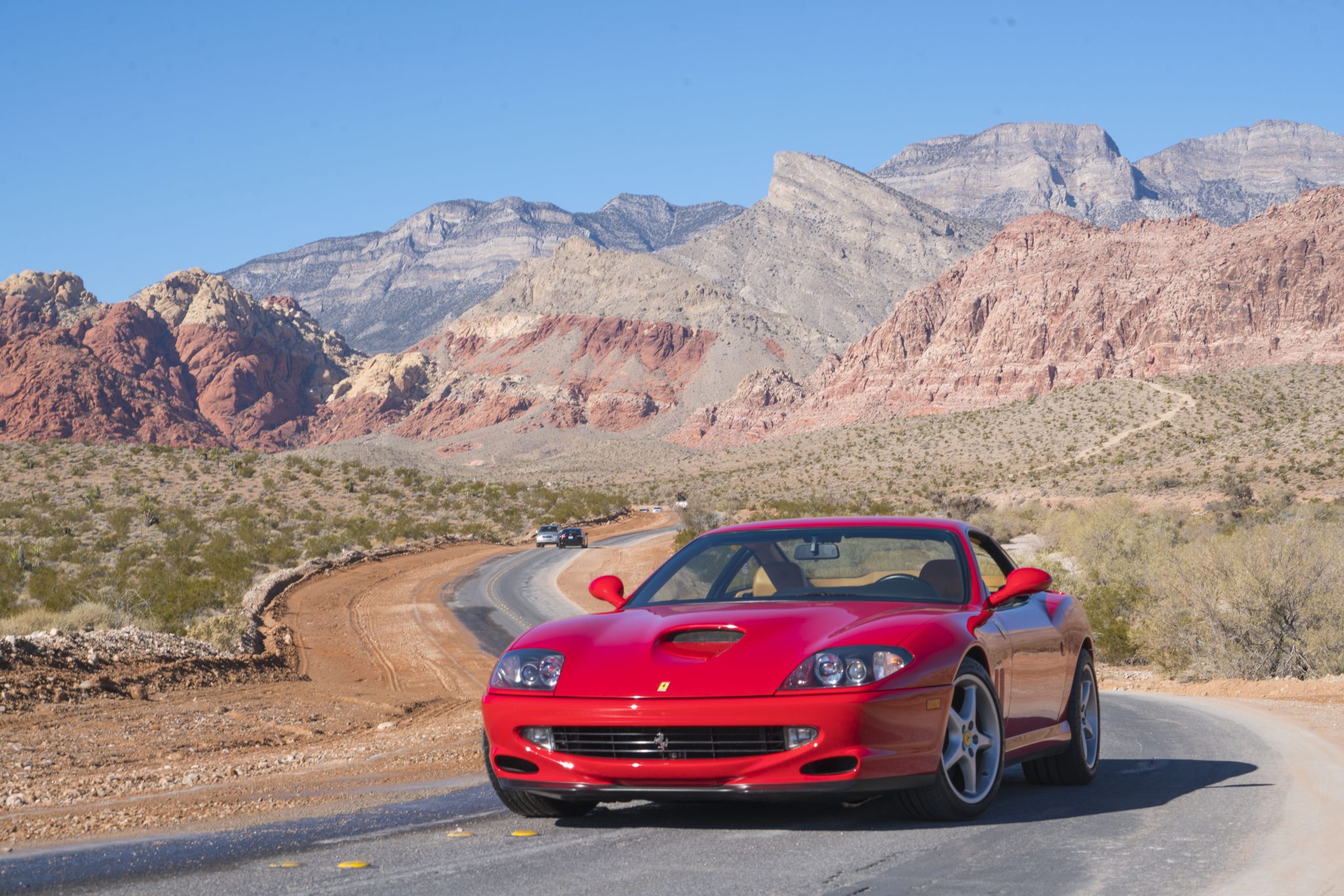 The 18″ five-spoke alloy wheels are mounted with Michelin Pilot Super Sport tires, and the left-front wheel shows an imperfection. Braking is handled by red-finished Ferrari-branded calipers over cross-drilled and ventilated rotors at all four corners.