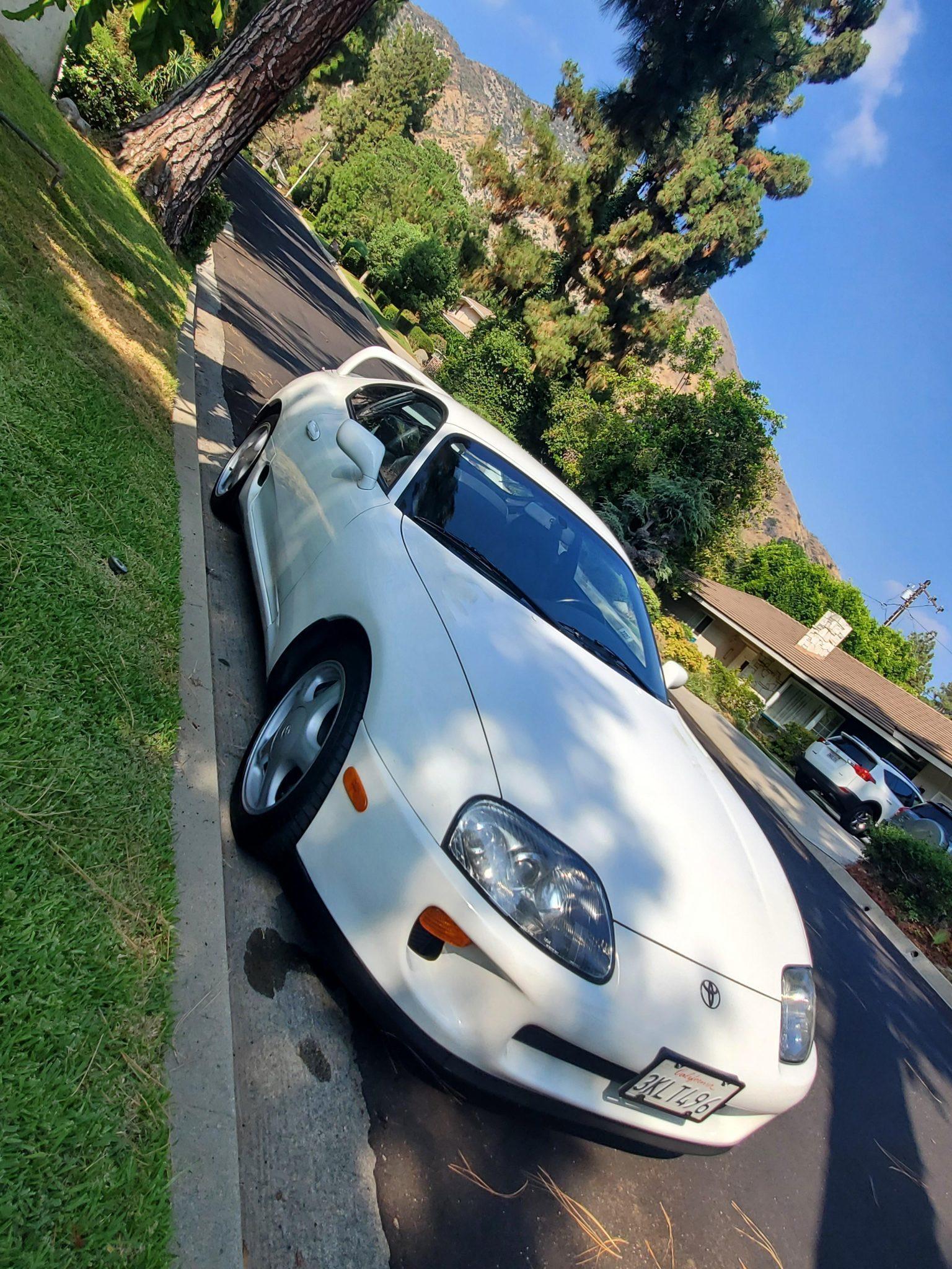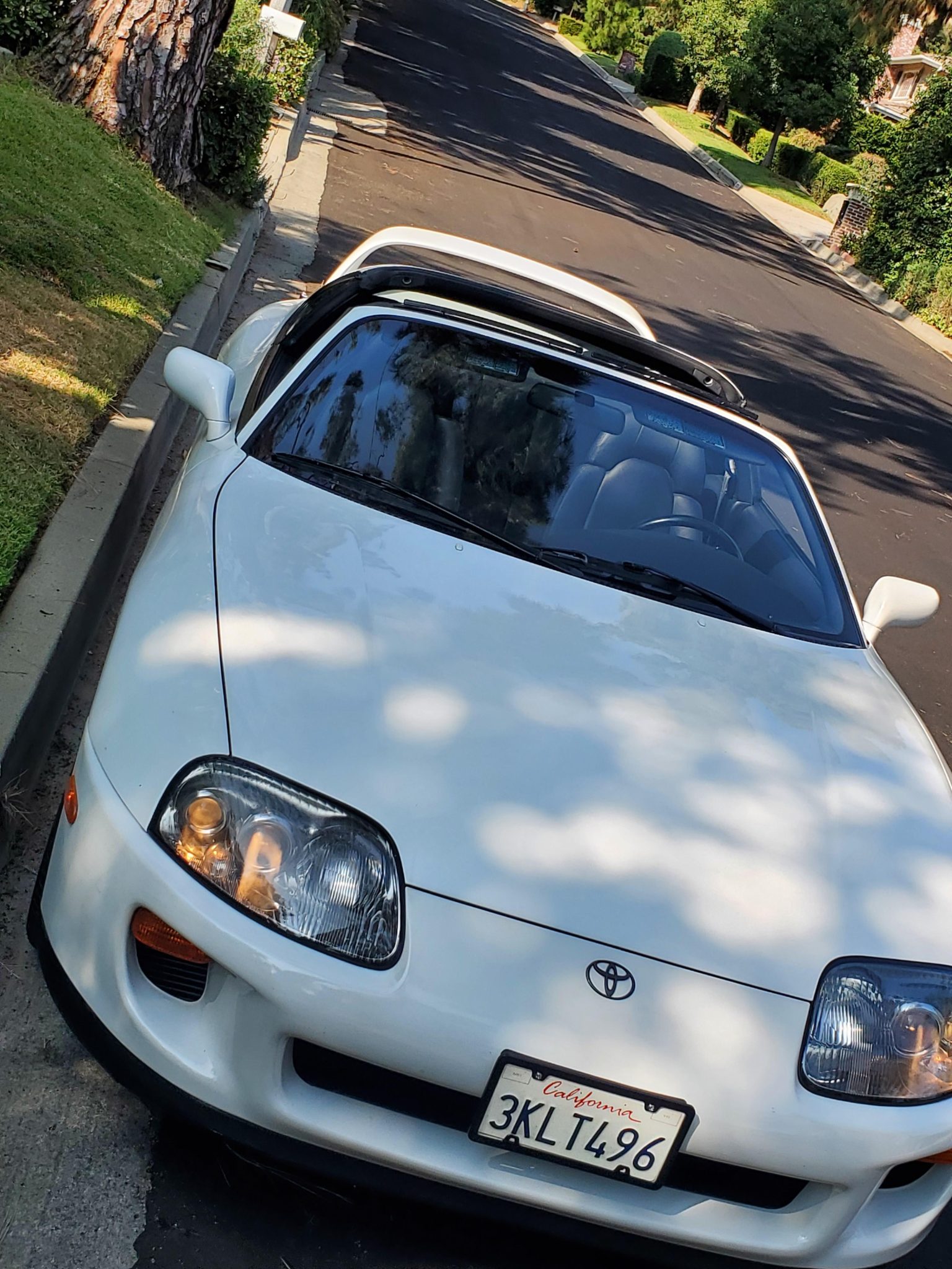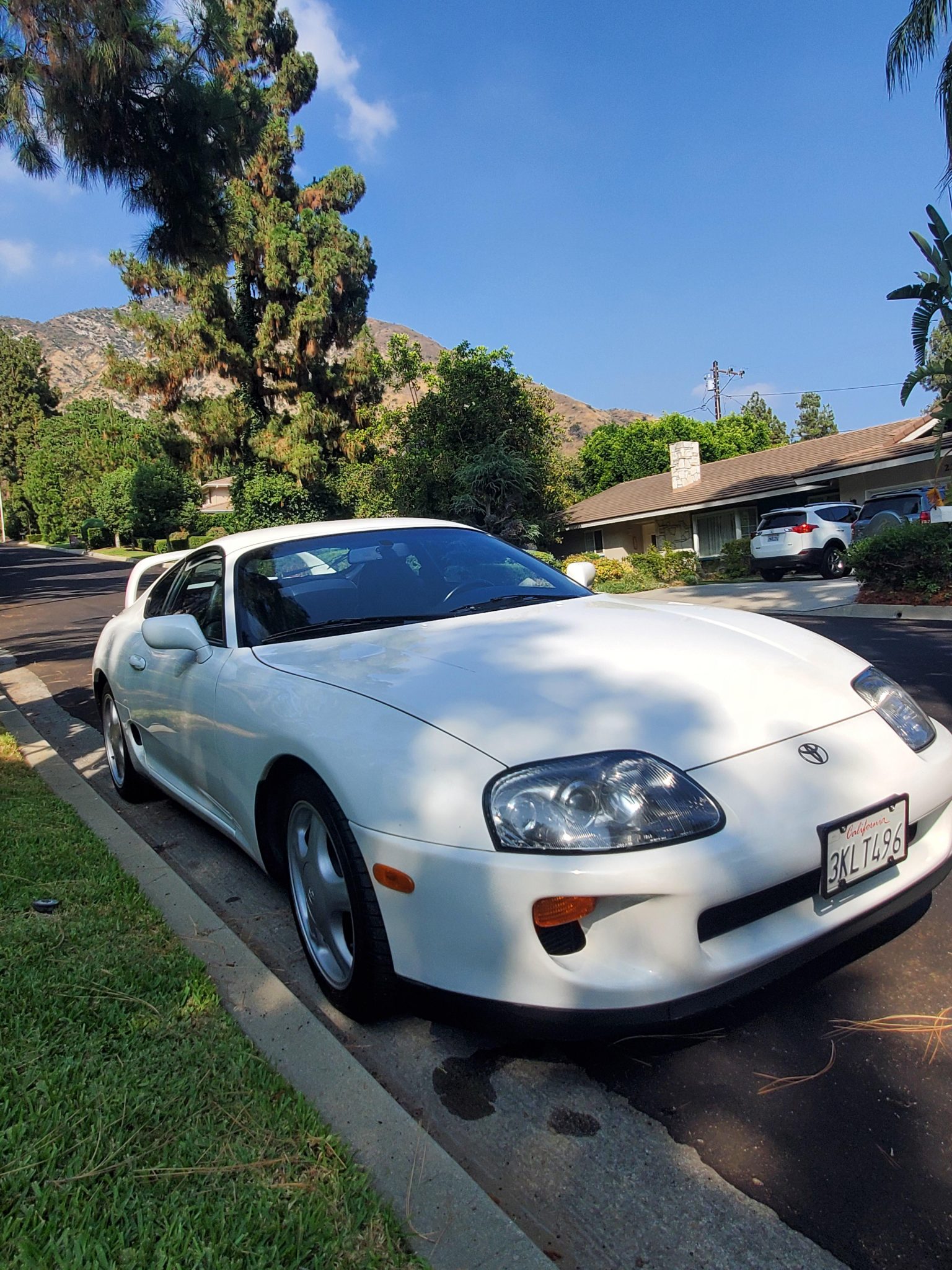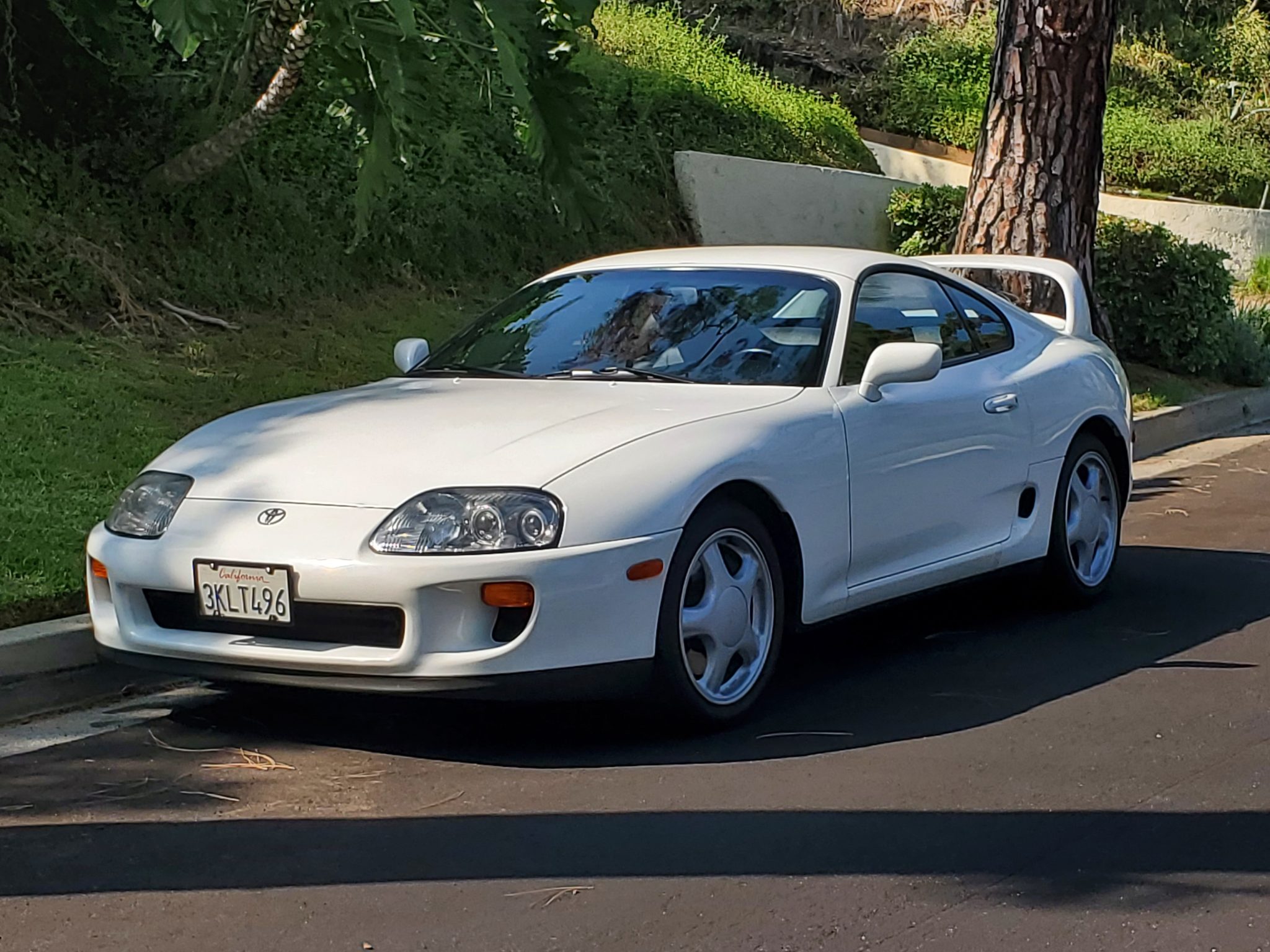 Silver 17″ five-spoke wheels show curb marks and are mounted with Sumitomo tires. The car rides on a four-wheel double-wishbone suspension system and features speed-sensing progressive power rack-and-pinion steering and electronic traction control. Anti-lock braking is provided by Supra-logo calipers over ventilated discs at each corner.