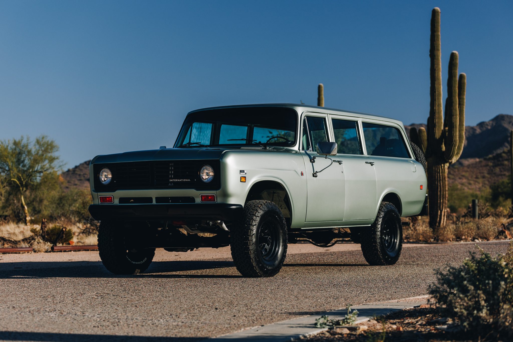 Black-finished 16″ Rough Country steel wheels are mounted with 285/75 BFGoodrich All-Terrain T/A KO2 tires, and a matching spare is stored out back. The truck is equipped with power steering as well as manually locking front hubs and has been fitted with an IH Parts America 2.5″ lift kit featuring Bilstein shocks. Braking is handled by four-wheel discs that are complemented by a hydro-boost brake booster and braided stainless-steel hoses.