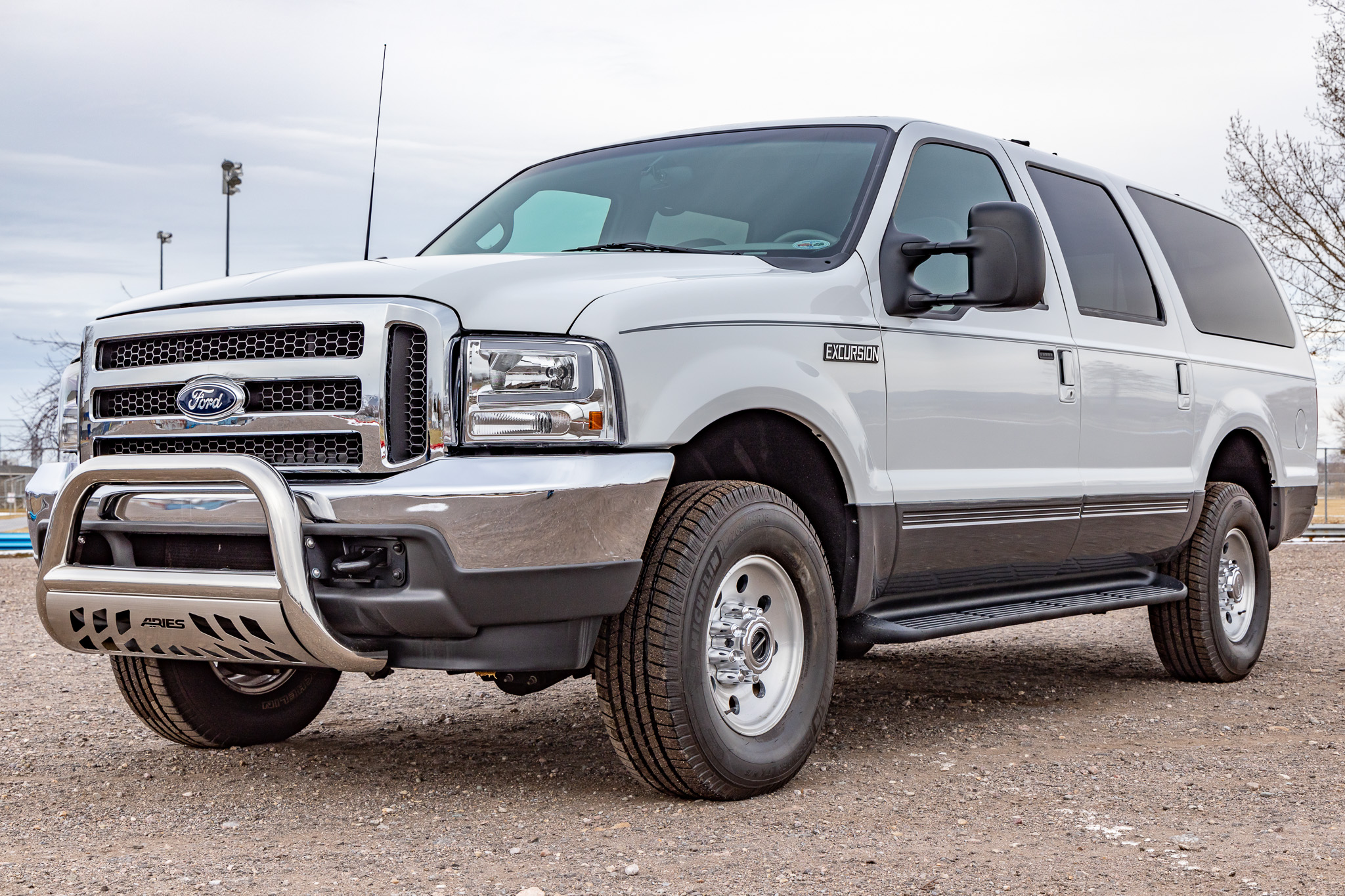 Polished 16″ eight-hole alloy wheels are mounted with 265/75 Michelin Defender LTX tires. Braking is handled by four-wheel ventilated discs, and the truck is equipped with manually locking front hubs.