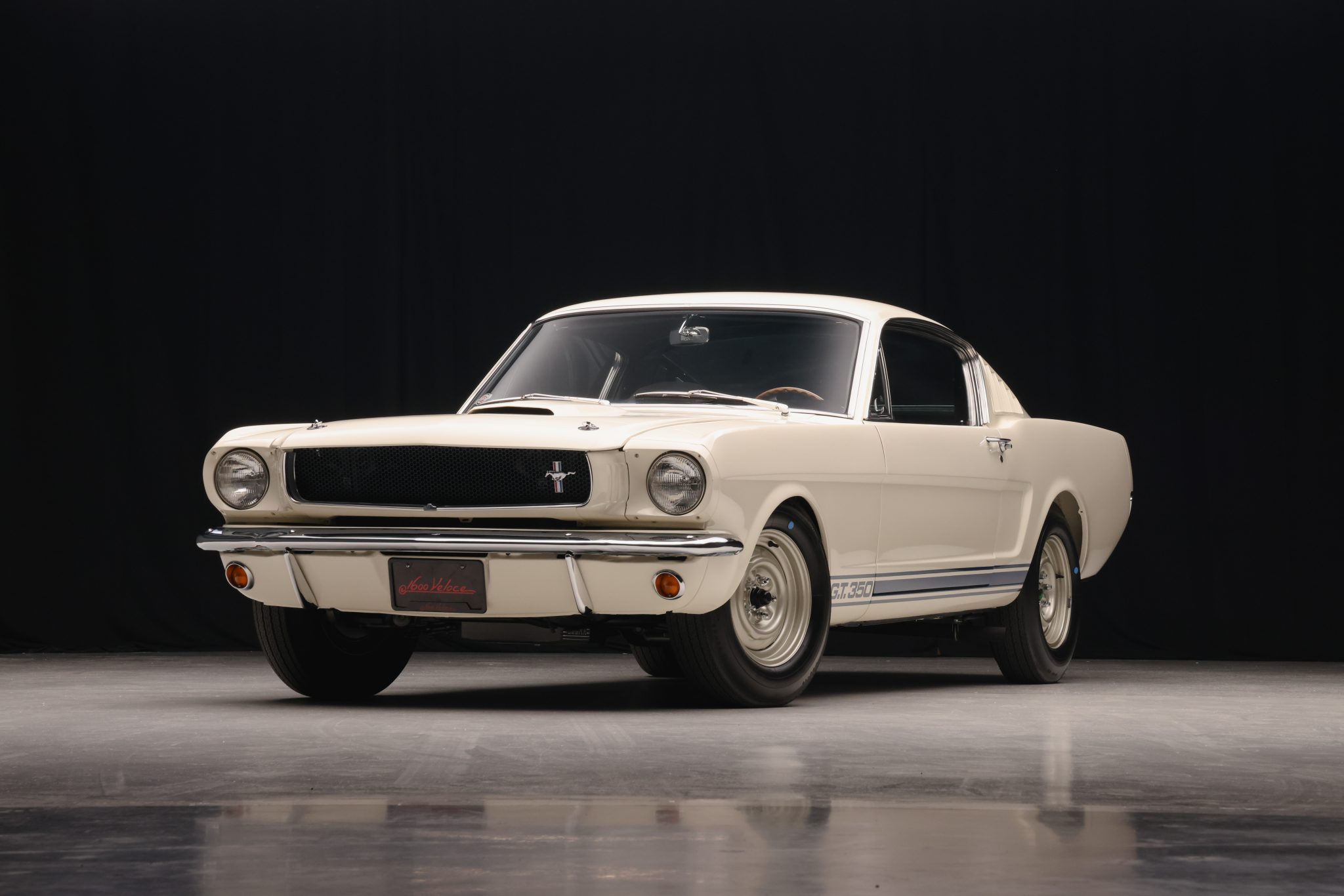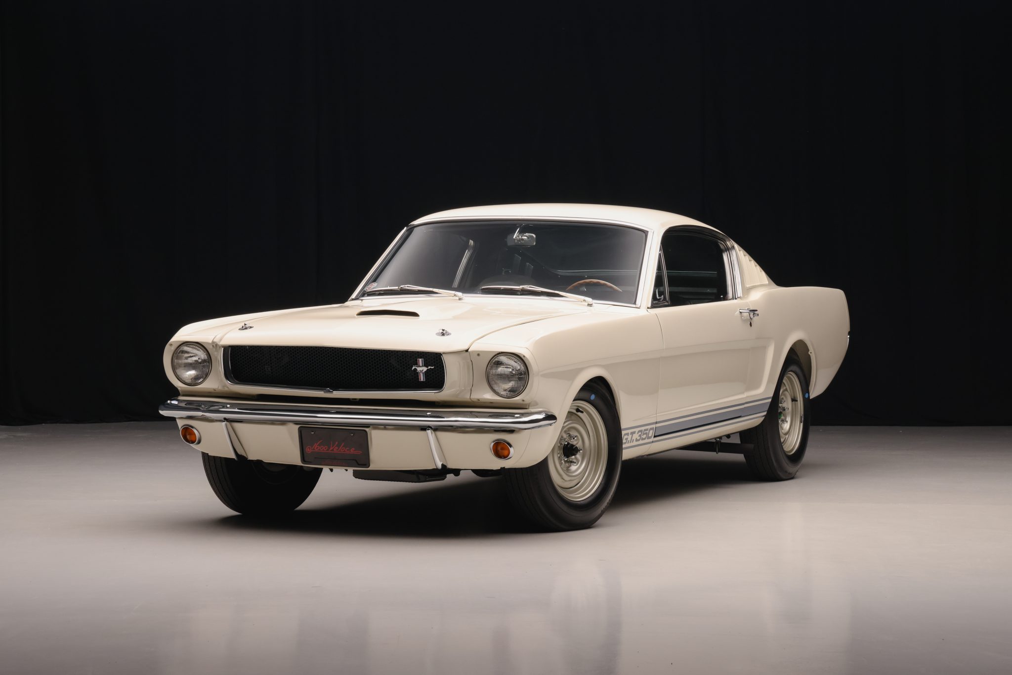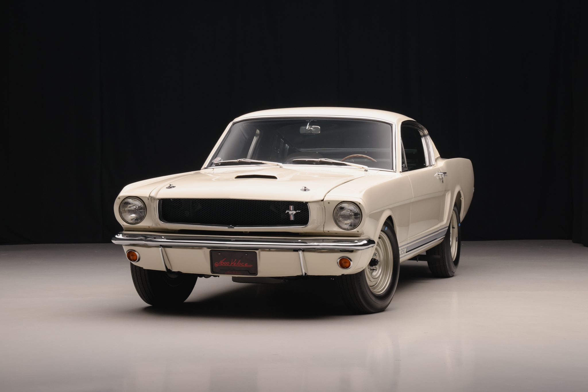 All 1965 GT350s were finished in Wimbledon White with Guardsman Blue rocker-panel stripes, and this example has been repainted without the blue Le Mans stripes that were optional for the model when new. Additional work during the project included replacement of the glass and body seals and re-chroming of the rear bumper. Features include a fiberglass hood with a functional scoop and quick-release pins, a mesh grille with an offset running-horse logo, and sail-panel louvers.