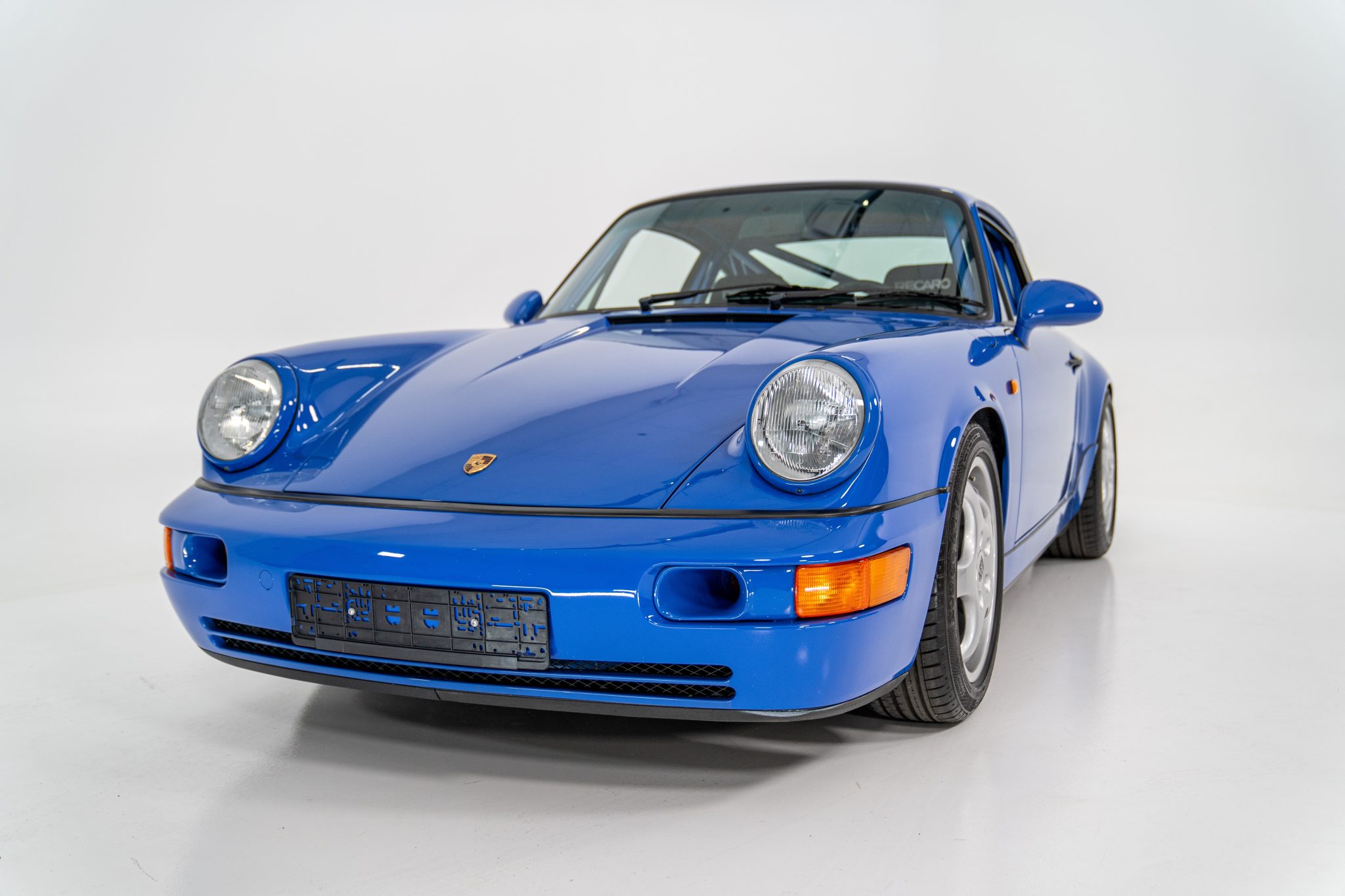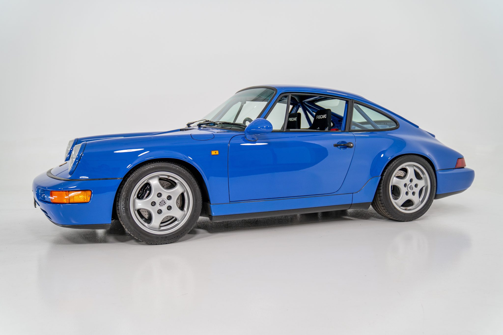 Magnesium 17″ Cup wheels are mounted with 205/50 front 255/40 rear Continental Sport Contact 2 tires. The Carrera RS’s ride height is lower than that of a standard 964, and it also features stiffer springs and adjustable anti-sway bars. Stopping power is provided by an anti-lock system featuring four-piston calipers over cross-drilled rotors at all four corners.
