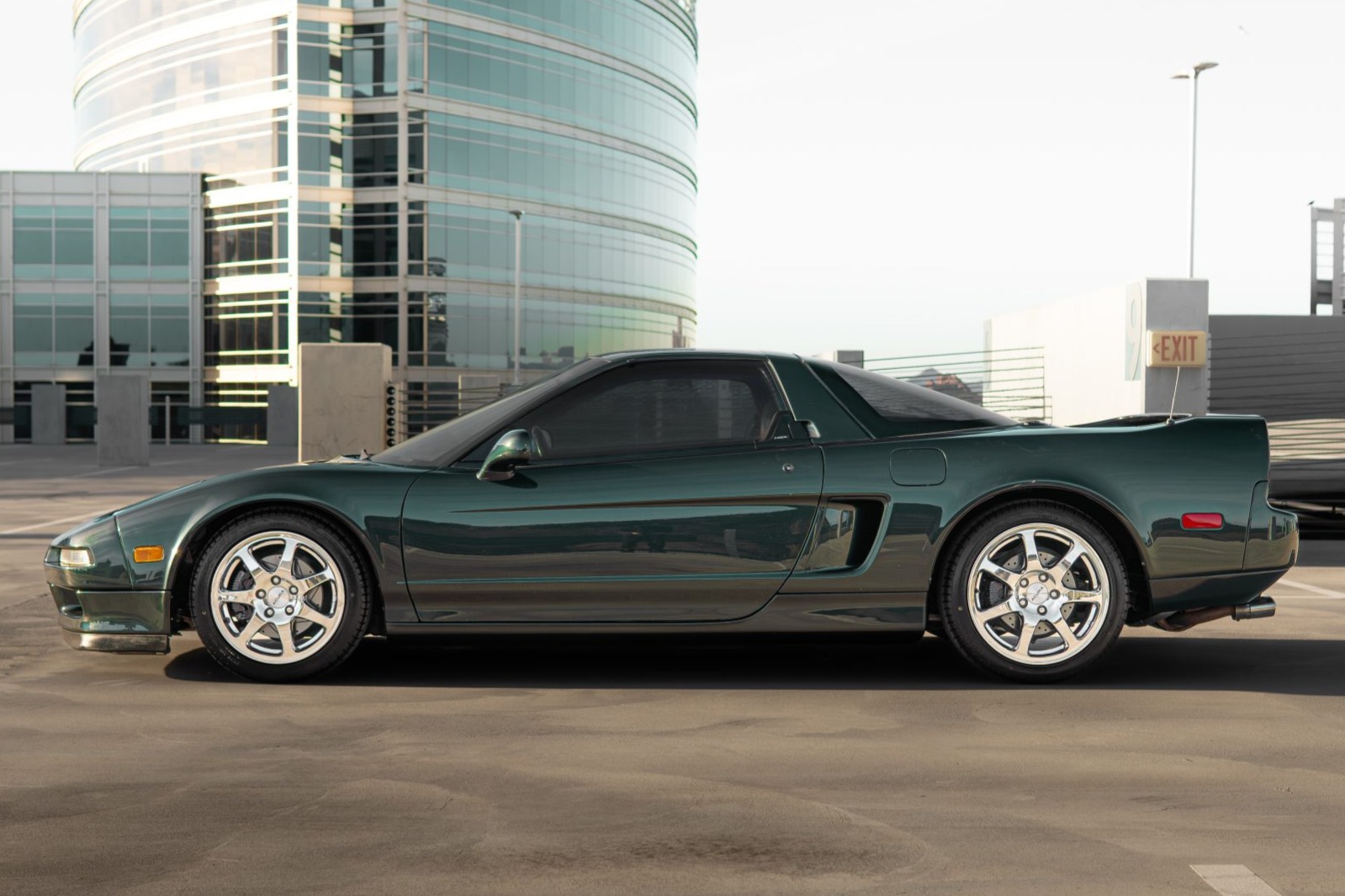 Staggered-diameter 16” and 17” seven-spoke aluminum wheels are mounted with 215/45 front and 245/40 rear Accelera tires showing 2023 date codes. Braking is handled by NSX-branded calipers over cross-drilled rotors at each corner, and the car is equipped with BC Racing coilovers, Zanardi-style sway bars, a carbon-fiber rear brace, and front compliance clamps. Replacement rear brake pads were fitted in November 2023.