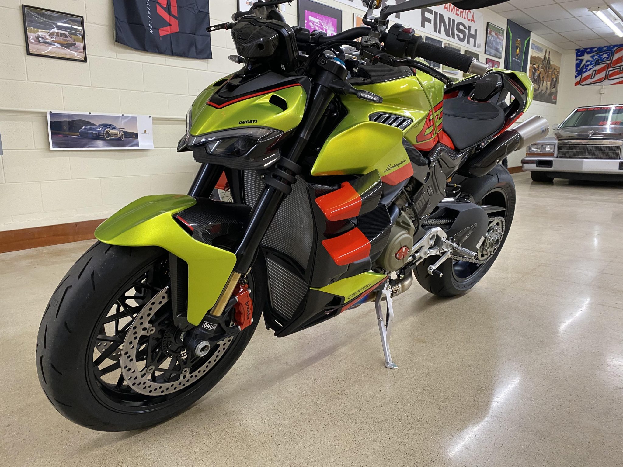 STO-inspired 17″ cross-spoke alloy wheels, the rear of which is retained by a titanium lock nut, are finished in black and mounted with Pirelli Diablo Rosso IV Corsa tires. Semi-active adjustable suspension is provided by an Öhlins NIX-30 fork, an Öhlins TTX36 monoshock mounted to the single-sided aluminum swingarm, and an Öhlins steering damper controlled by the second generation Öhlins Smart EC 2.0 system with an event-based operating system. Braking is handled by Brembo Stylema R four-piston monobloc calipers over dual 330mm drilled discs up front and a two-piston Brembo caliper over a single 245mm drilled disc out back, and the bike is equipped with Cornering ABS EVO.