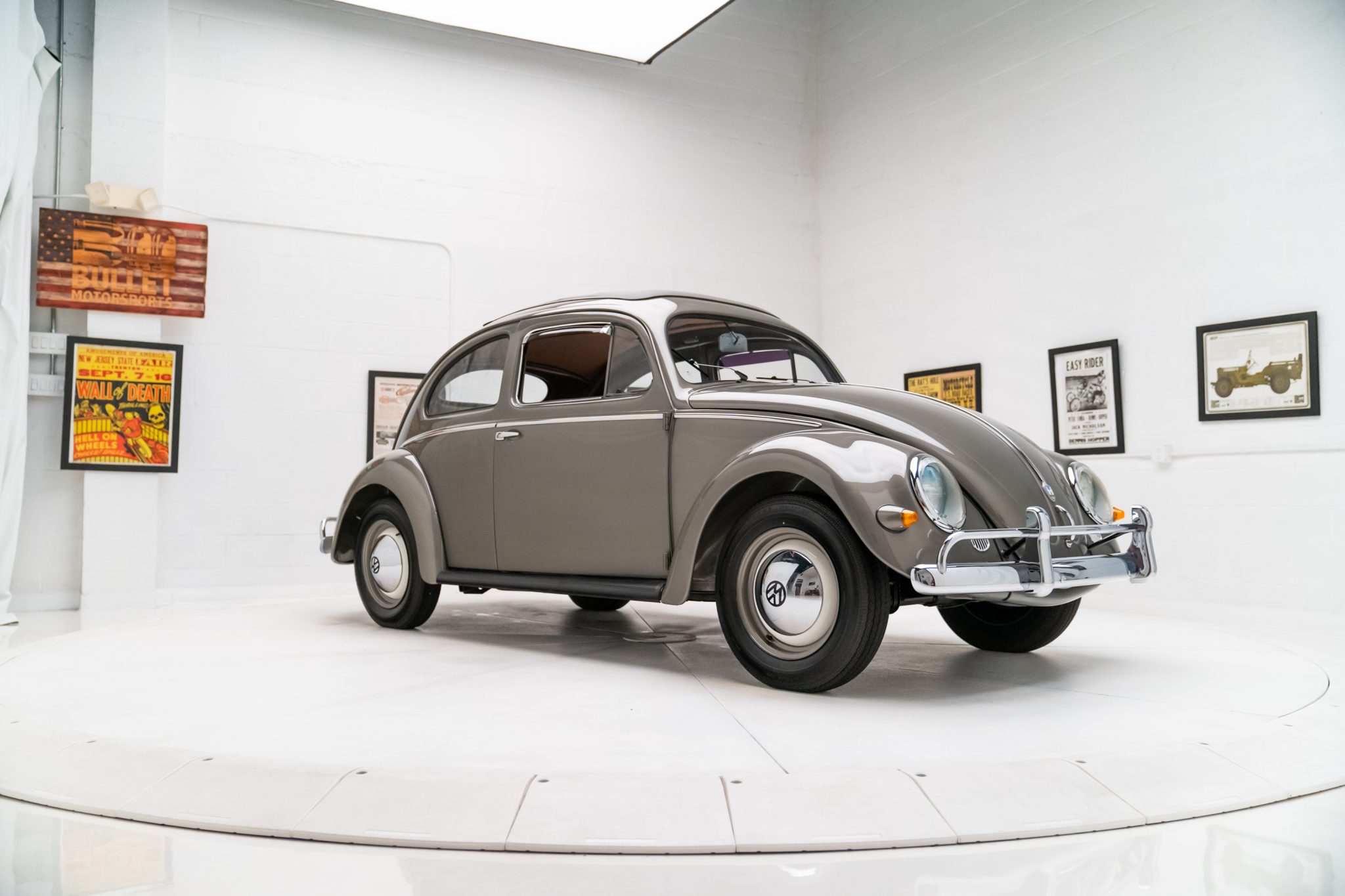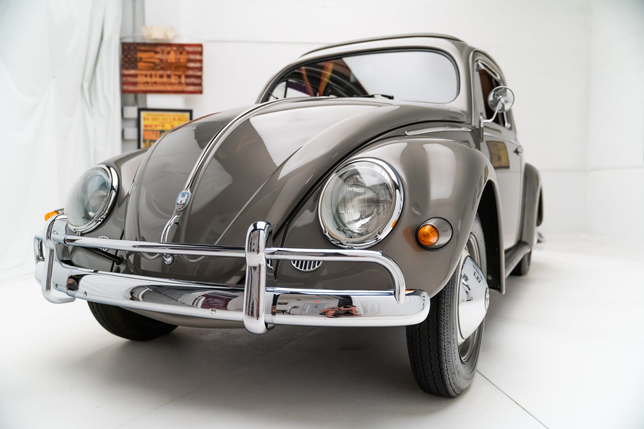 Steel 15″ steel wheels are finished in white with body-color lips and wear chrome VW-stamped hubcaps, and they are mounted with 5.60-15 Funsa bias-ply tires. A matching spare is stored in the front trunk. Stopping power is provided by hydraulically-actuated four-wheel drum brakes.