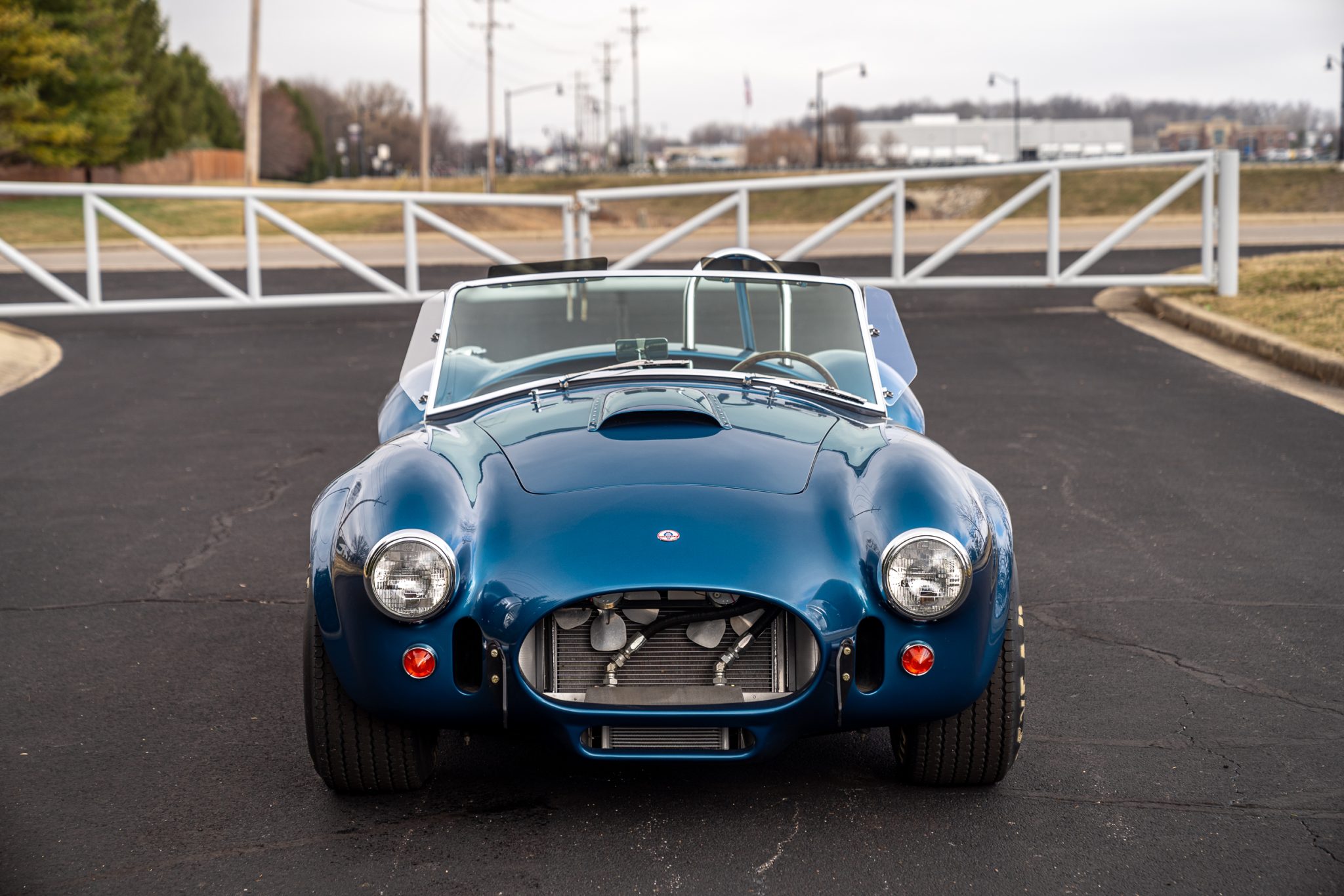 This example is finished in metallic blue and equipped with a single roll hoop, a hood scoop, and black-finished bumperettes and side pipes.