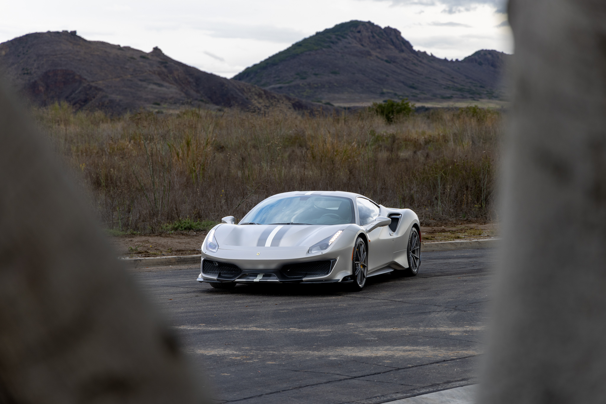 The 20″ 10-spoke alloy wheels are mounted with Michelin Pilot Sport Cup 2 R tires measuring 245/35 up front and 305/30 out back. The right-rear wheel has blemishes. The car is equipped with an SCM-E magnetorheological suspension control system as well as a front-axle lift system. Braking is provided by yellow-finished multi-piston calipers over ceramic-composite discs at each corner.
