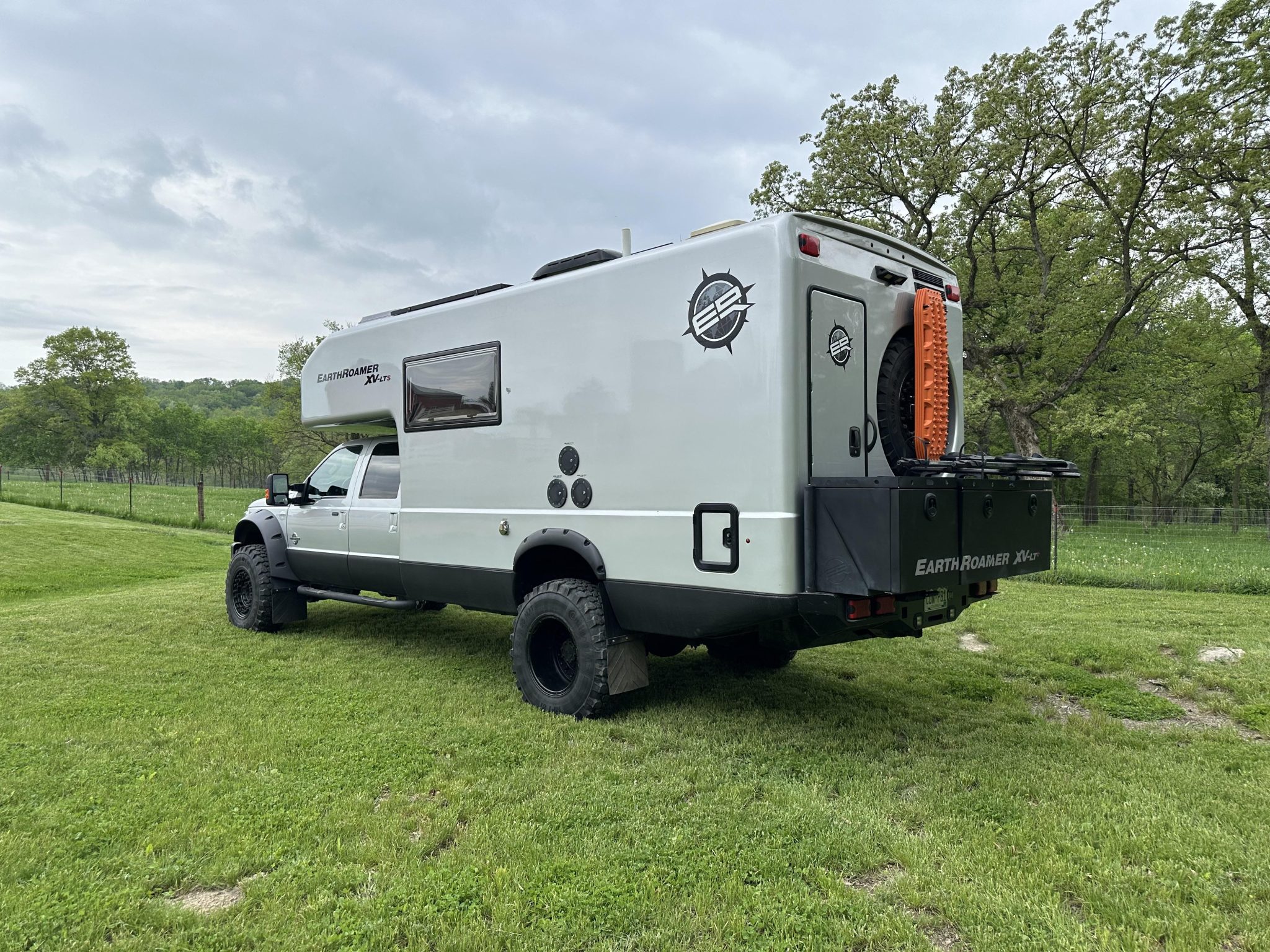 Black-finished Hutchinson 20″ beadlock wheels are mounted with 335/80 Continental MPT 81 tires that were installed in 2021, and a spare is secured to the rear panel. The truck is equipped with manually locking front hubs, a Kelderman air suspension system, and an onboard air compressor with four remote outlets. Service in 2021 included replacing the right-rear wheel assembly and repairing the left-rear air-suspension fittings, while the right-front wheel was repaired in 2023 and the air suspension control module was replaced at that time.