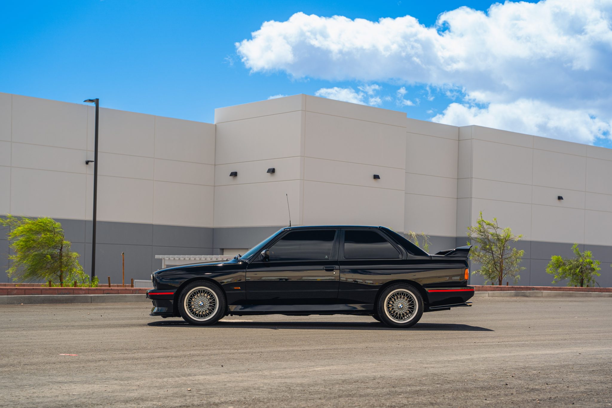 This example is finished in Jet Black and features a multi-position front splitter, brake ducts in place of fog lights, thinner glass, a sunroof, headlight washers, an adjustable rear spoiler, red bumper accents, and high-arch front fenders designed to clear 18″ wheels for racing. Several body panels are noted to have been repainted, and paint meter readings are viewable in the gallery below. The hood and front fascia show stone chips, and rust is present at the left-front corner of the windshield. The spoiler and windshield were replaced under prior ownership.