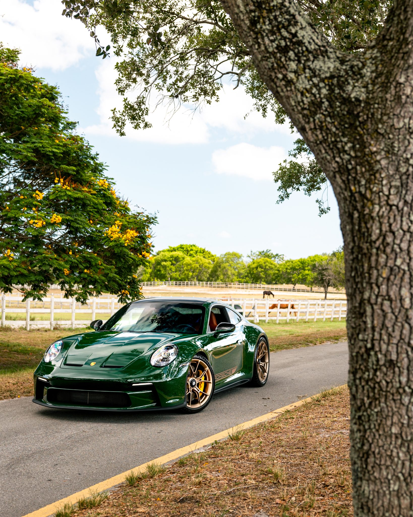 Satin Neodyme-finished 20″ and 21″ GT3 center-lock wheels are mounted with staggered-width Michelin Pilot Sport Cup 2 tires. Stopping power is provided by Porsche Ceramic Composite Brakes (PCCB) with yellow calipers over cross-drilled and ventilated discs at each corner. The car is equipped with a front-axle lift system and rear-axle steering.