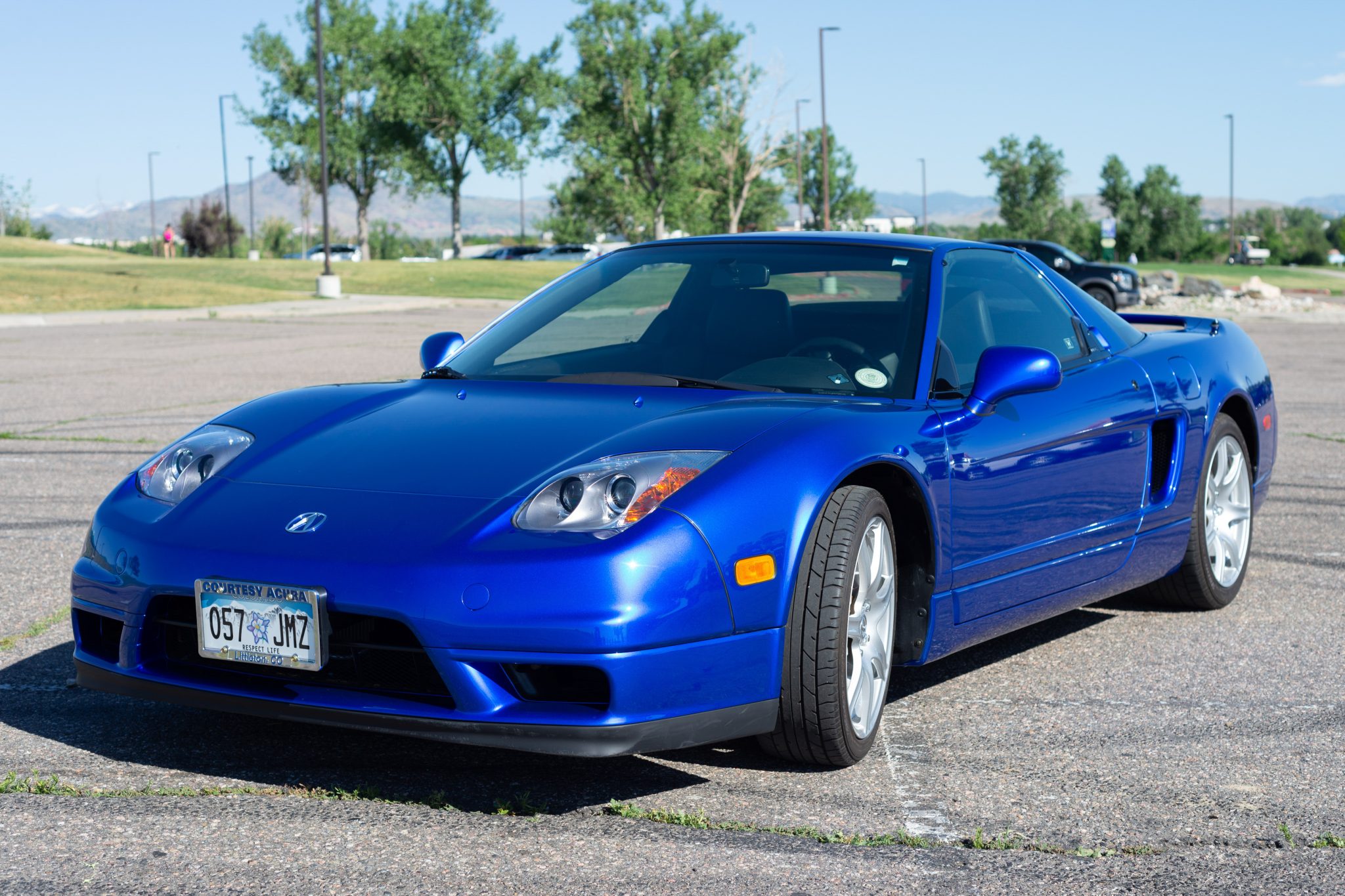 The 17″ forged wheels are mounted with older 215/40 front and 255/40 rear Bridgestone Potenza tires. The car features a four-wheel double-wishbone suspension with front and rear stabilizer bars, and braking is handled by NSX-branded calipers over vented rotors at each corner.