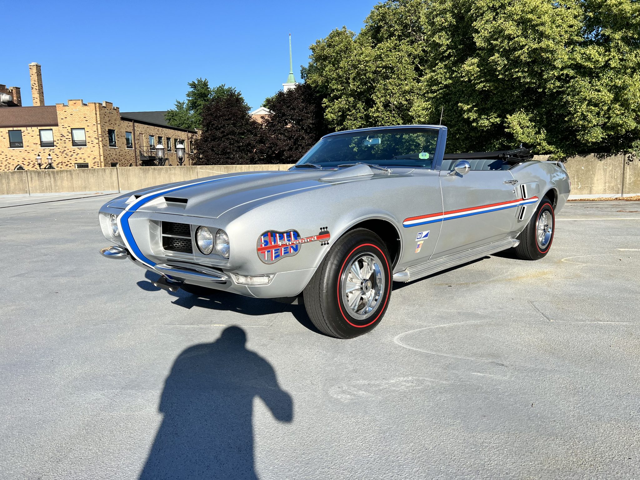 Silver 14″ wheels wear Hurst center caps and reproduction FR70-series Firestone Super Sports Wide Oval redline tires that show 2023 production date codes. The car is equipped with power steering, and braking is handled by power-assisted front discs and rear drums. The rear leaf springs and front coil springs were replaced under current ownership, and a Hotchkis cross-brace support and subframe connectors were installed at that time.