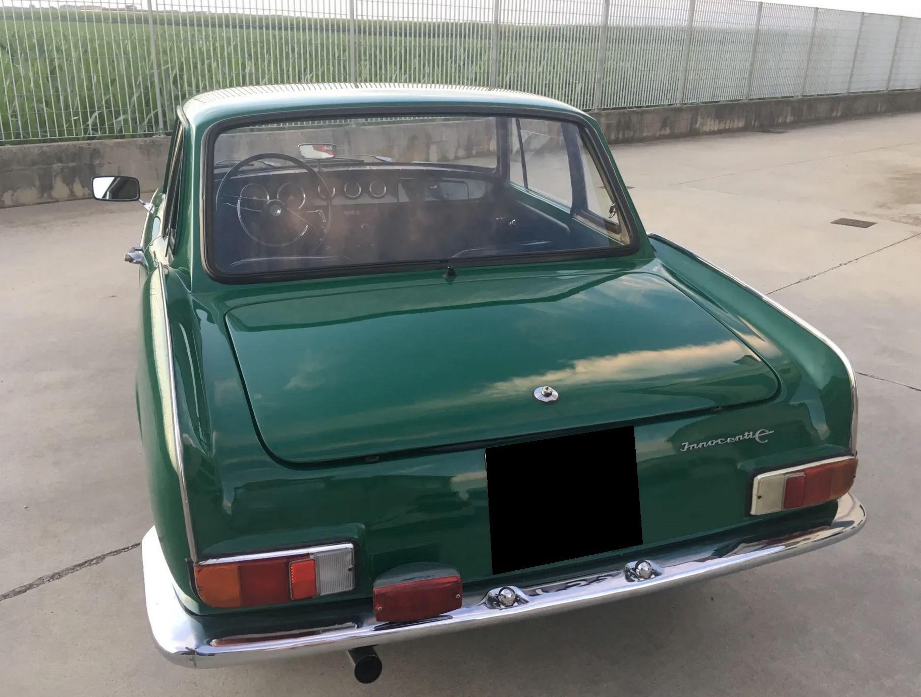 Silver-painted 13” steel wheels wear Innocenti covers and come wrapped in Michelin tires. The BMC-based brake system consists of Lockheed discs up front and drums in the rear. Suspension components are also borrowed from the Sprite and include coil springs and control arms up front with a solid axle and leaf springs in the rear. Period Italian license plates remain affixed to the car.