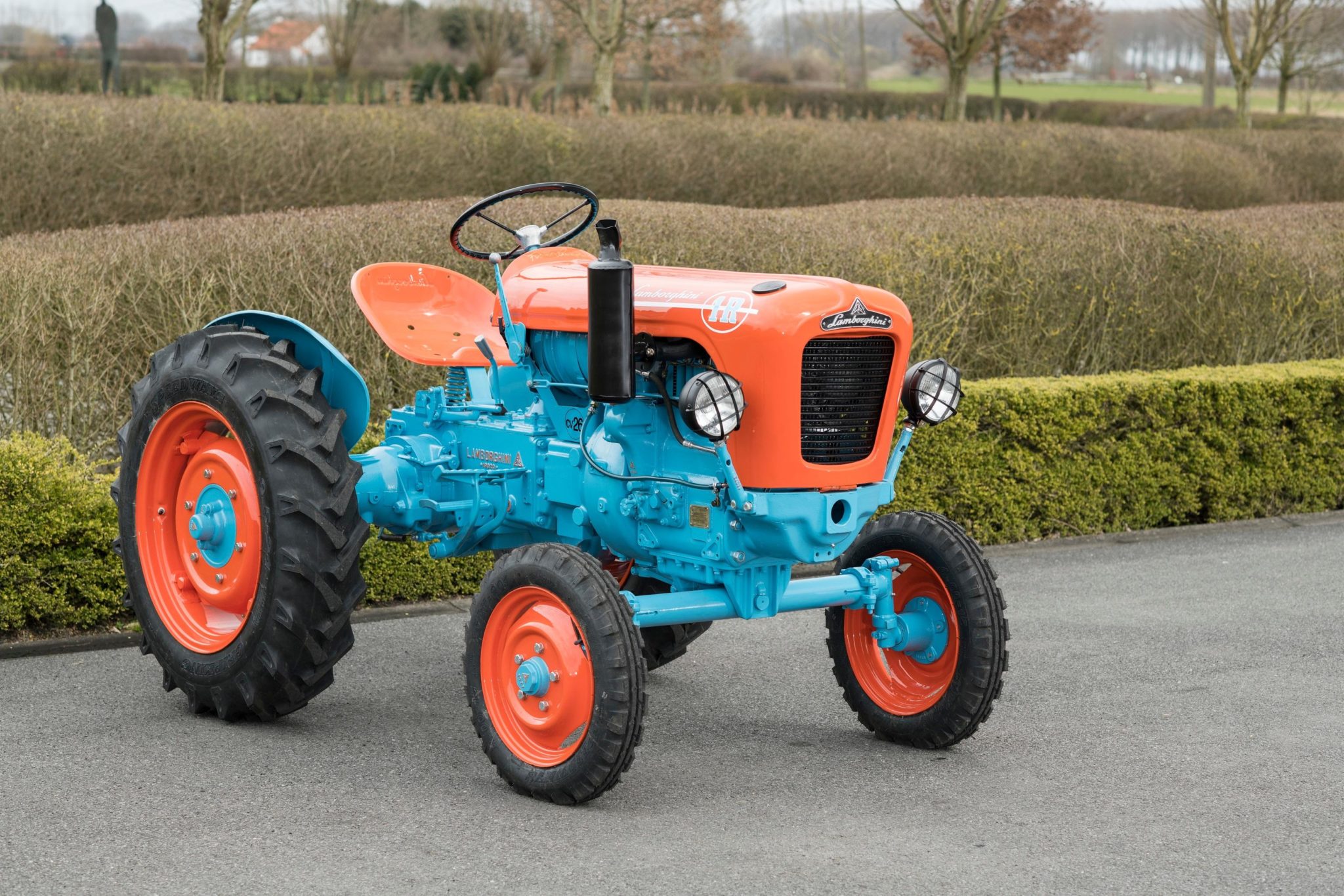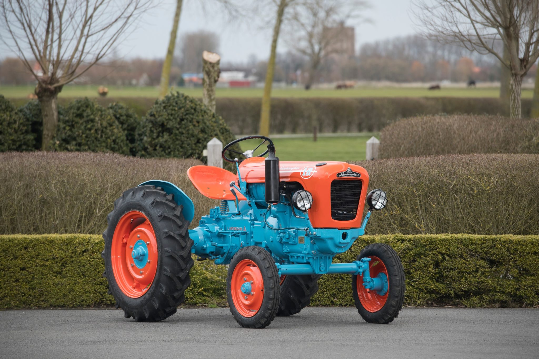 The five-bolt front and six-bolt rear steel wheels have been refinished in Lamborghini orange and are mounted with Grip King agricultural tires. The rear pair measure 9.5-24 and the fronts measure 5.00-15. The tractor is equipped dual rear power-take-off outputs.