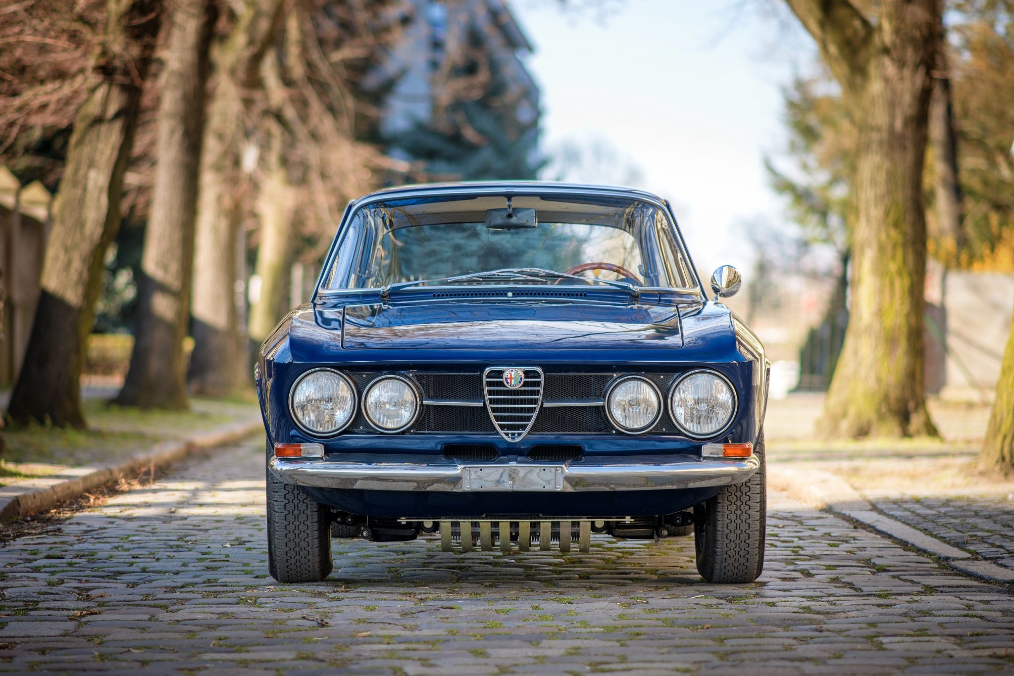 Silver CMR 14″ steel wheels are secured via brass lug nuts and wear chrome Alfa Romeo hub caps and 165-width Pirelli Cinturato tires. A matching full-size spare, a tool roll, and a refurbished Battaini jack are located in the trunk. Braking is handled by servo-assisted four-wheel discs.