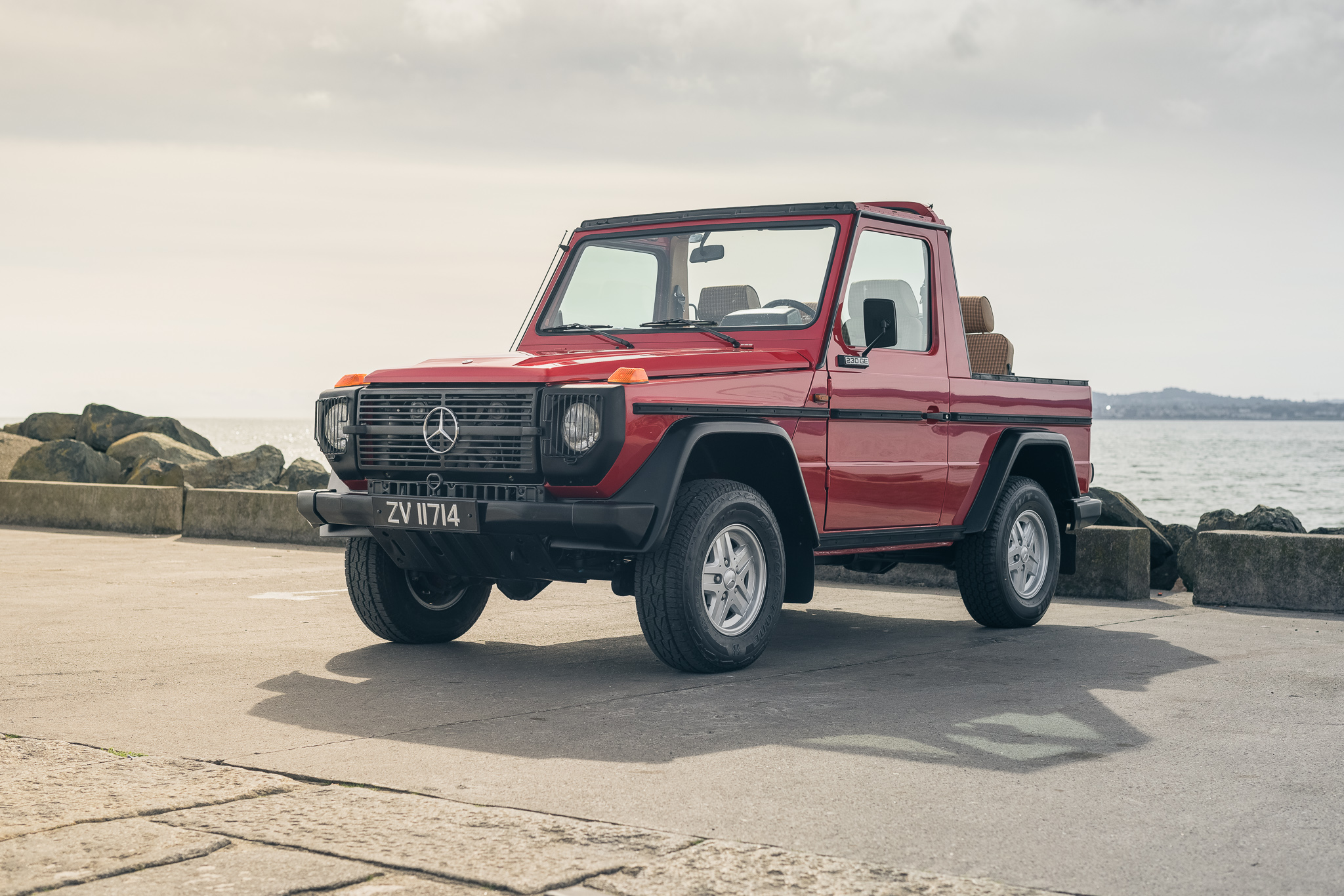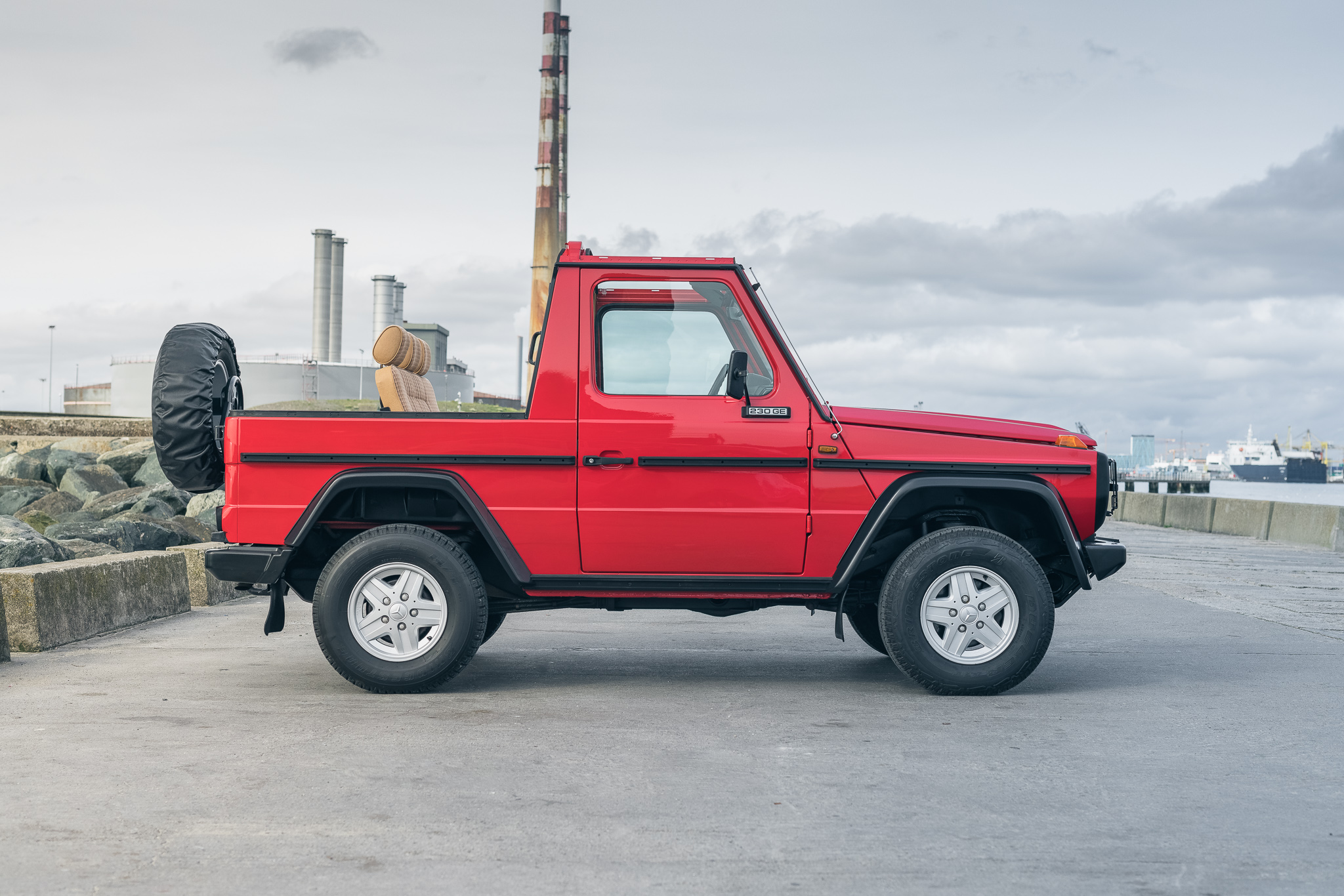 Five-spoke 15” wheels wear Mercedes-Benz center caps and are mounted with 235/75 Bridgestone Dueler H/T tires. A spare wheel and tire are mounted to a swing out rear carrier, and stopping power is provided by front discs and rear drums.