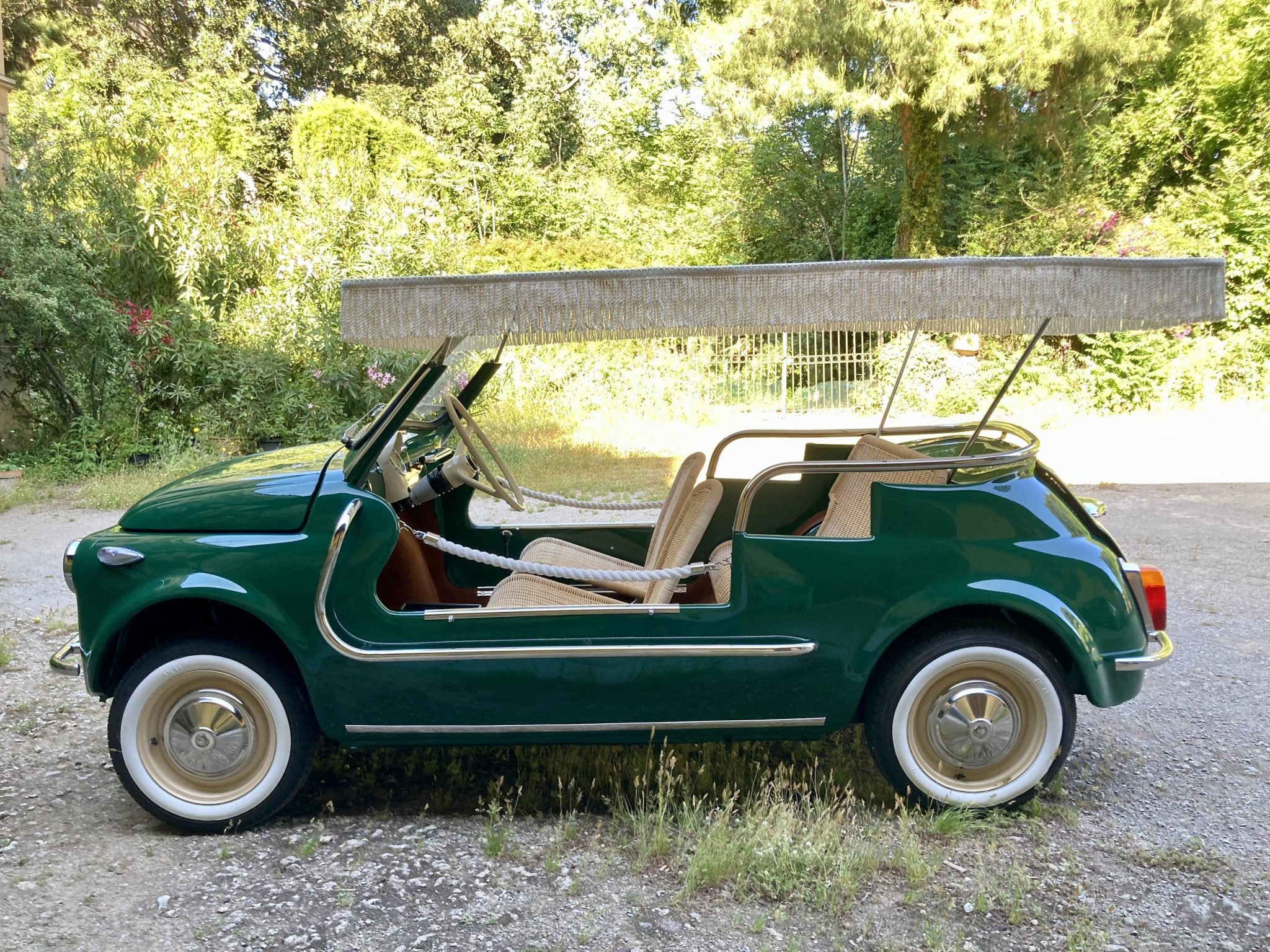 Beige 12″ steel wheels feature bright hubcaps, and the tires are fitted with whitewall inserts. The suspension and four-wheel drum brakes were overhauled during the build.