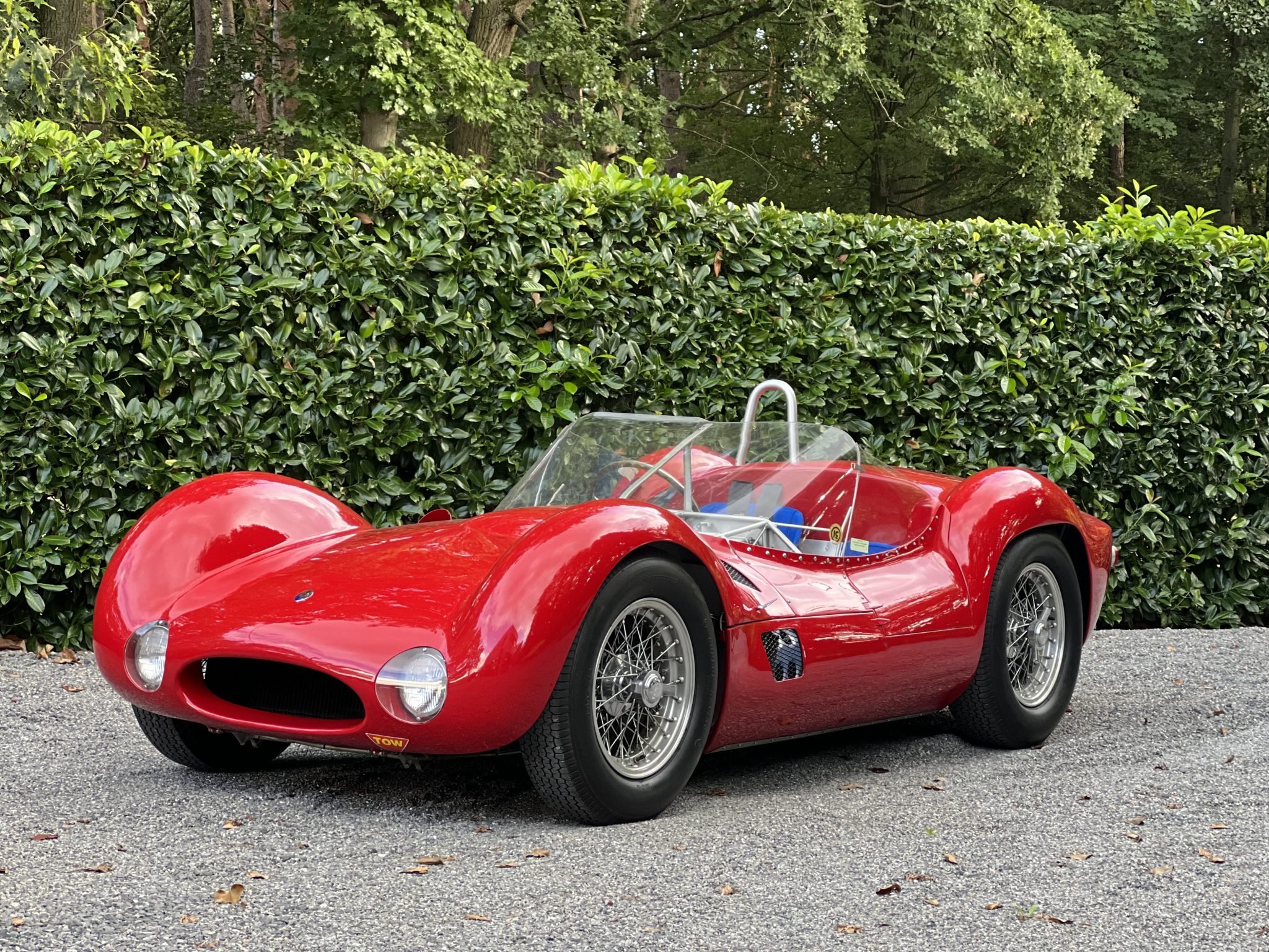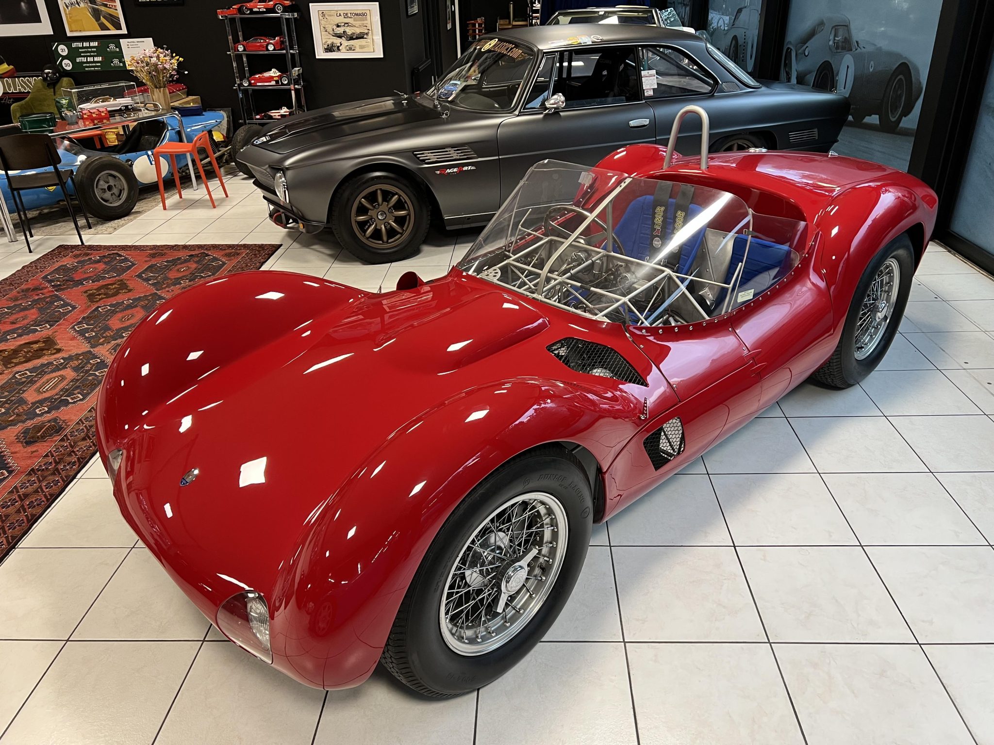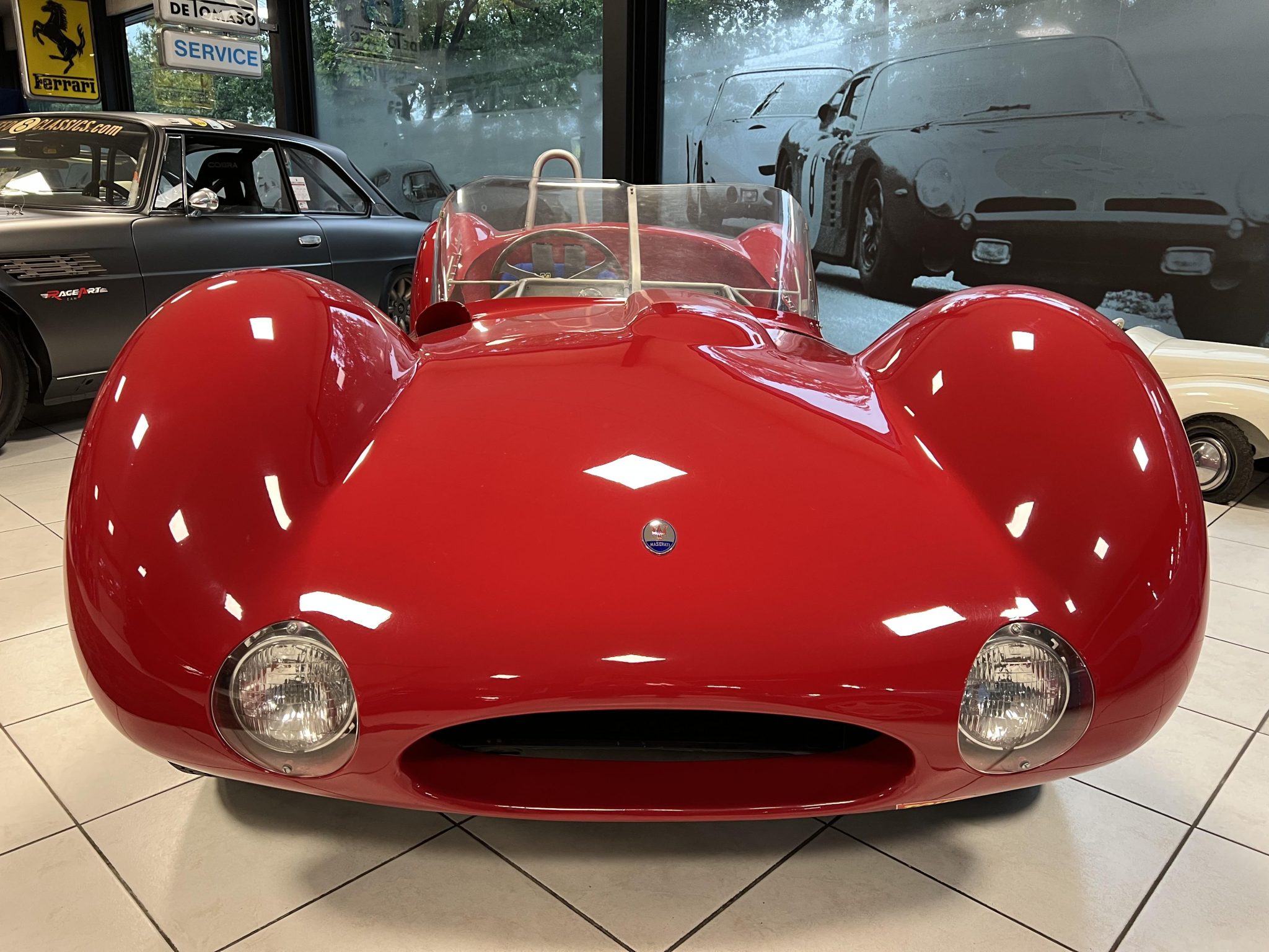 This re-creation’s spaceframe is said to have been assembled using TIG welds dressed with gas welds to simulate the appearance of factory joints. Aluminum bodywork was reportedly hand-formed by Rod Jolley in Hampshire, United Kingdom, replicating the original Birdcage’s low-profile hoodline, protrusive fenders, and short front and rear overhangs. Features include a raked wraparound windshield, a hood bulge, covered headlights, and a roll hoop.