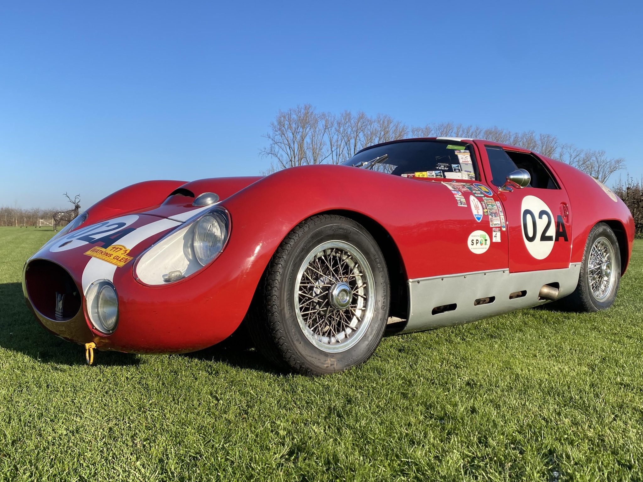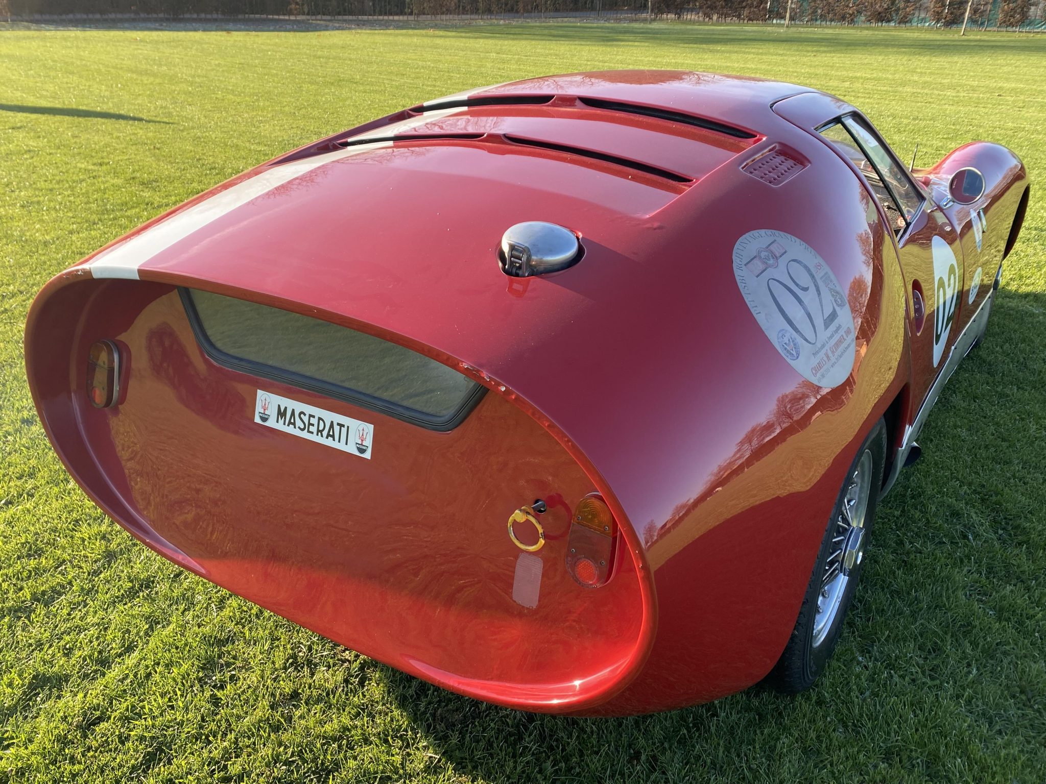 The aluminum Kamm tail bodywork is finished in red with an off-center white over-the-top stripe and roundels. Features include covered headlights and fog lights, a Maserati trident grille badge, a hood scoop, twin Talbot-style mirrors, unpainted aluminum rocker panels, twin side-exit exhausts, and a polished flip-up fuel filler. Decals from events it competed in under previous ownership are affixed to the body and windshield. Paint loss and cracks beneath the grille can be seen in the gallery, which includes a number of photos that were taken in September 2021.