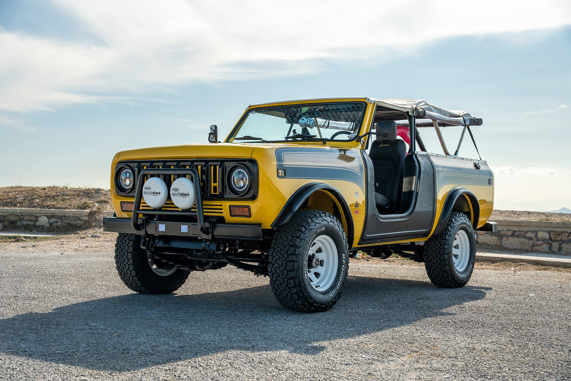 This Scout is equipped with a 3″ lift and Bilstein front dampers. White-painted 15″ wheels are mounted over manually locking front hubs and are fitted with 31×10.5″ BFGoodrich All-Terrain T/A K02 tires.
