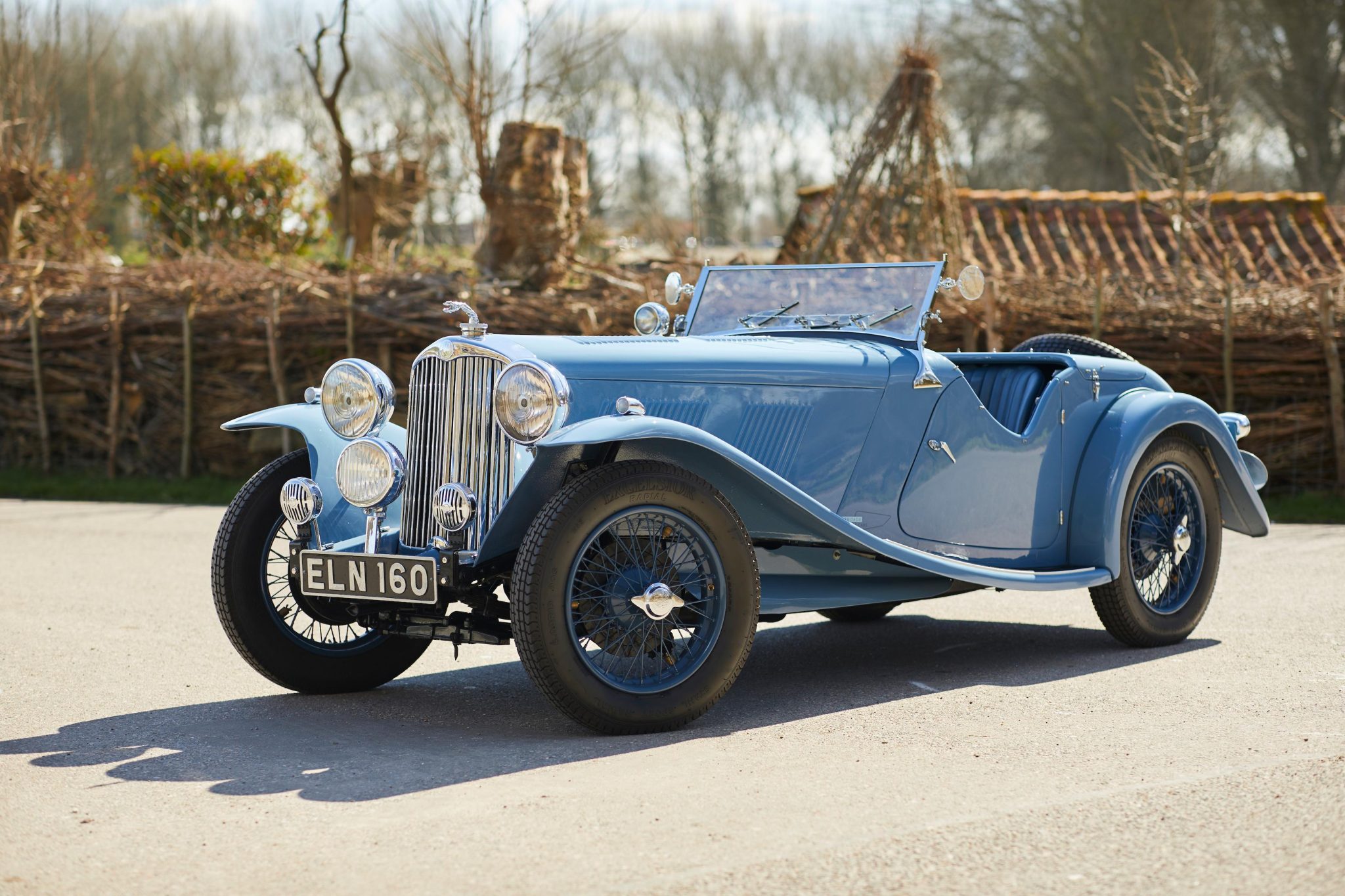This sloping-tail example was originally finished in a shade of gray according to correspondence with the original owner. After being purchased in 1957 with accident damage to its body, the chassis was fitted with replacement bodywork from another 16/80 before being raced by its then-owner in a bright yellow livery. The car was refinished in ivory during subsequent refurbishment work before receiving a repaint between 2017 and 2020 in its current shade of blue-gray, which is said to replicate the AC color Aberdeen Slate Grey.