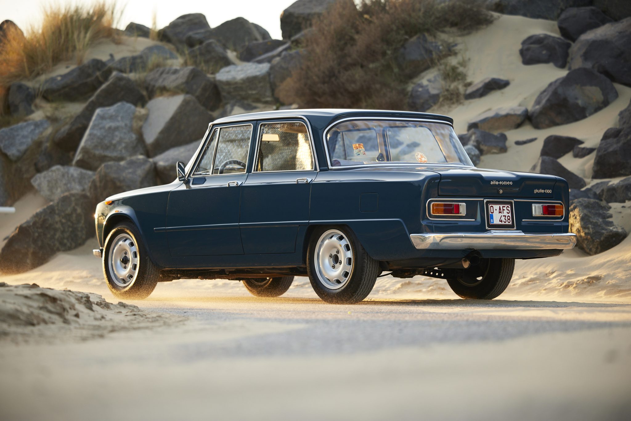 Silver 15″ TZ-style alloy wheels were installed under current ownership and are mounted with 175/70 Avon CR6ZZ tires, while a full-size spare is housed in the trunk compartment. The suspension has been modified with an Alfaholics Fast Road Suspension Kit, aluminum T-bar, quick steering arms, and adjustable camber arms as well as Bilstein front and Koni rear shocks. An Alfaholics adjustable dual-circuit brake balance box along with a GTA-R reservoir and feedline kit have been installed. Stopping power is provided by four-wheel disc brakes with Brembo aluminum calipers over vented rotors up front.