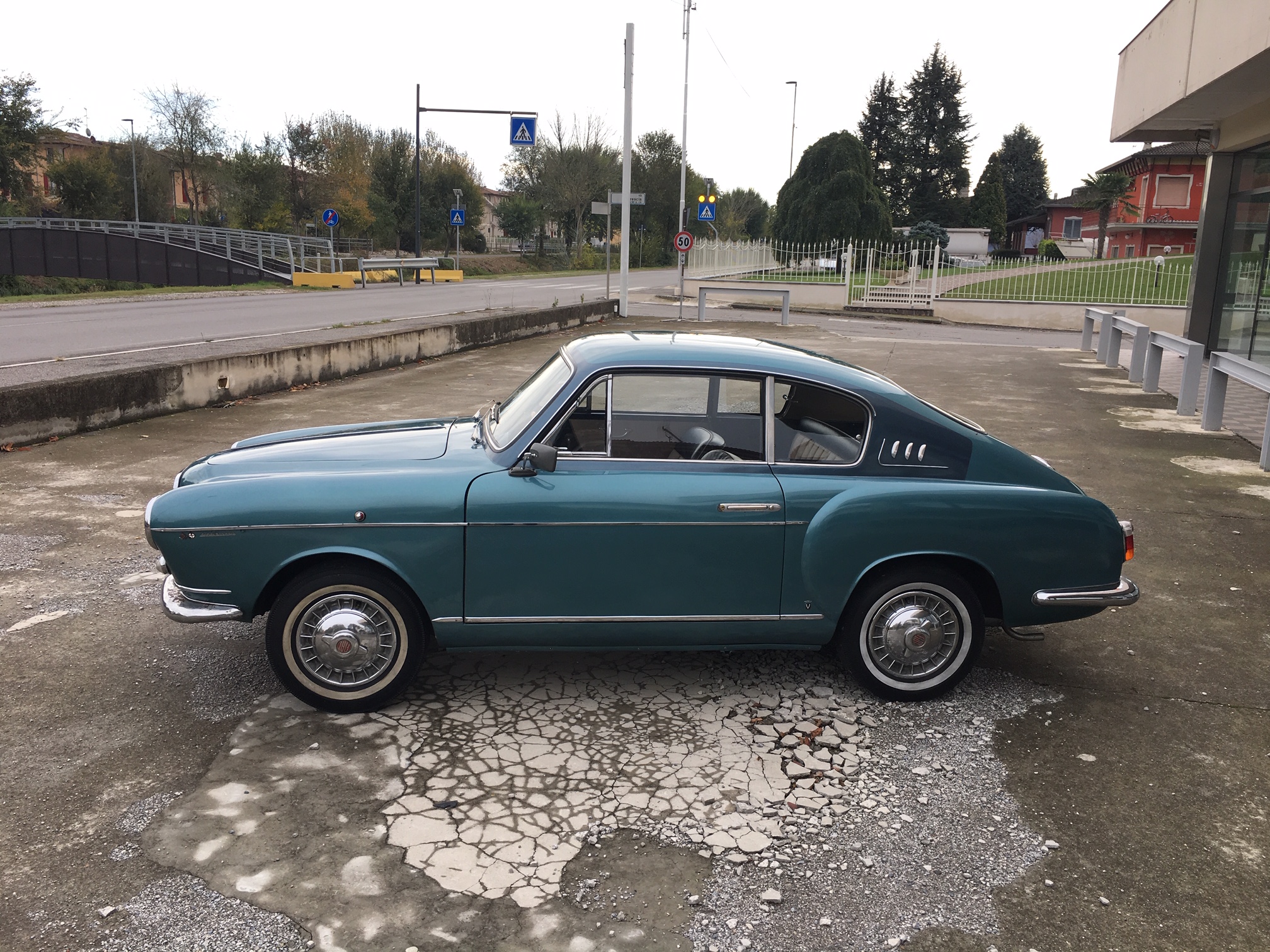 Polished 12” wheels wear matching covers and Fiat-branded hubs, and they are mounted with Pirelli whitewall tires. 4-wheel drum brakes were carried over from the standard Fiat 600 platform. The suspension consists of coil springs and semi-trailing arms at the rear and a transverse leaf spring and shock absorbers up front.
