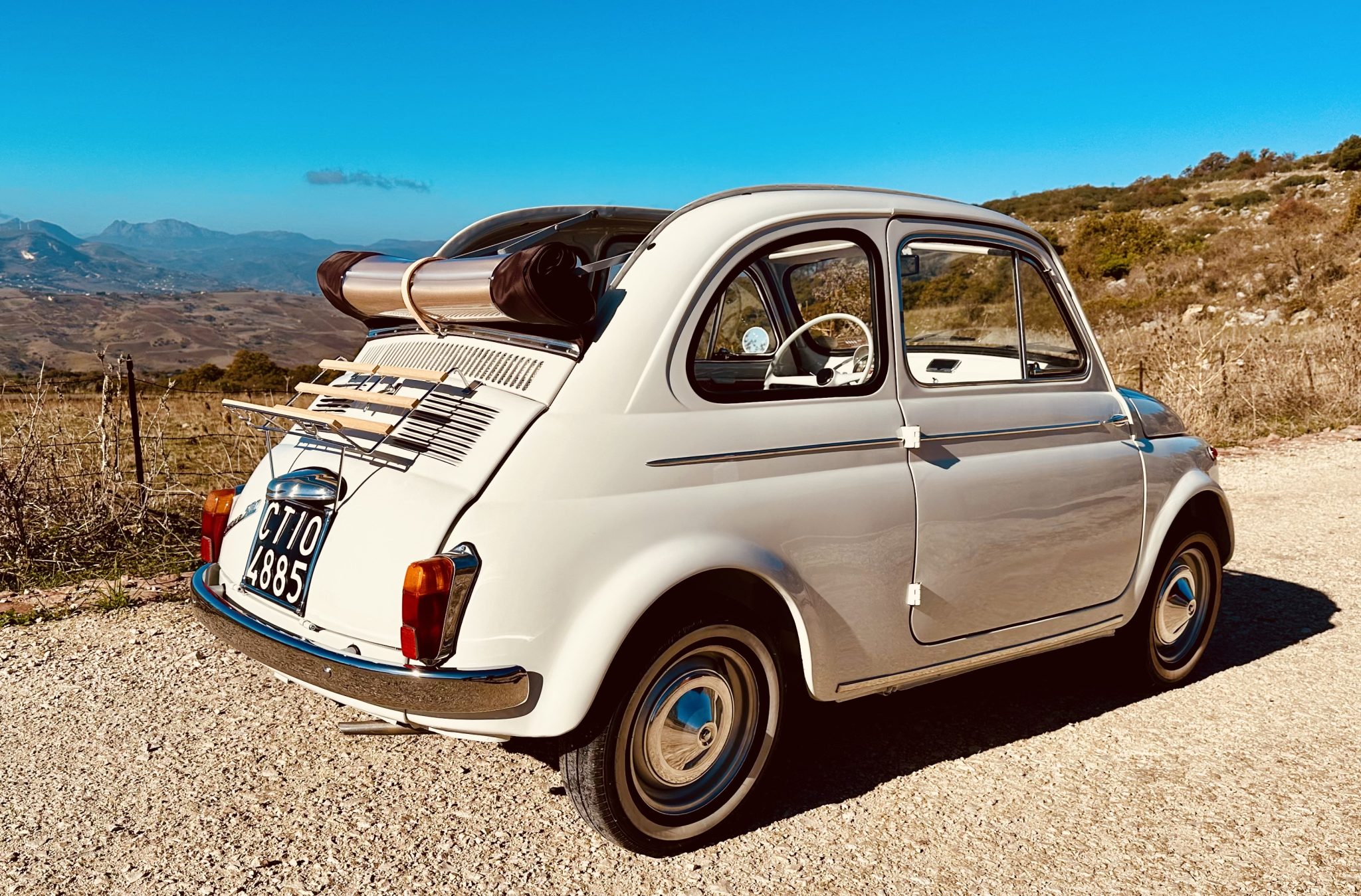 The 12″ steel wheels wear bright hubcaps and thin-whitewall Nuvolari TN1 tires that measure 125/80. Braking is handled by drums at all four corners, which were rebuilt in 2023 along with the suspension.