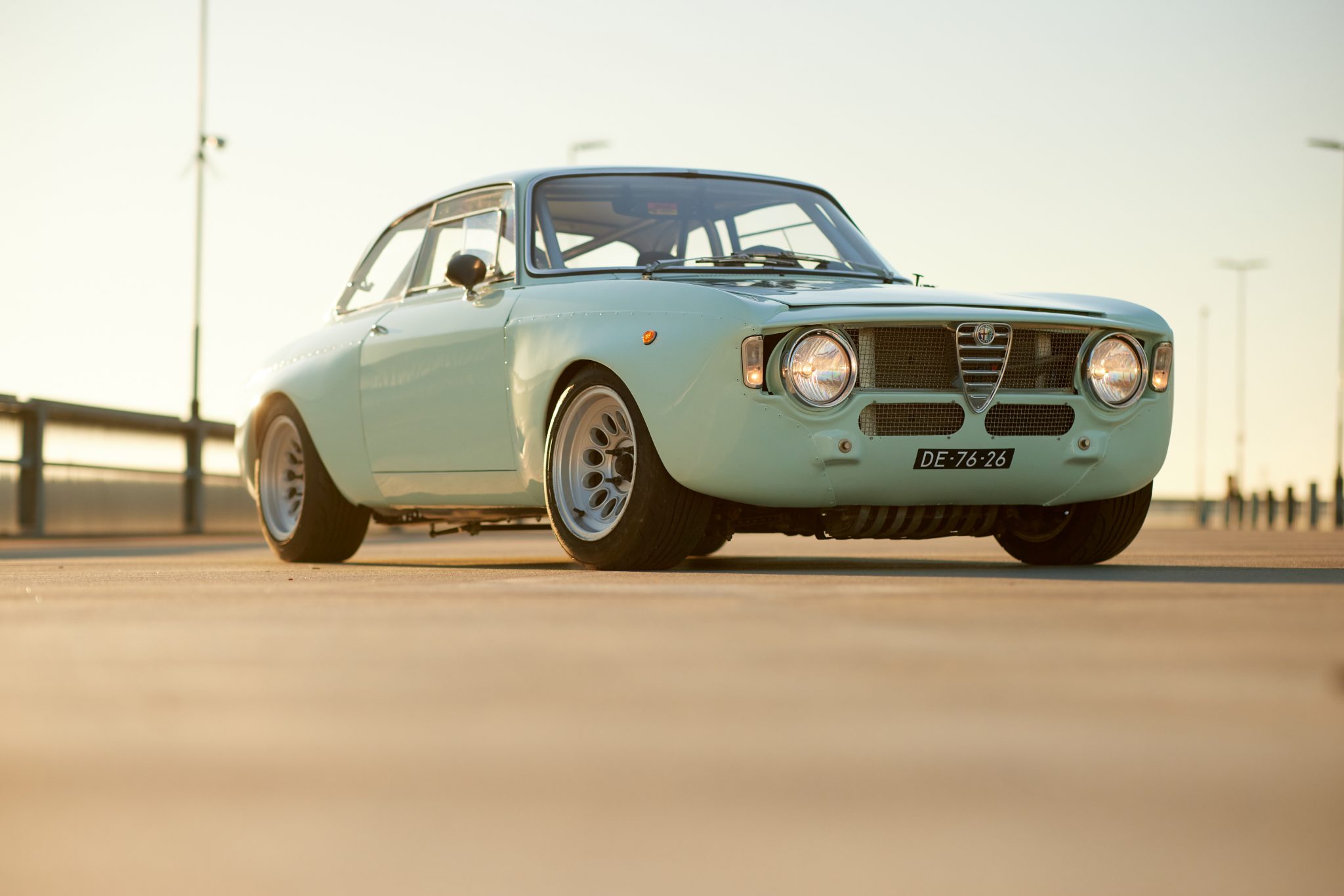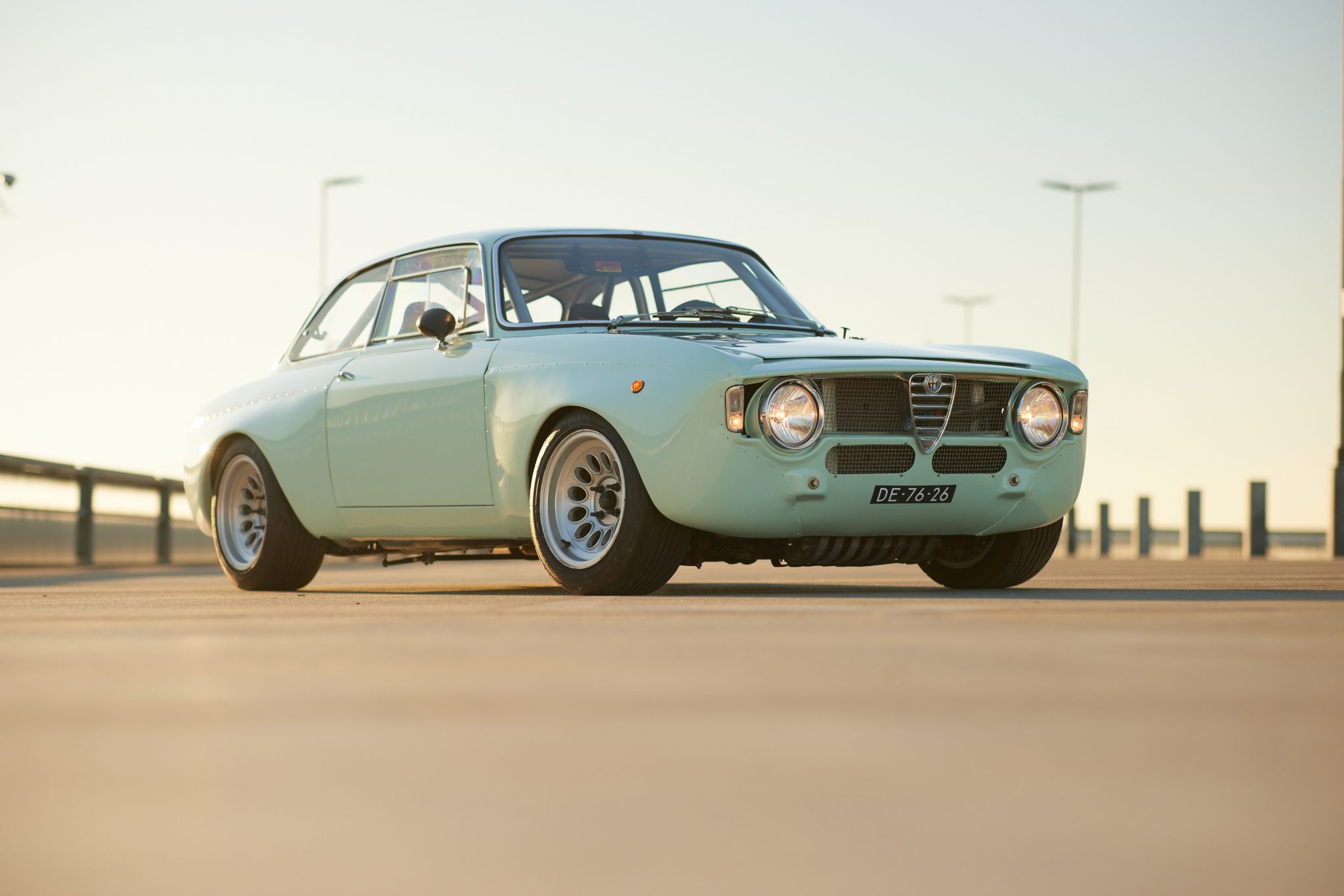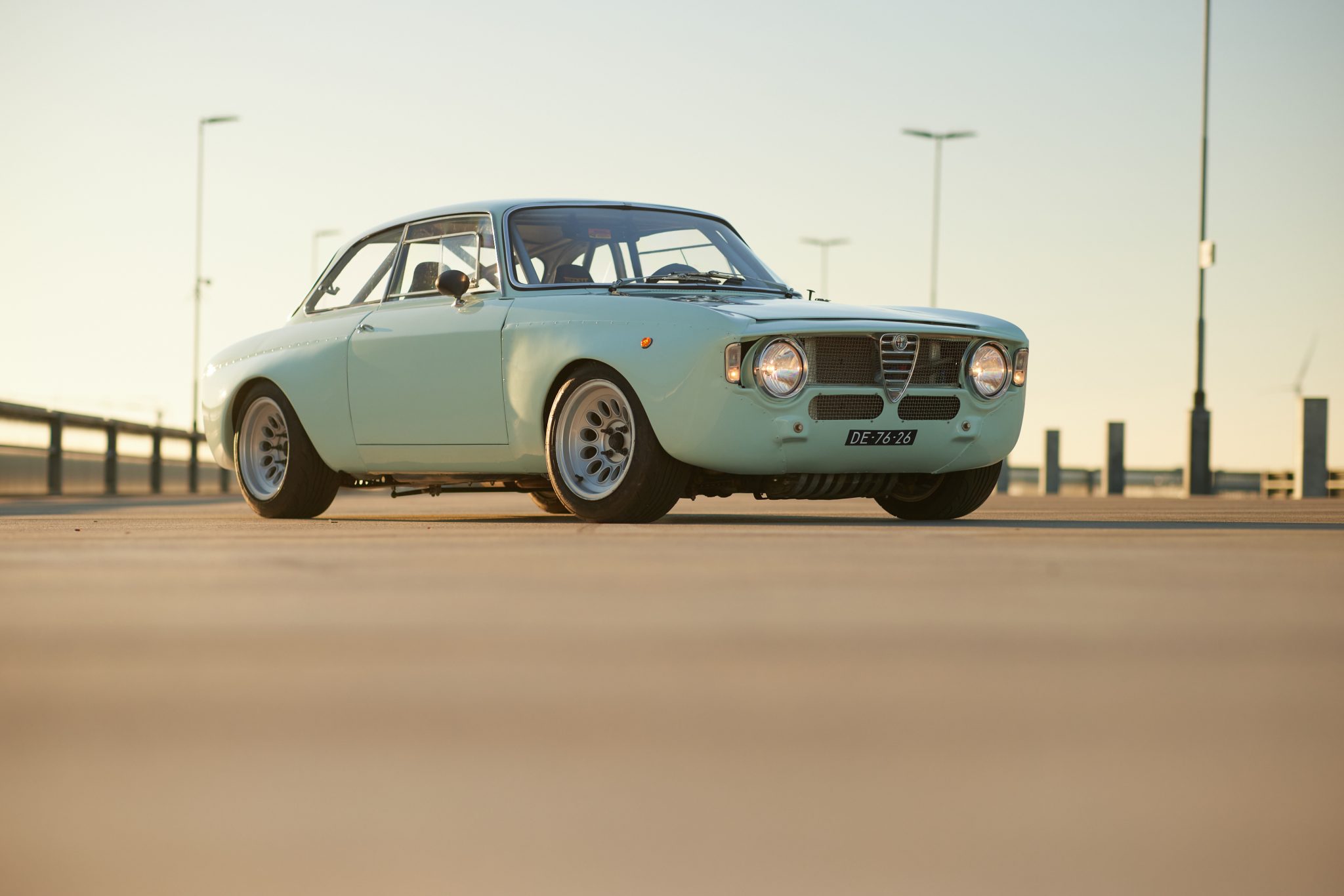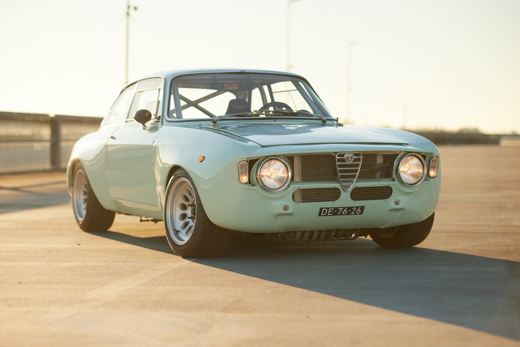 Alfaholics 15″ GTAm-style alloy wheels are mounted with 205/50 Nankang tires. The seller states that the suspension was overhauled and the front was fitted with an Alfaholics geometry kit and springs, rose-jointed track rods, and an adjustable anti-roll bar, camber arms, and Intrax shocks, while a Watts linkage setup and Intrax coilovers were installed at the rear. An Alfaholics billet steering box has been installed, and the brake system has been upgraded with six- and four-piston Alfaholics aluminum calipers, vented two-piece front rotors, Tilton master cylinders, Pagid pads, and Goodridge lines.