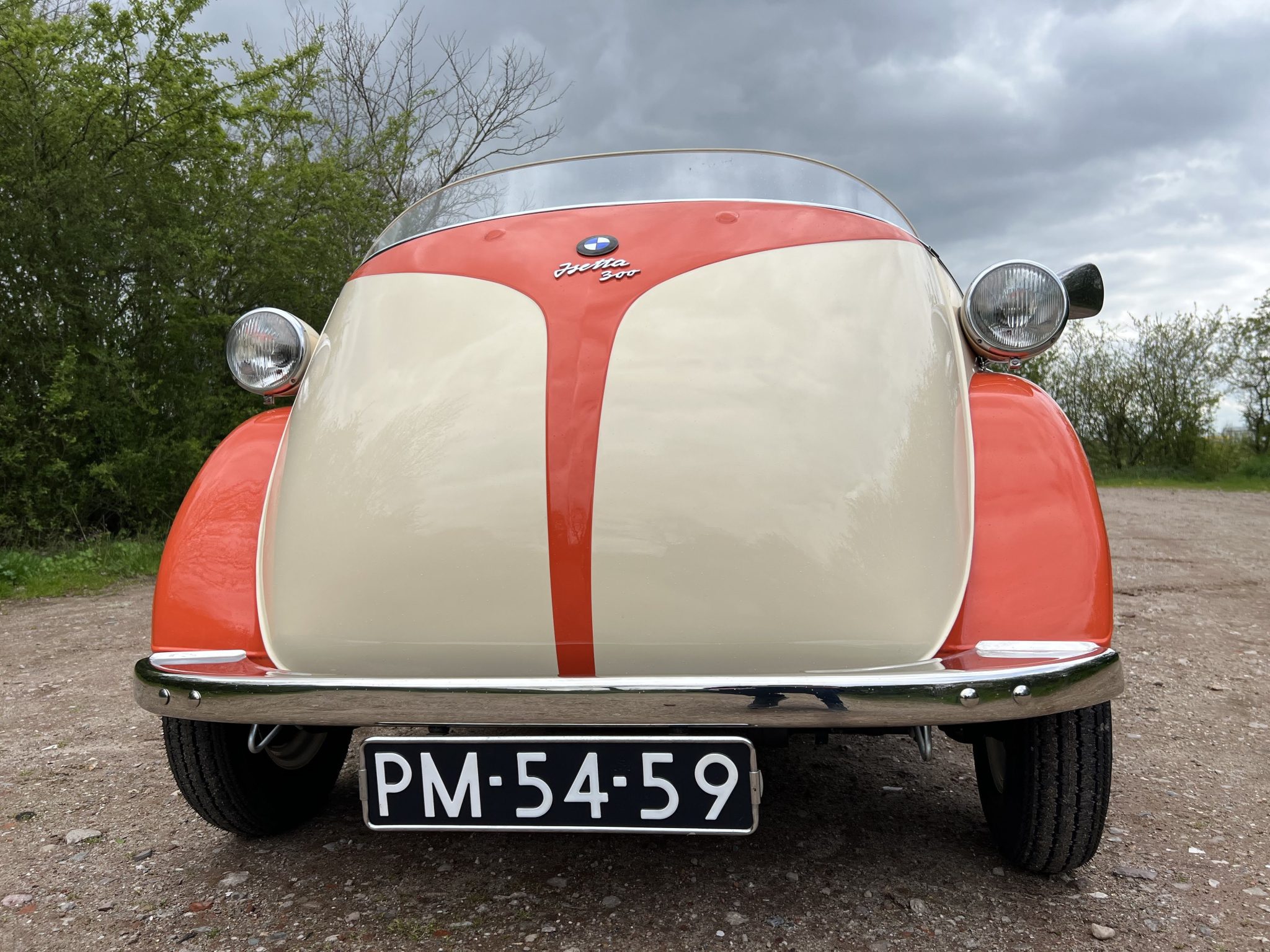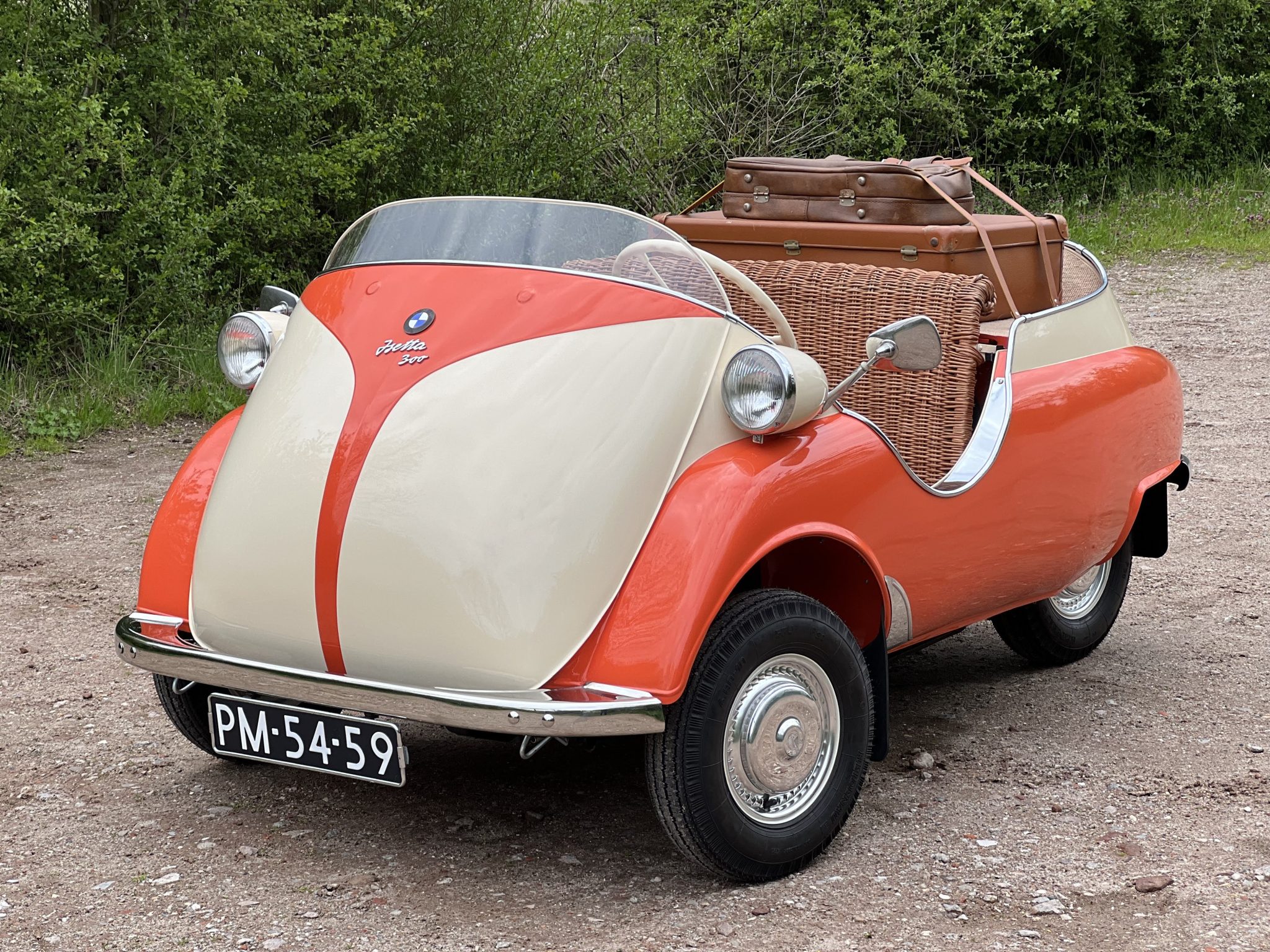 Steel 10″ wheels wear chrome covers and are mounted with Heidenau tires. The Isetta features a coil-spring suspension up front and leaf springs out back, and stopping power is provided by hydraulically actuated drum brakes.