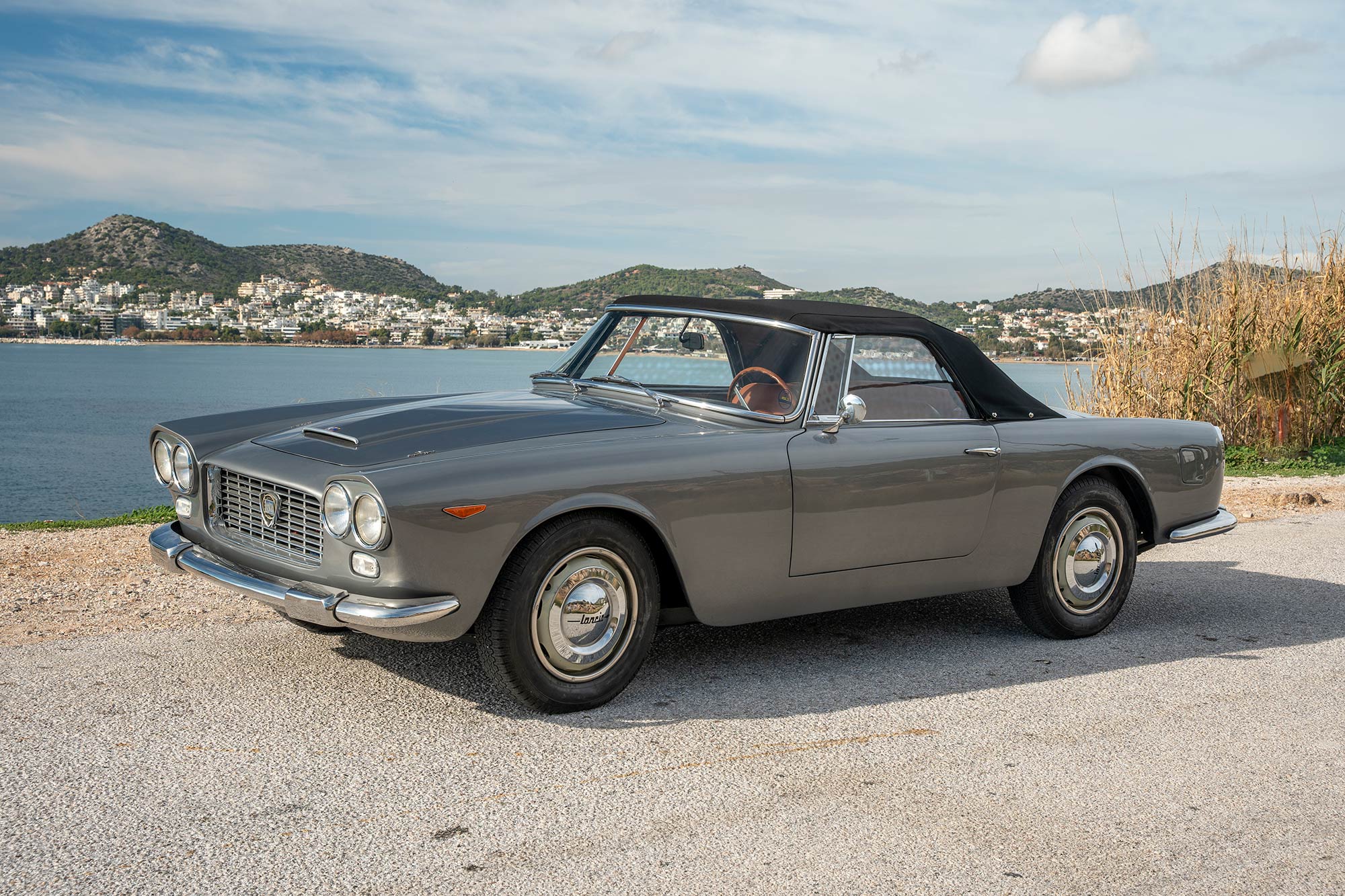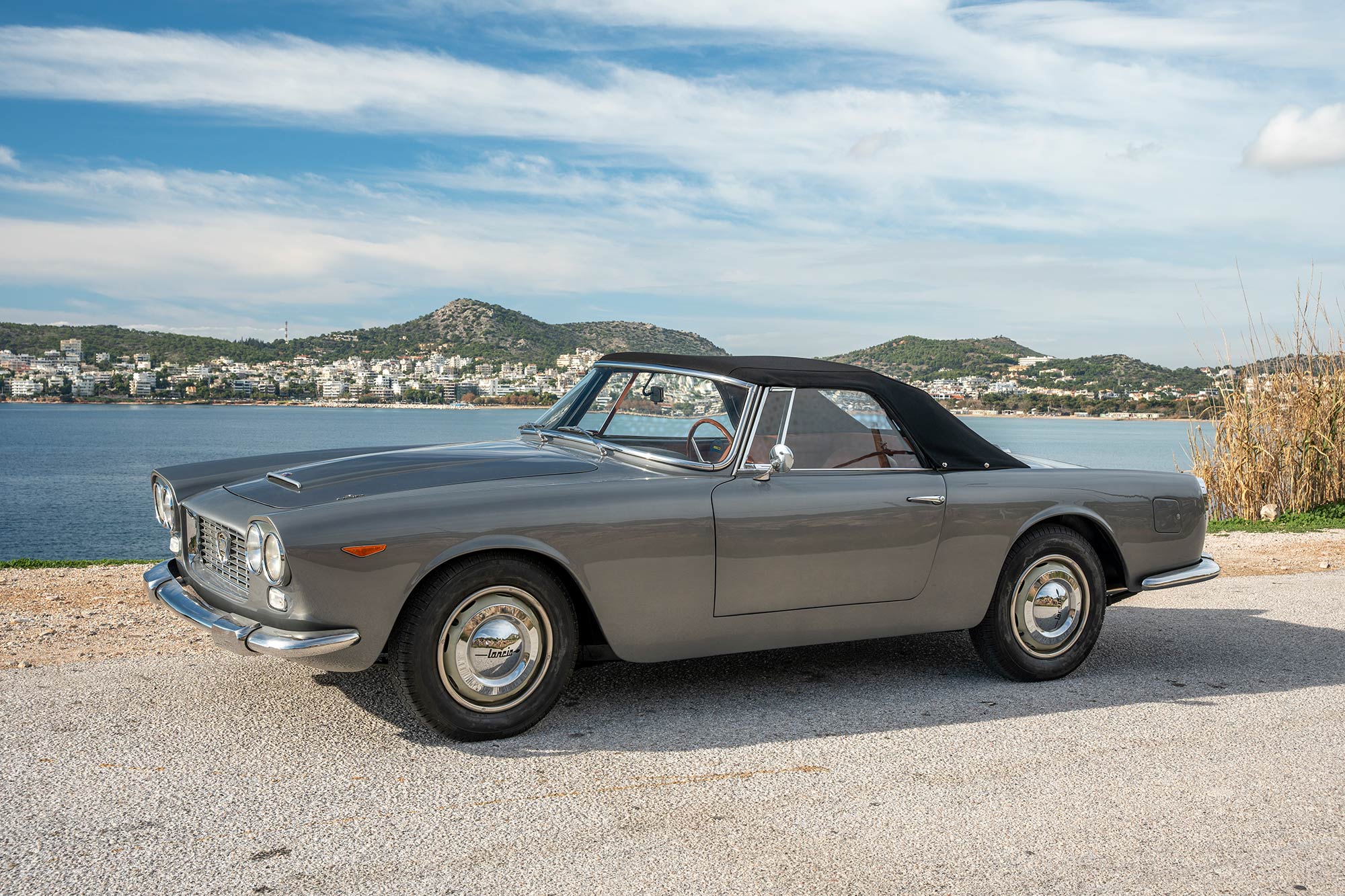 The cream-finished 400mm steel wheels wear polished trim rings as well as Lancia-branded hubcaps, and they are mounted with 175-series Pirelli tires. A matching spare wheel and tire are stored in the trunk compartment. The Flaminia rides on a 99″ wheelbase and features an independent double-wishbone front suspension and a de Dion tube rear setup with an anti-roll bar. Stopping power is provided by four-wheel disc brakes with inboard-mounted rotors out back.