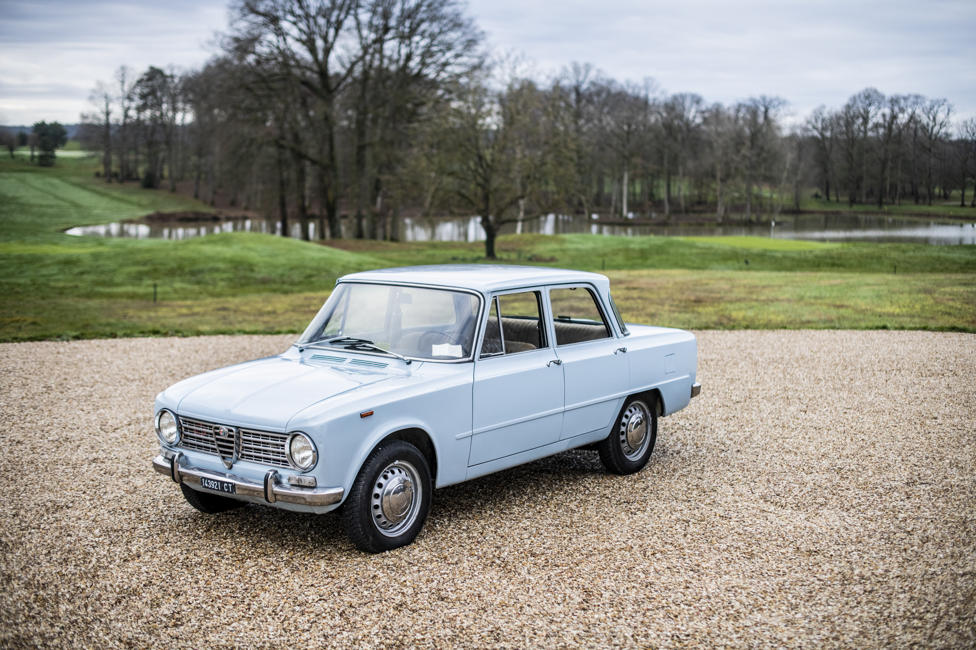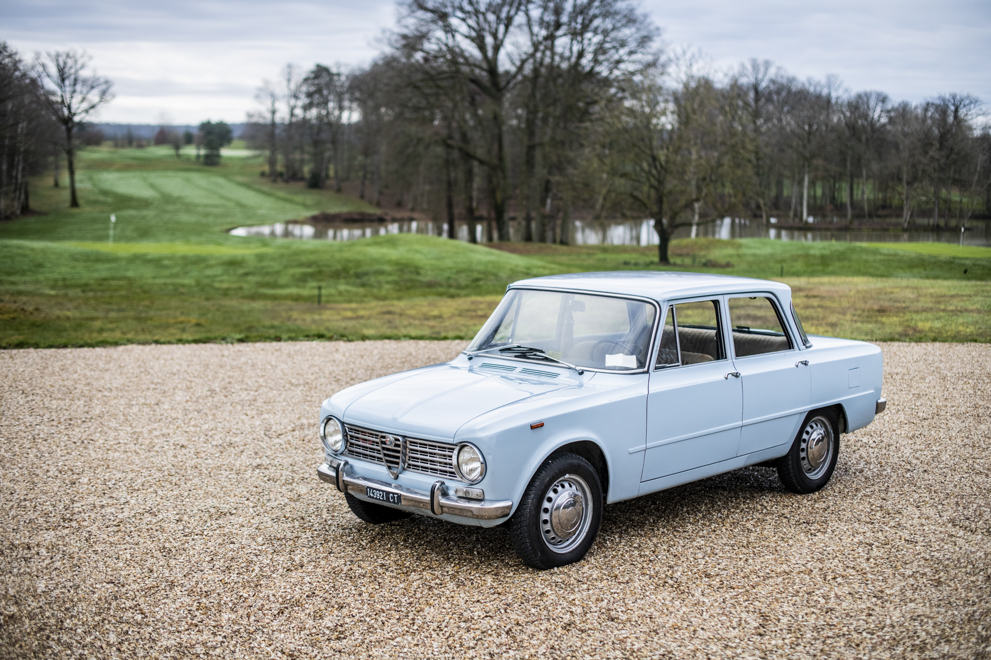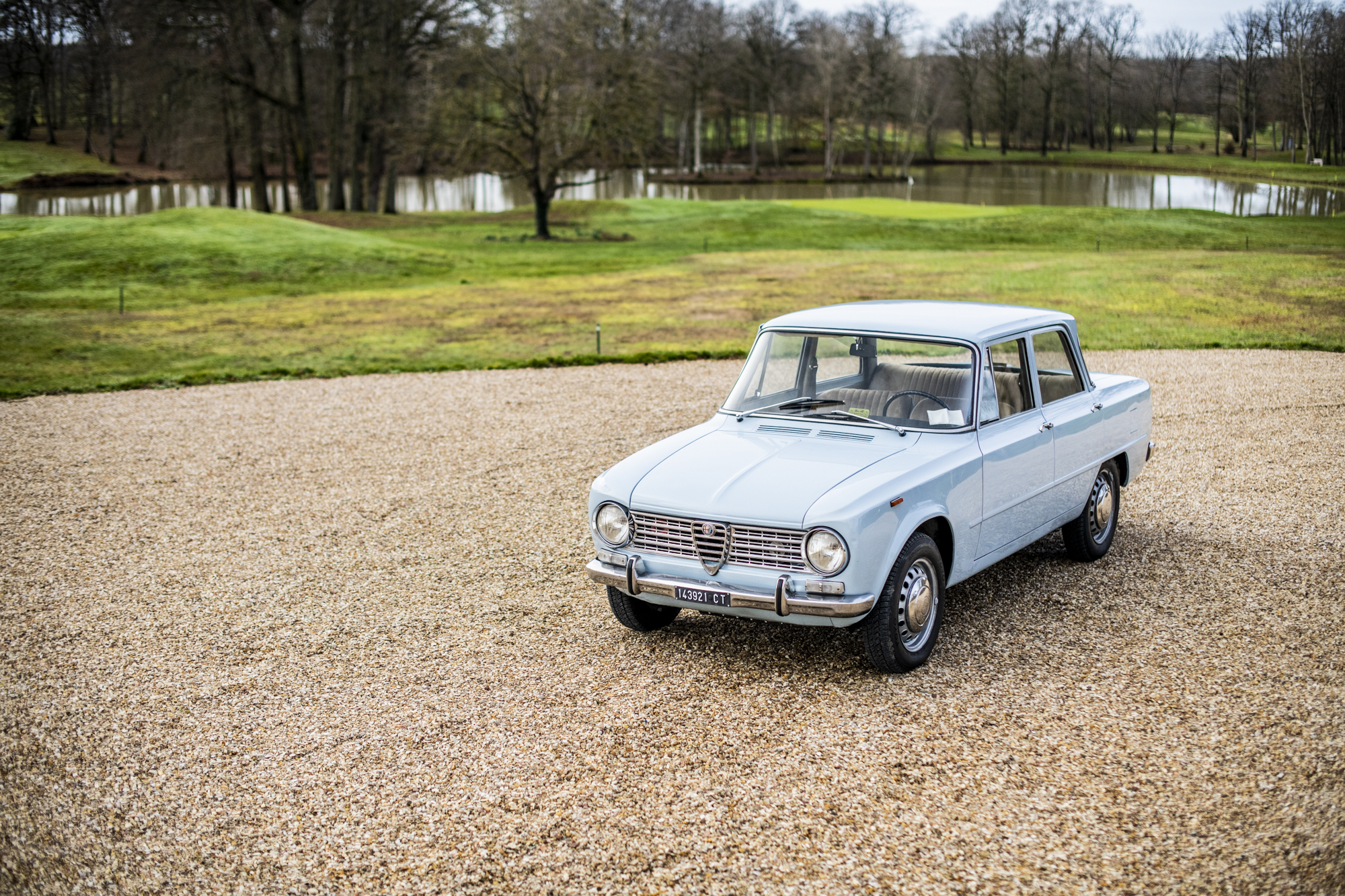 Silver-finished 15″ steel wheels wear polished Alfa Romeo–branded hubcaps and 155-width Toyo 310 tires, while a matching spare wheel wrapped in a Dunlop tire is stored in the trunk compartment. The suspension is fitted with Koni shocks at each corner and reportedly received replacement bushings and front steering rods under current ownership. The four-wheel disc brake system is said to have been overhauled with work involving rebuilding the Dunlop calipers as well as replacing the master cylinder, servo, rotors, pads, and hoses. Imperfections in the wheel finish are noted.