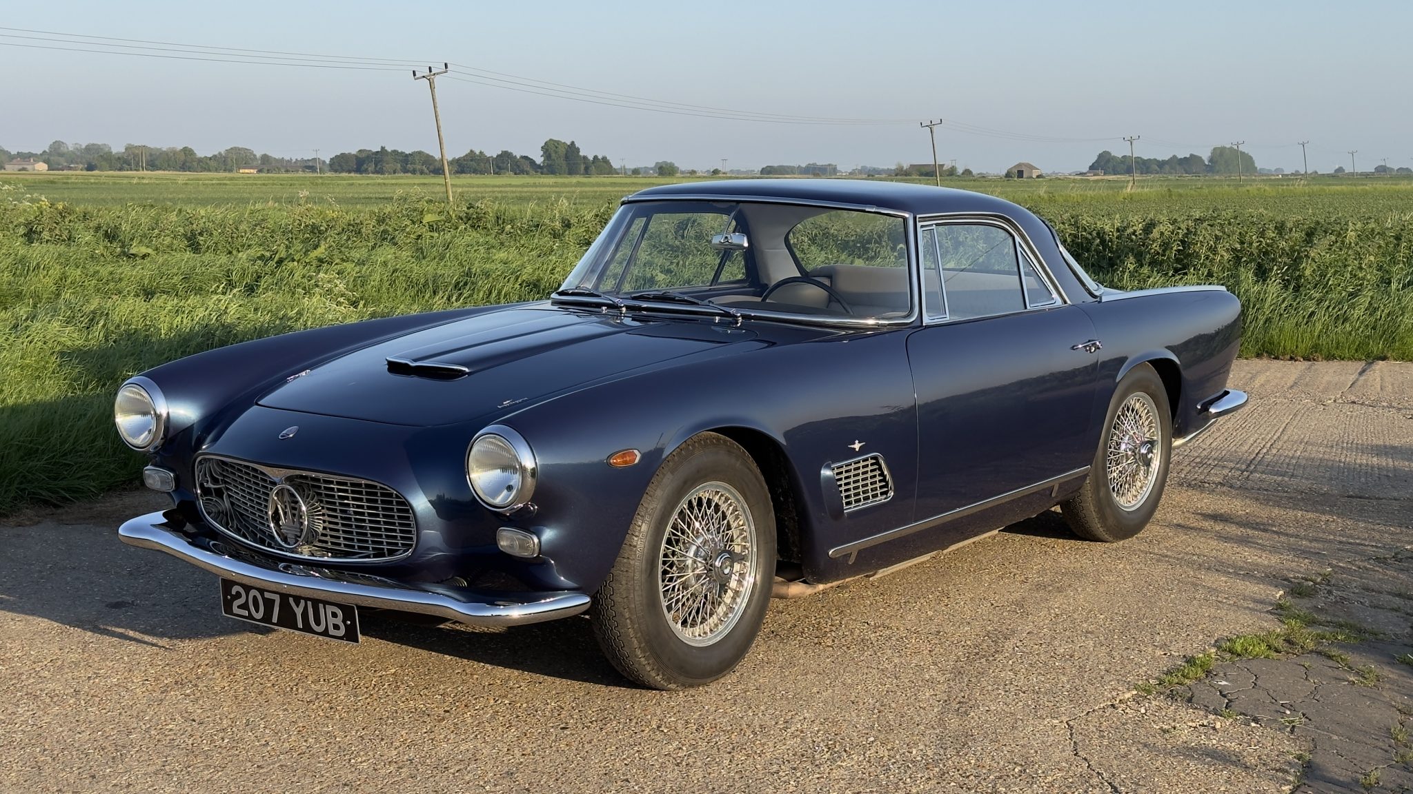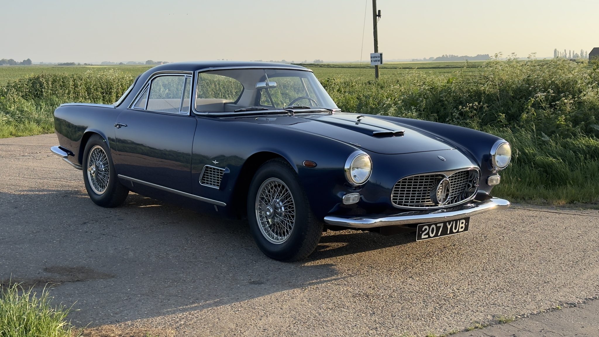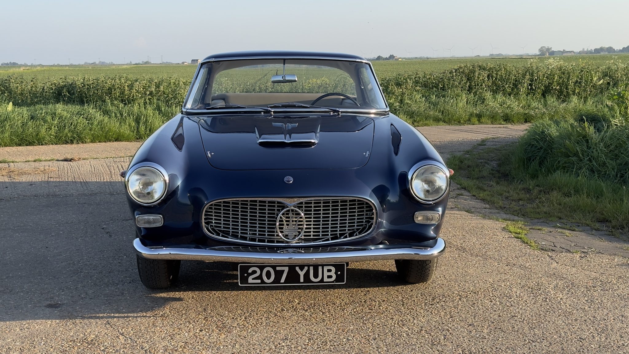 This example was stripped to bare metal and repainted in its current shade of Blu Sera Metallizzato during the refurbishment performed by Project Heaven in Peterborough, England, between 2014 and 2021. The brightwork is also said to have been re-plated during the project. Features include oval front side markers, a hood scoop, fender vents with bright grilles, a lockable fuel filler cap, and dual exhaust outlets.