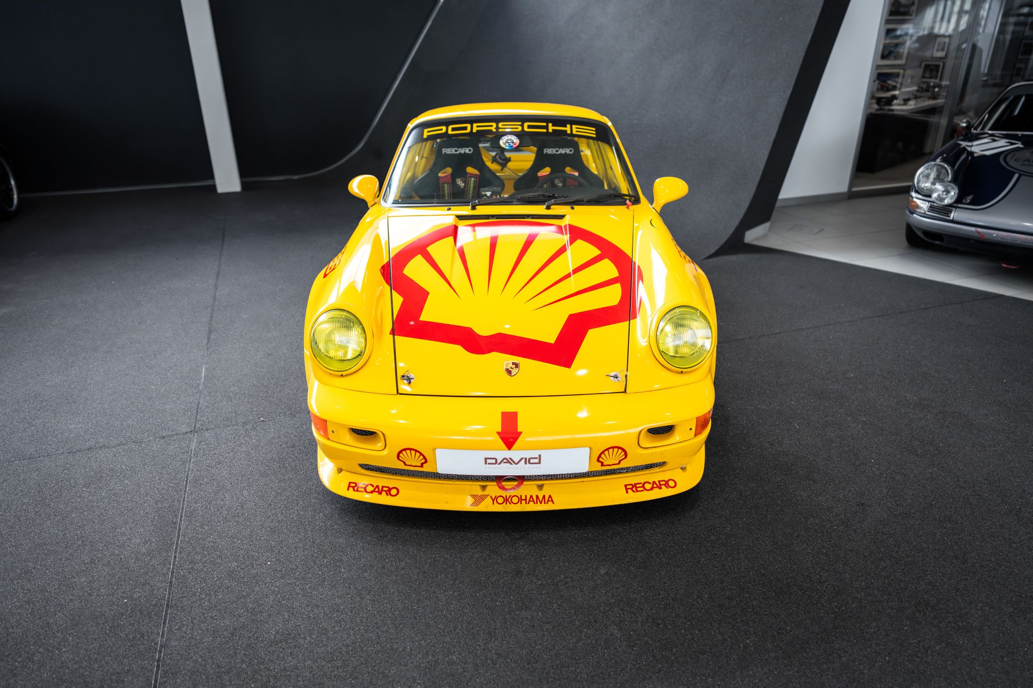 This example left the factory finished in paint-to-sample Blütengelb (139), or “Flower Yellow,” and was fitted with front and rear wheel-arch extensions under previous ownership. The car wears various sponsor decals including Shell branding on the hood, quarter panels, and RS 3.8–style rear wing. Brake cooling ducts have been installed in place of the factory faux fog lights, and the fender markers have been removed. Further details include a body-color front lip spoiler, yellow headlamp lenses, red front and rear tow points, and plexiglass side windows with sliding vents.
