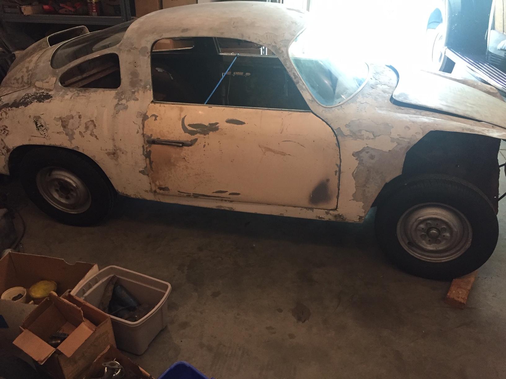 An area of sheet metal has been cut out from the passenger-side front fender as shown above. A set of steel wheels have been mounted on all four corners as pictured in the gallery.