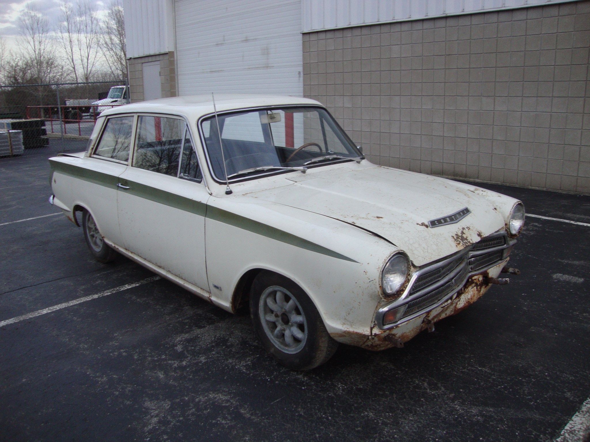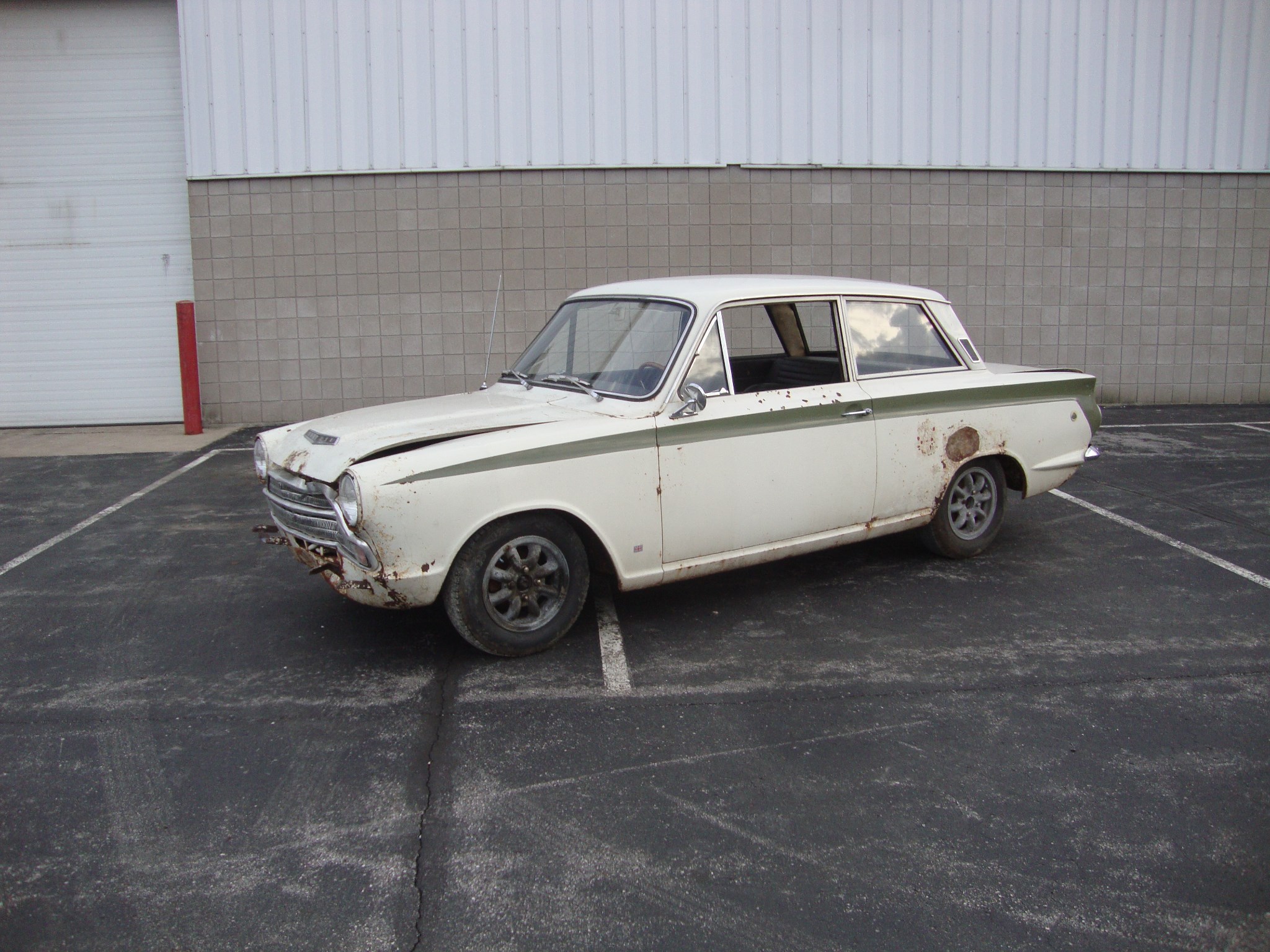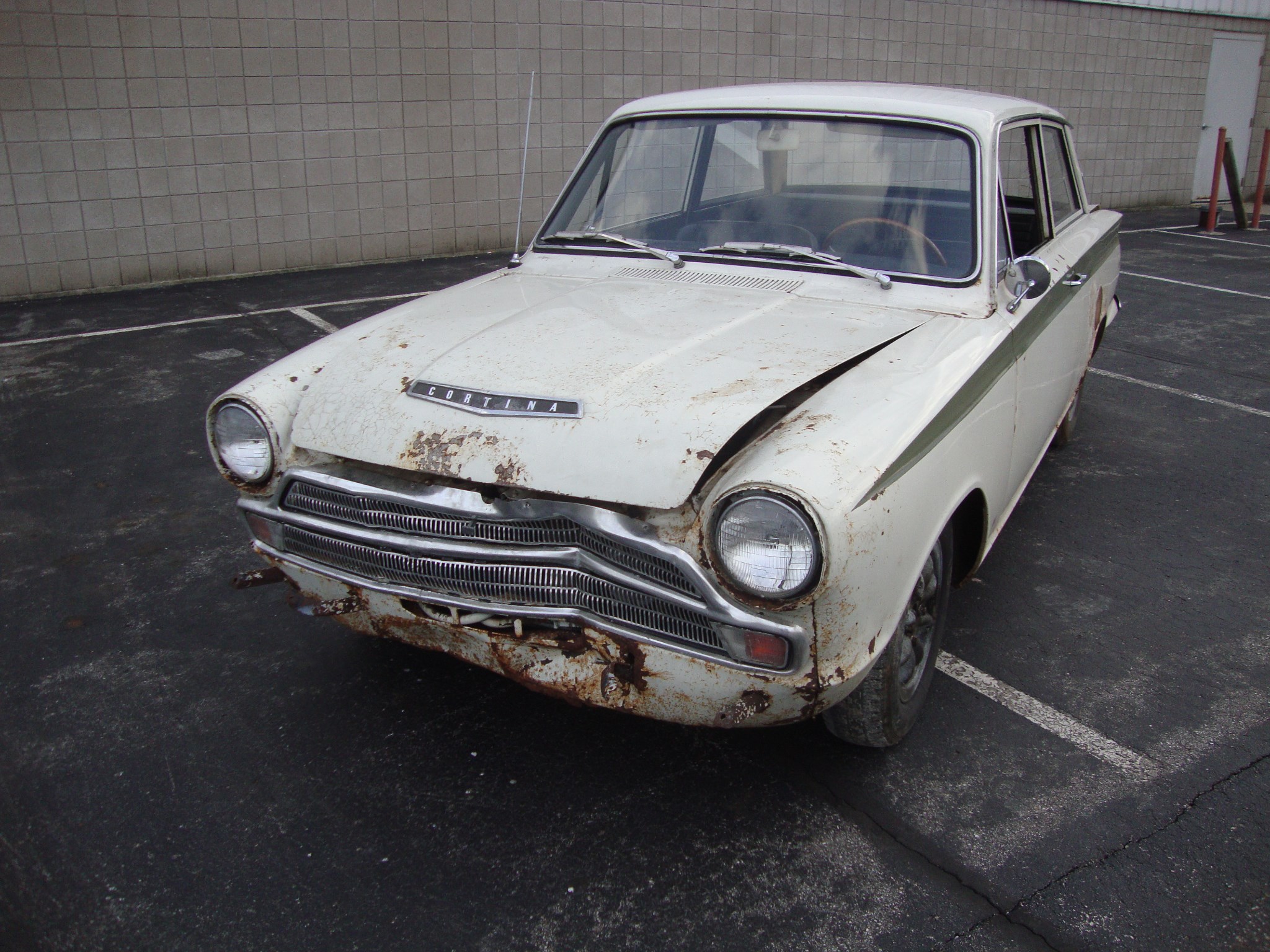 Rust is present in the floor of the trunk after an old battery froze and split open. Rust-through is evident under the spare tire, and other notable corrosion can be seen under the hood, rockers, wheel wells, crossmember under the front seats, on top of the strut mounts, and surrounding the accident damage.