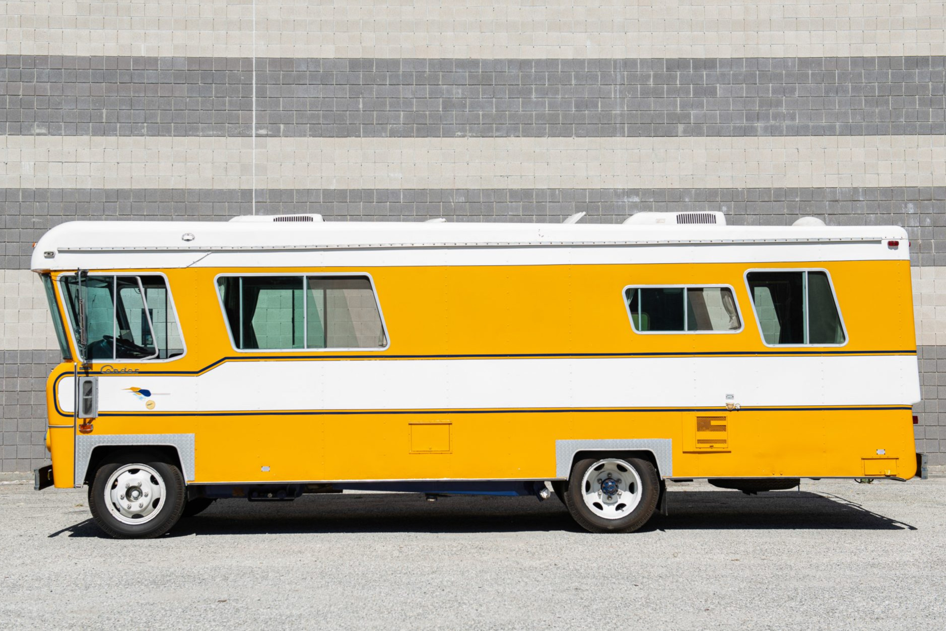 White six-lug wheels are mounted with 20×17.50″ Nanco tires, and the coach is equipped with a “dually” rear axle. Schematic drawings viewable in the gallery show factory modifications made to the power steering and frame assembly according to the seller.