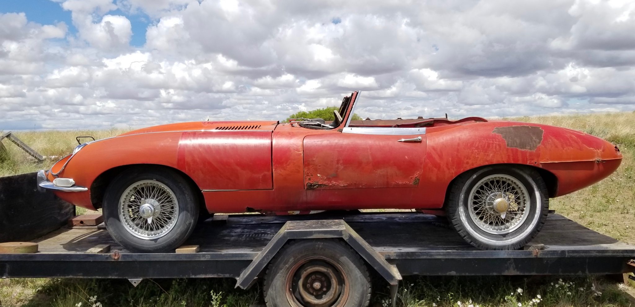 The wire wheels feature knock-off hubs and are wrapped in older mismatched tires. A matching spare is mounted in the rear storage area.