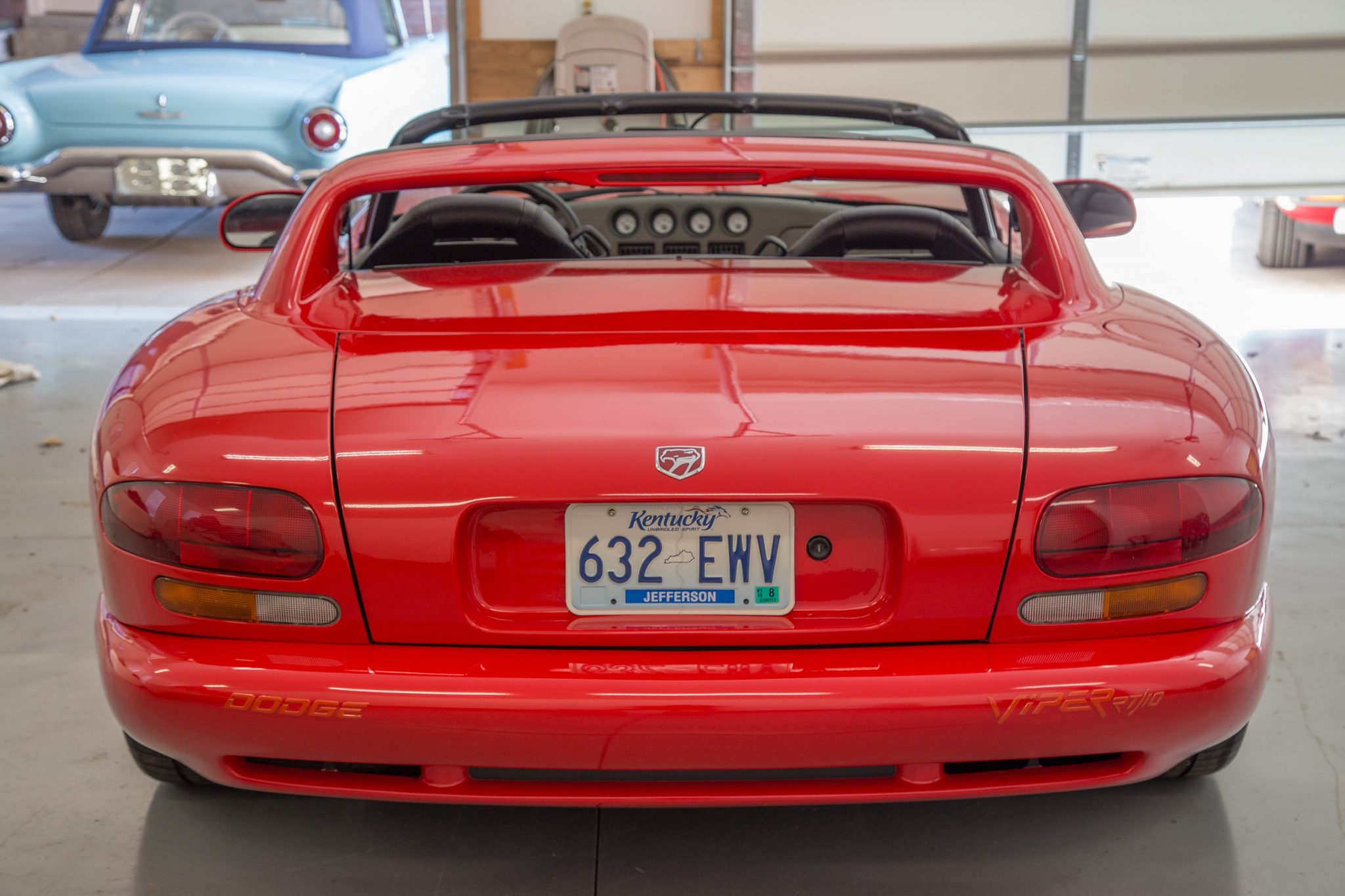 Five-spoke 17″ alloy wheels wear Viper center caps and older Michelin tires, sized 275/40 up front and 335/35 out back. Braking is from power-assisted and vented discs all around, and the fluid was changed in June 2015.