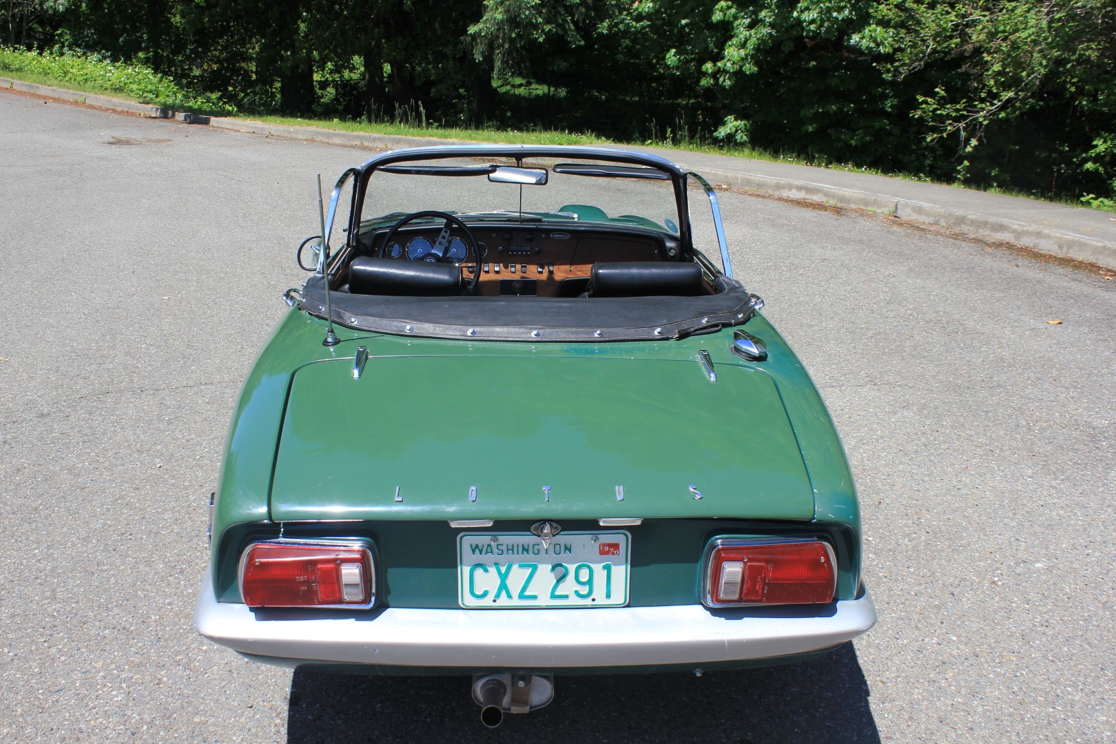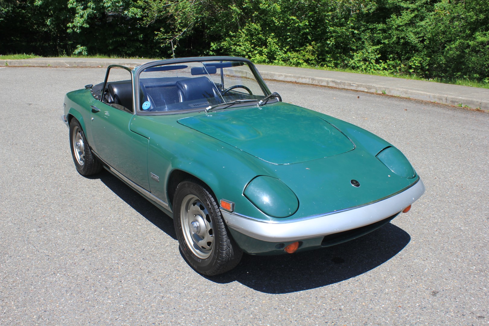 Silver-finished 13″ steel wheels wear Sumitomo HTR tires, with the trunk-mounted spare featuring an older radial. The car comes with a black convertible top, which exhibits cloudy plastic window panels.