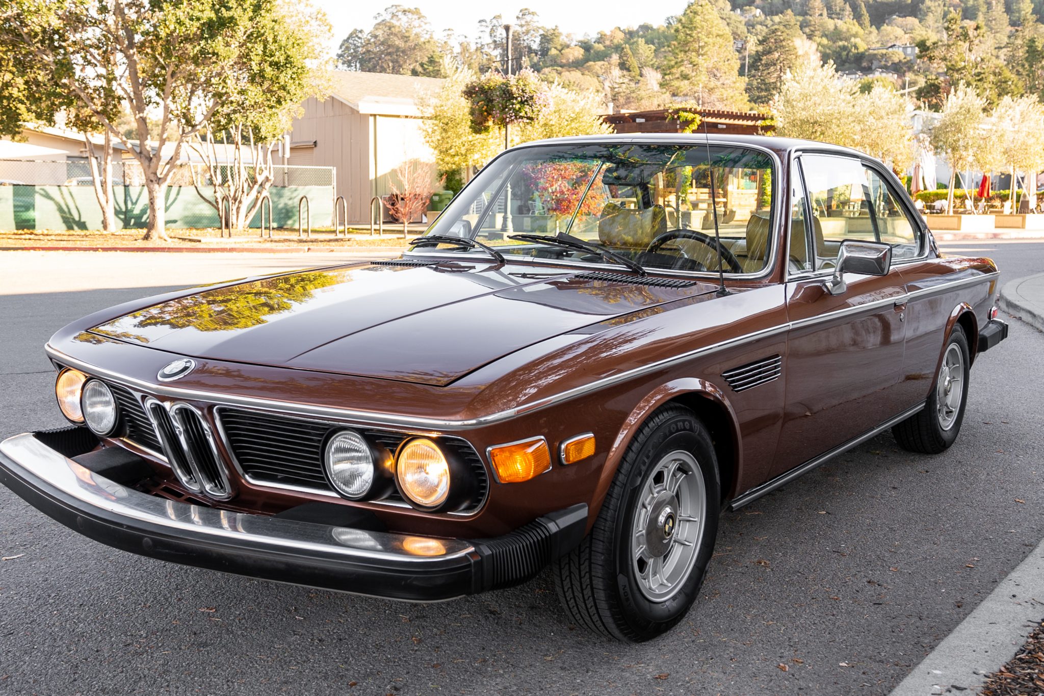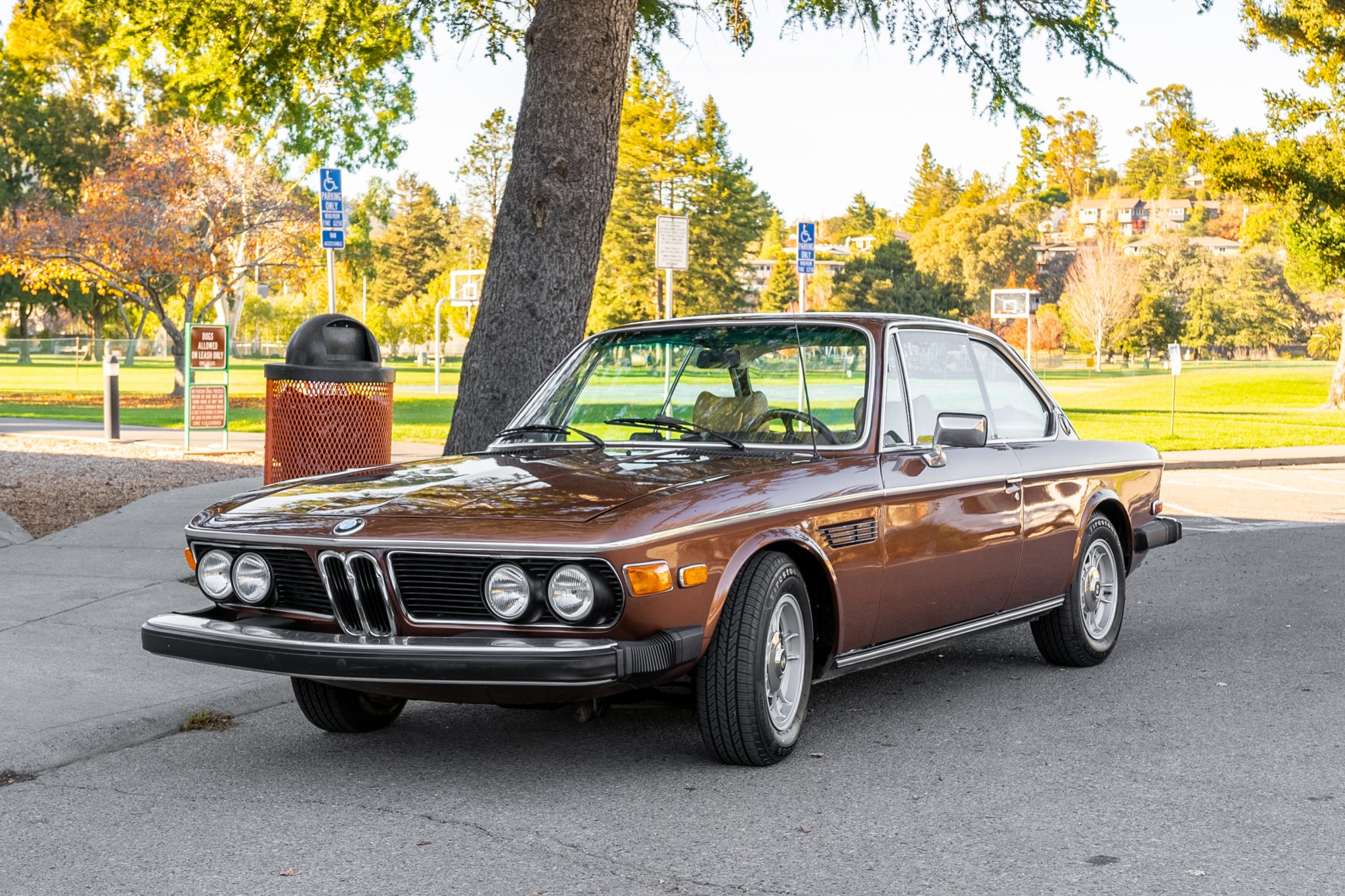 Factory-style 14″ alloy wheels with polished center caps were acquired and refinished during current ownership, and 195/70 Firestone tires were recently mounted and show 2020 date codes. The brake fluid was also replaced in November 2020, and service notes indicate the rear shocks and springs require replacement, and that the power steering gearbox and hydraulic lines are leaking.