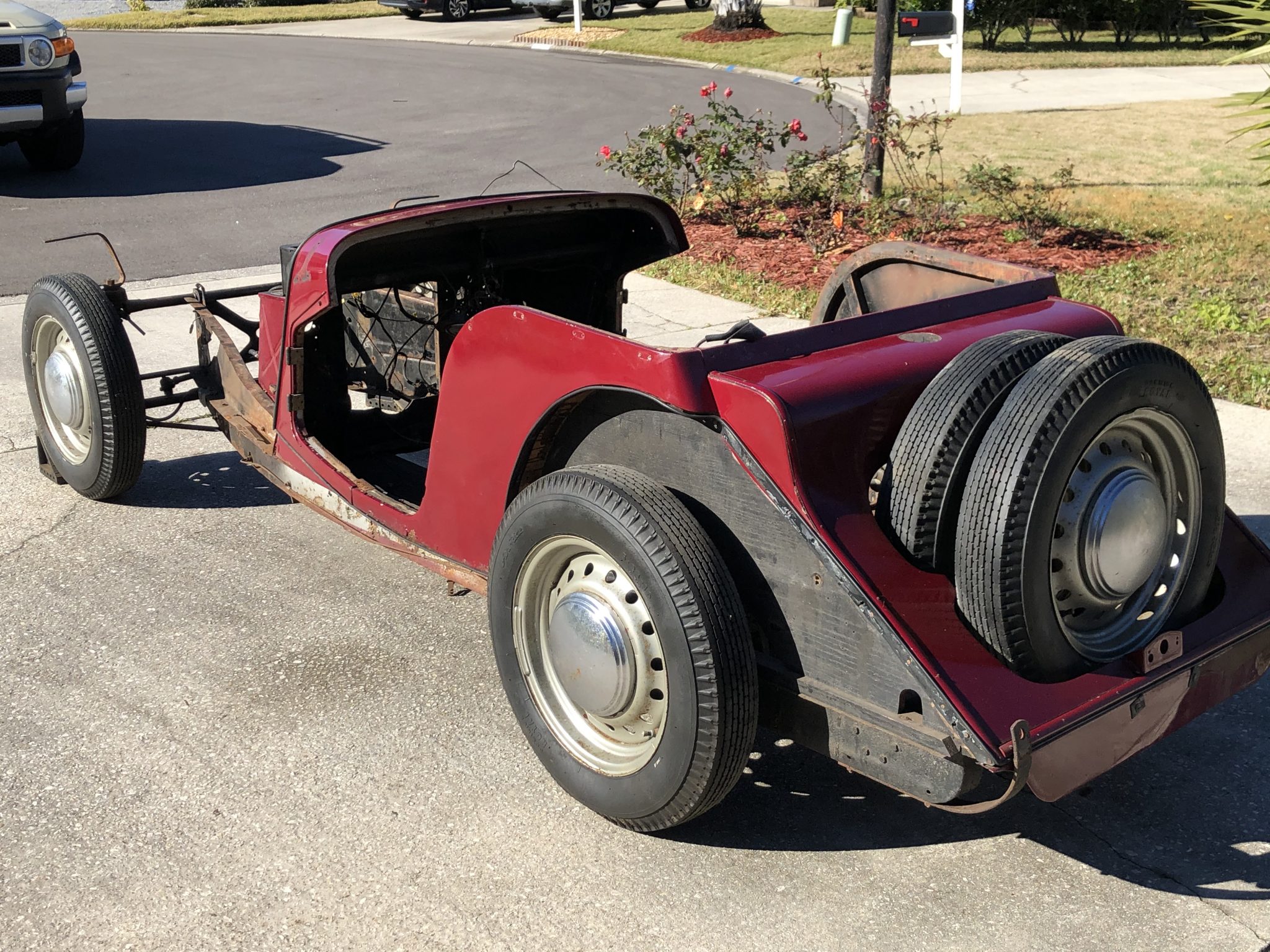 Silver-painted steel wheels show surface wear and corrosion and are mounted with an older set of Dominion Royal radial tires that have visible sidewall cracks. Two matching spare wheels and tires are secured behind the passenger compartment with a Morgan-branded clamp.