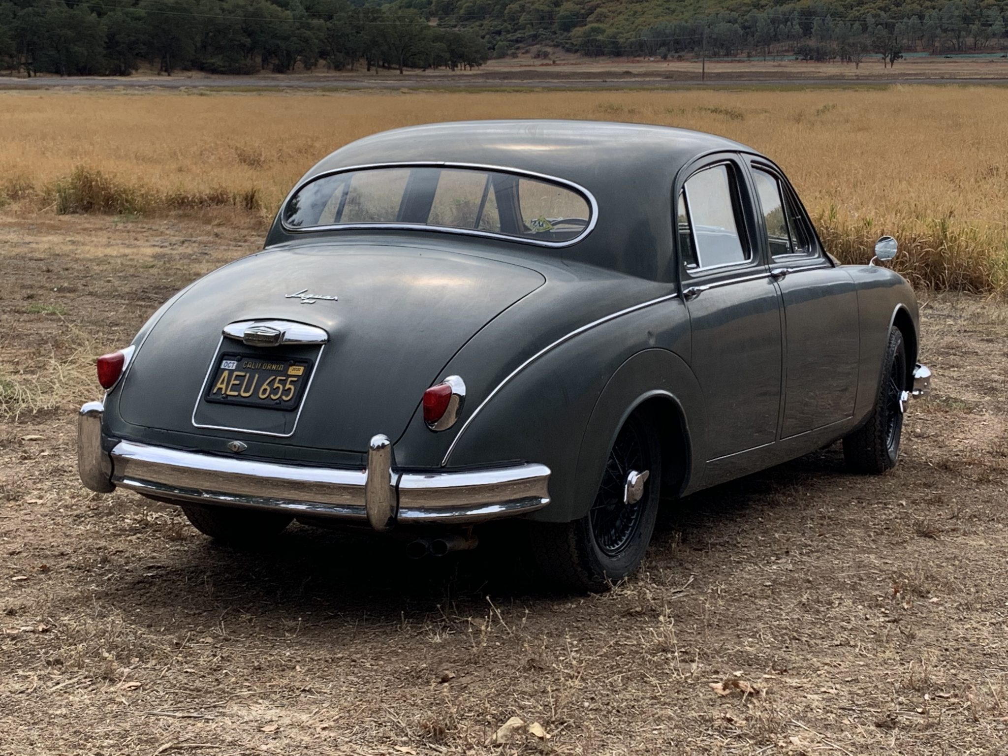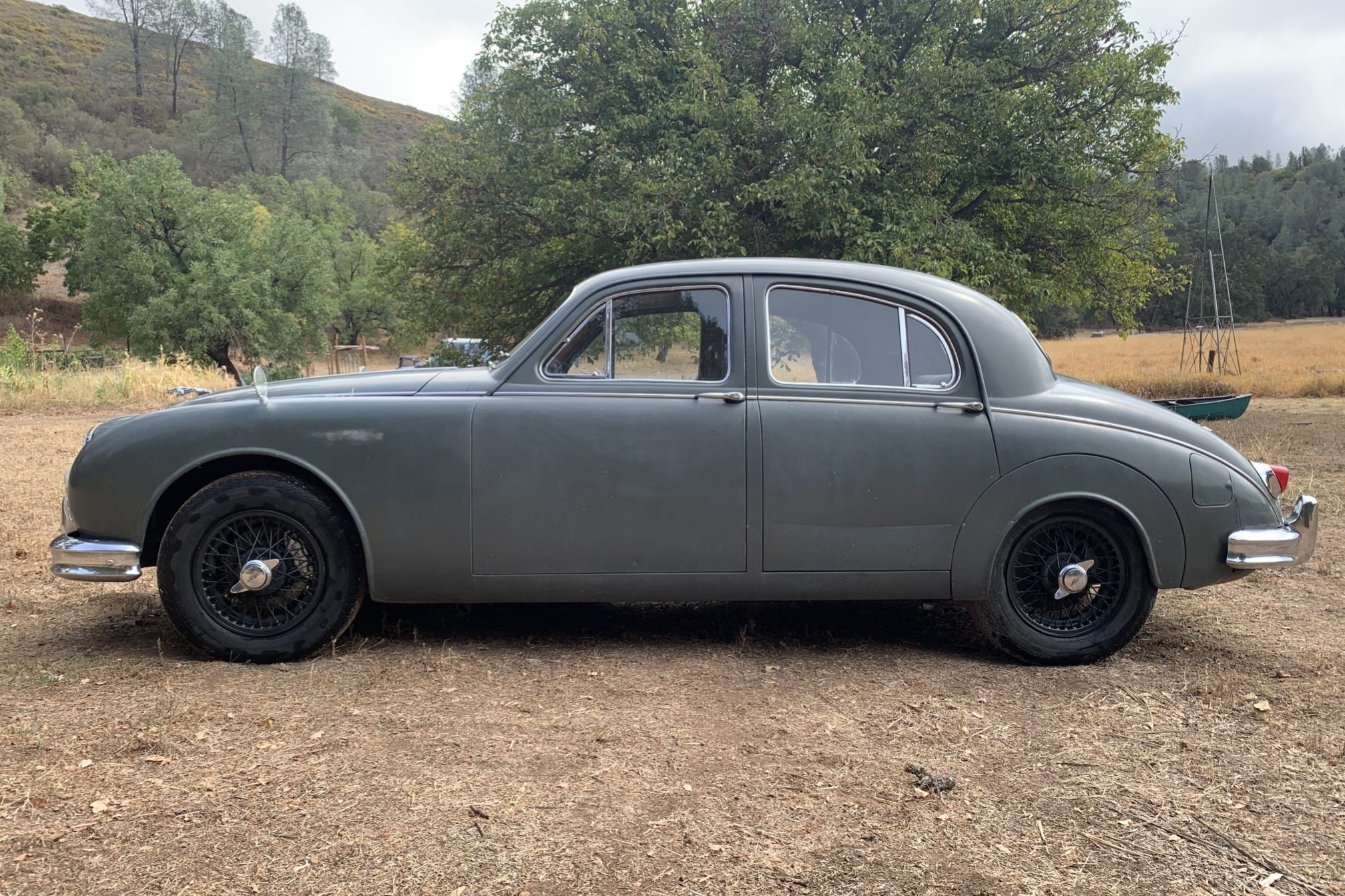 Green-finished 15″ wire wheels wear chrome two-eared knock-off spinners and are mounted with Vredestein Sprint Classic tires that were installed in 2009. The four-wheel disc brakes were overhauled in 2009, and Fossway calipers have been fitted up front.