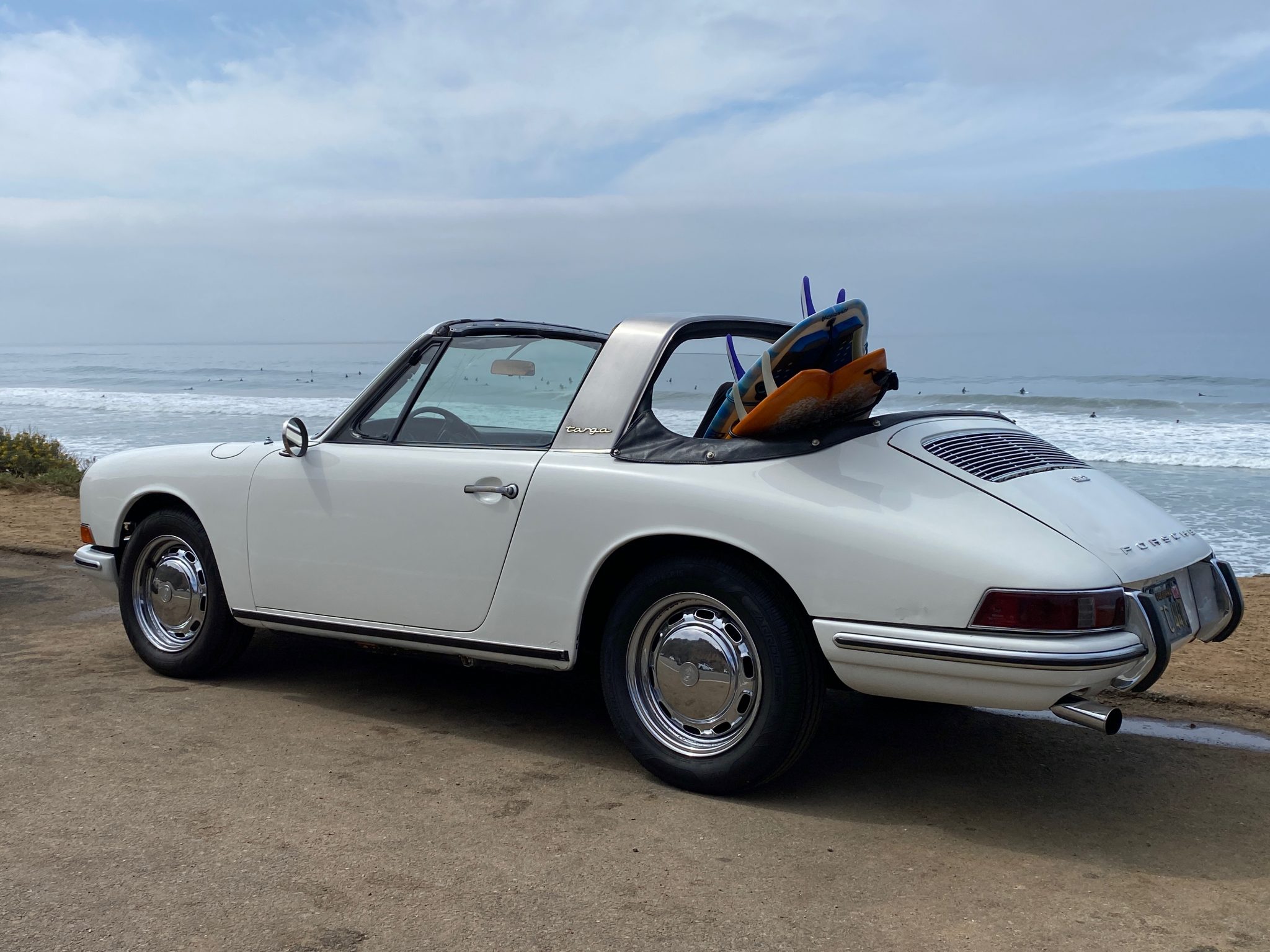 Chrome-finished ventilated 15″ steel wheels wear Porsche-crest hubcaps and exhibit pitting. They were mounted with 185/65 Arroyo Grand Sport 2 tires in early 2021 according to the seller, and the brake master cylinder and lines also have been replaced.