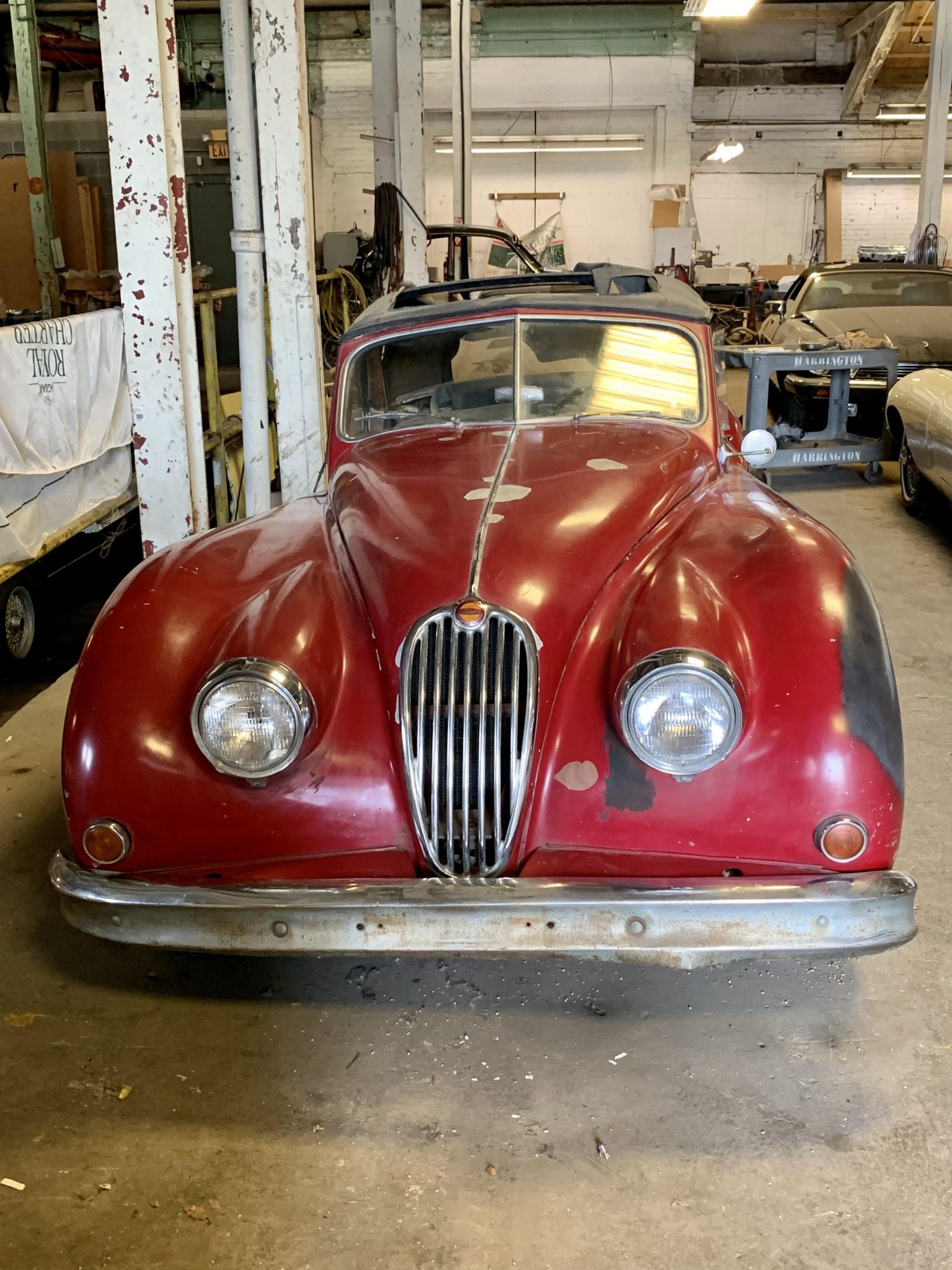 Gray 16″ wire wheels utilize two-ear knockoffs with Jaguar script and are mounted with a mix of 6.00-16 Michelin X and Sears Allstate Guardsman tires. The wheels, brakes, and suspension require attention.