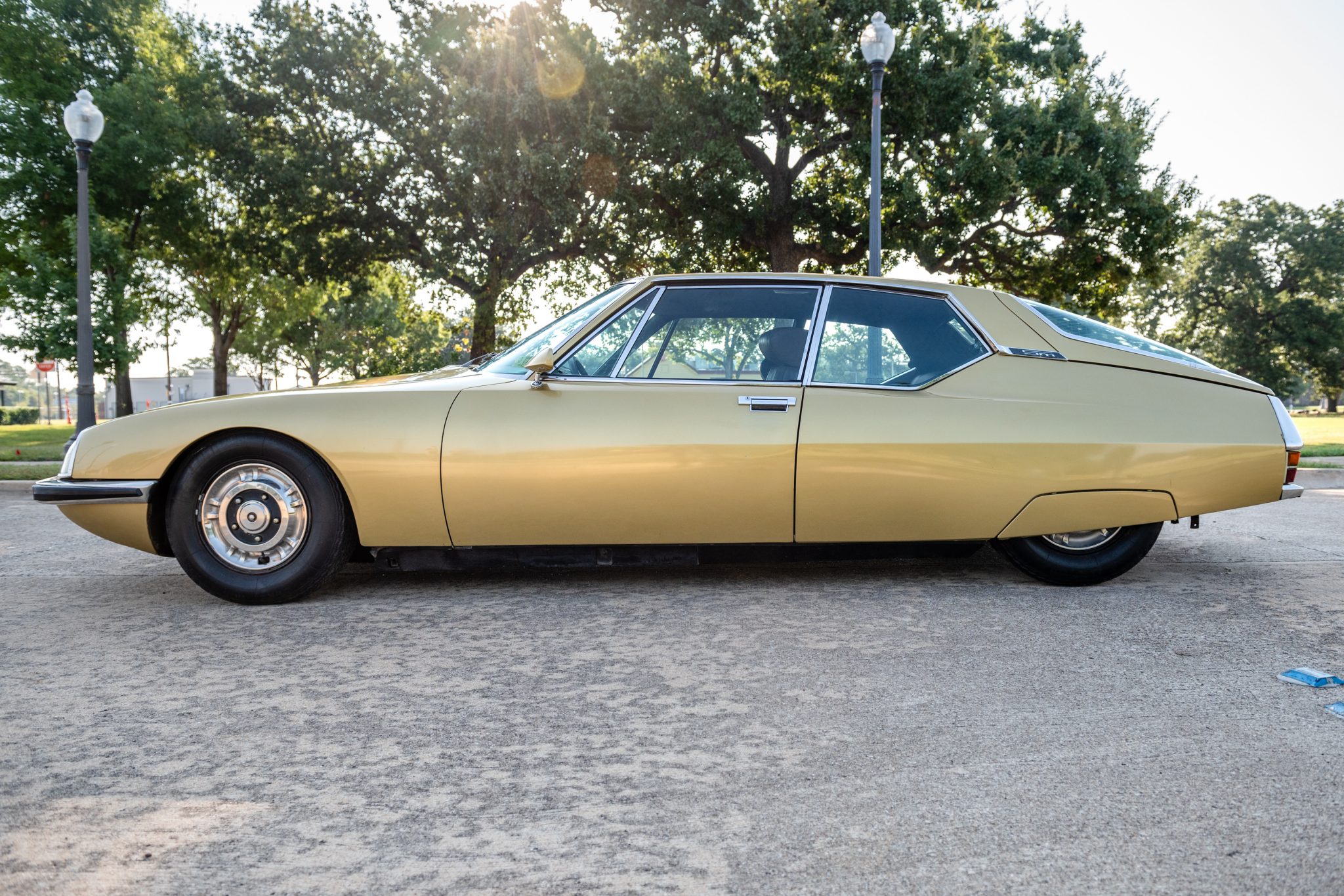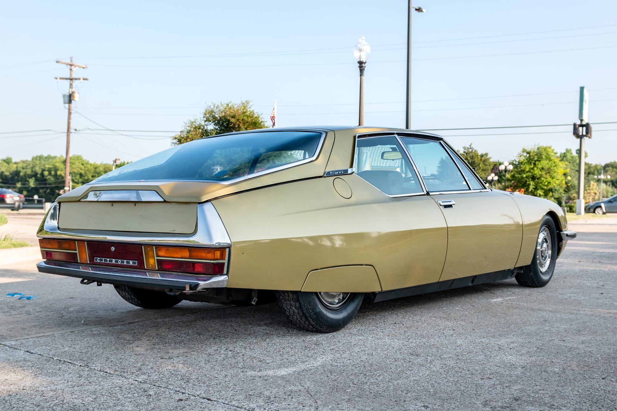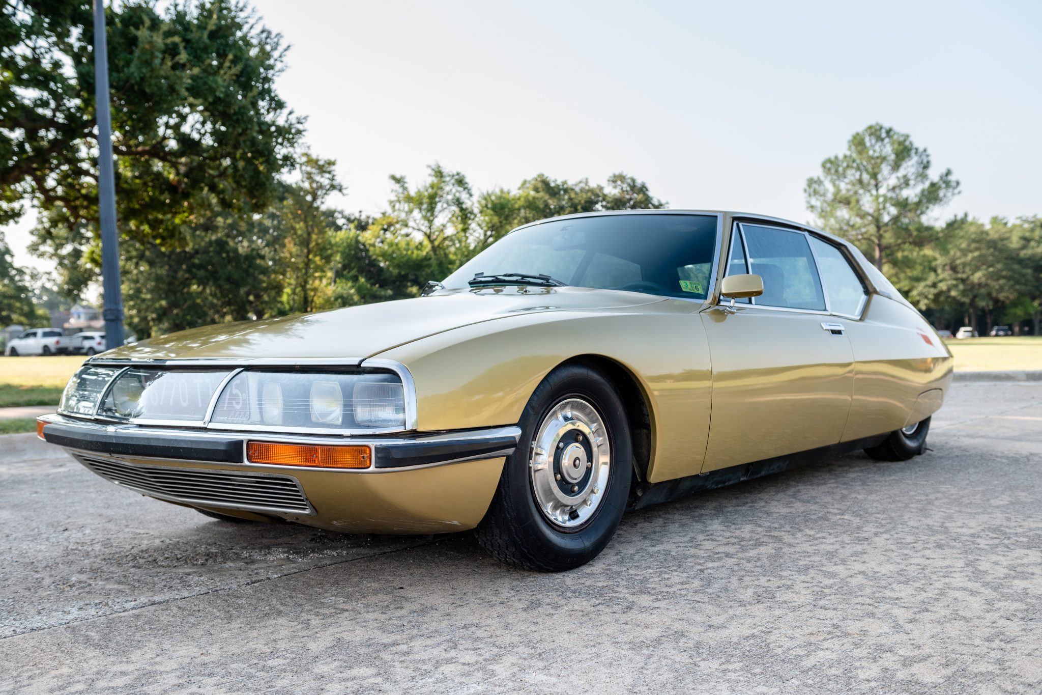 The 15” steel wheels feature polished covers and are mounted with older Michelin tires that show cracking in the sidewalls. The car is equipped with height-adjustable hydro-pneumatic suspension, and a full-size spare is found in the trunk.