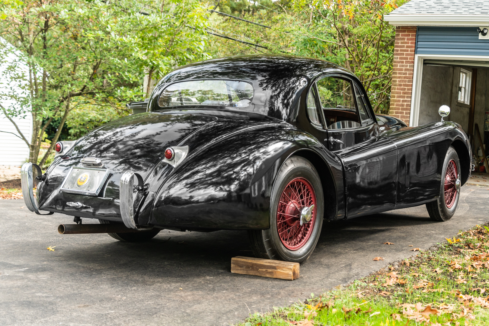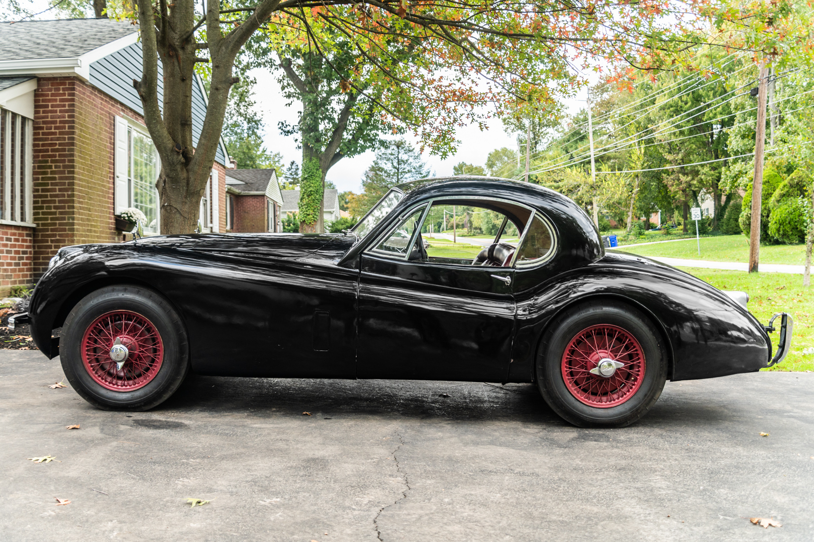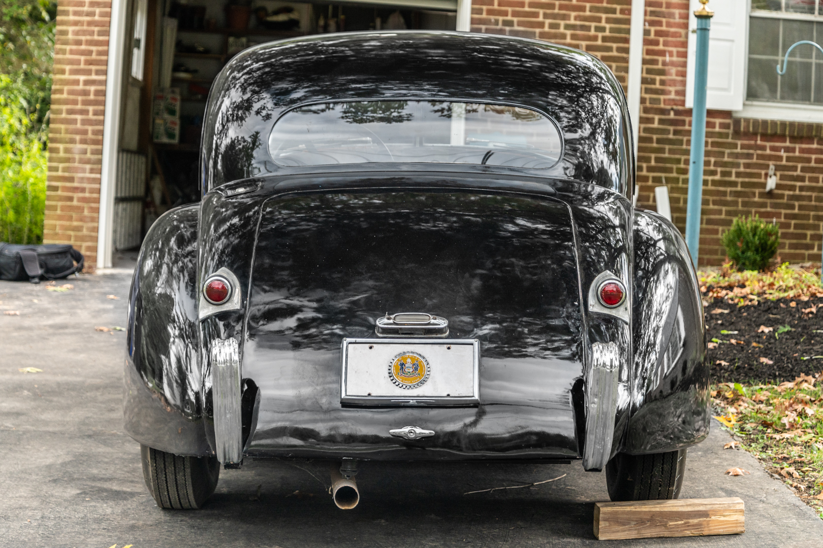 Red 16″ wire-spoke knock-off wheels wear older Monarch tires. Stopping is provided by four-wheel drum brakes, and the seller notes the left front brake is seized. A spare tire is mounted in the trunk.