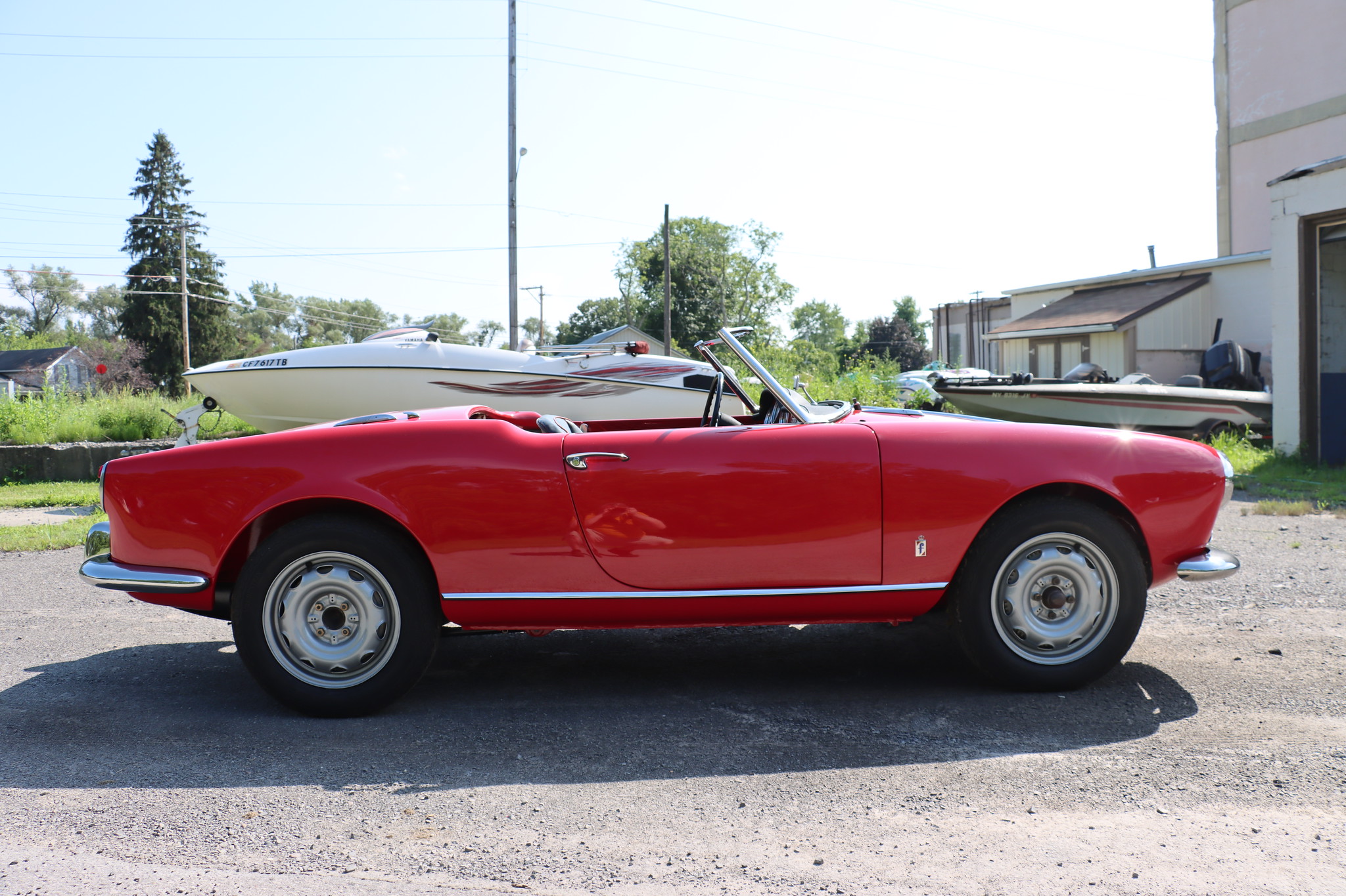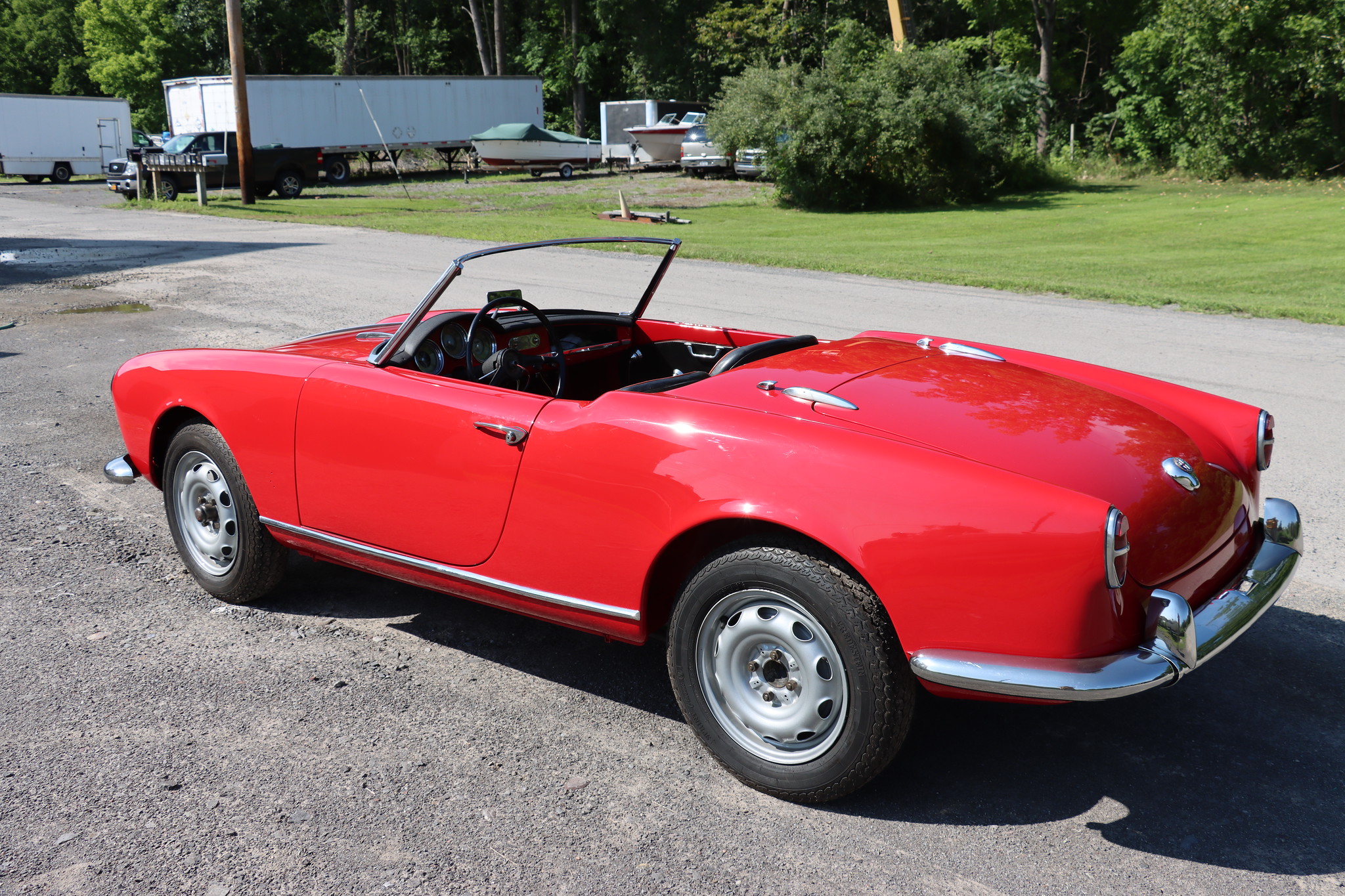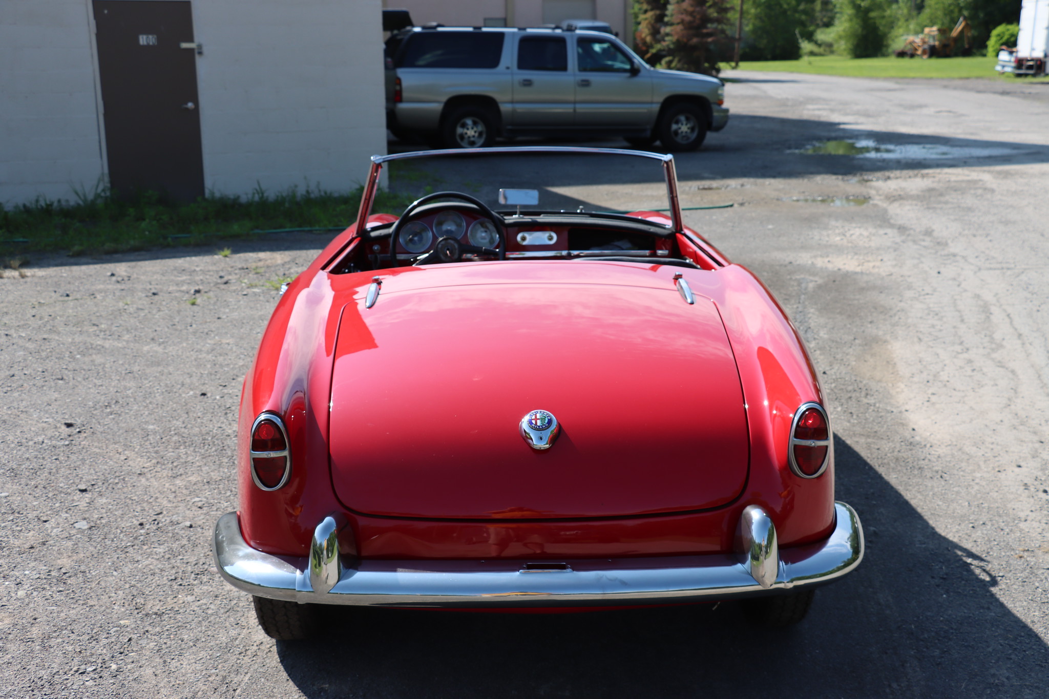 Refurbished 15″ wheels are painted silver and mounted with Vredestein Sprint Classic tires showing 2010 date codes. A trunk-mounted spare is included along with a set of five Alfa-crested chrome hubcaps. The tie-rod ends have been replaced, and Koni adjustable shocks with sport springs are installed all around.