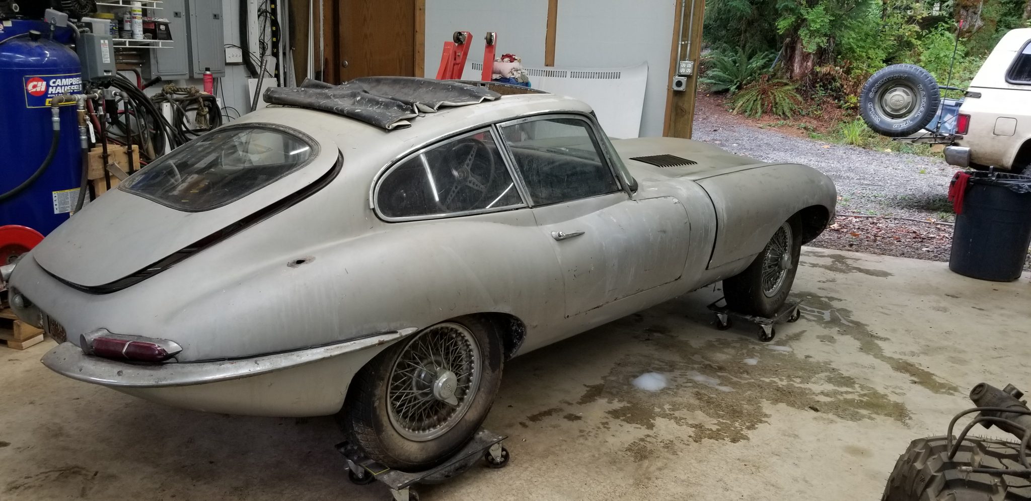 Wire wheels are mounted with two-eared knockoff spinners and wear older tires. A spare is located in the trunk.